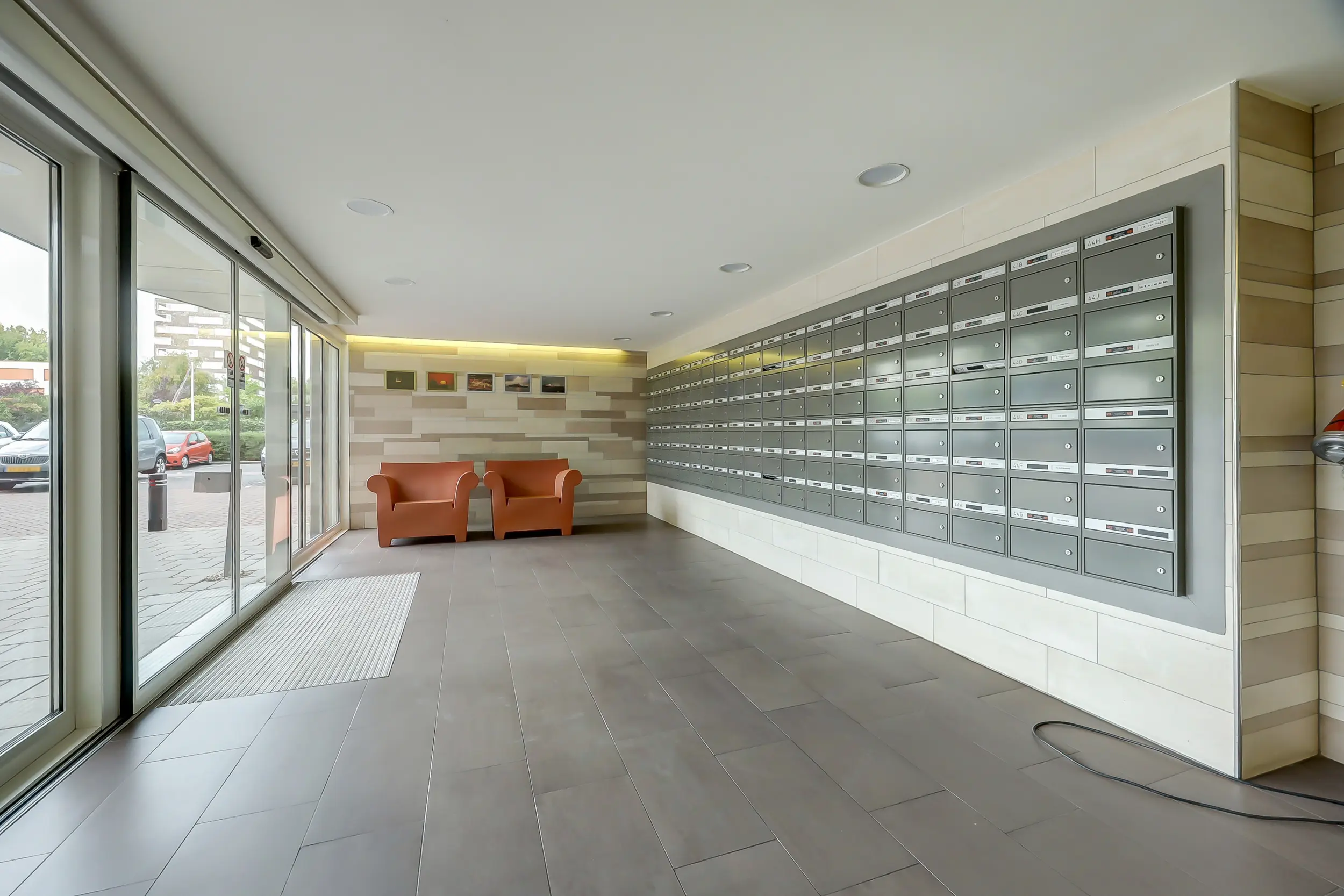 Centrale hal met videophone, toegang tot de bergingen en liften.