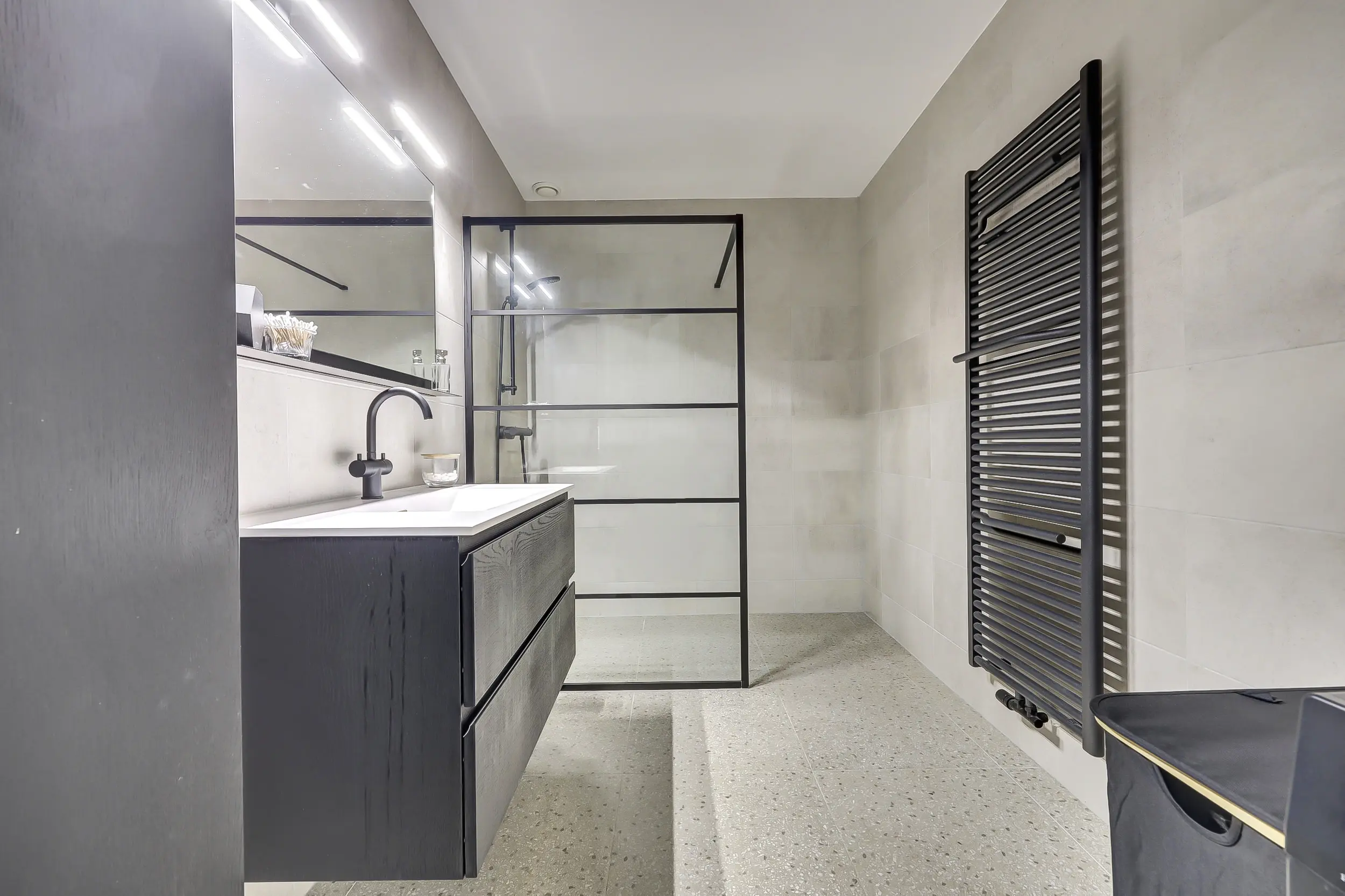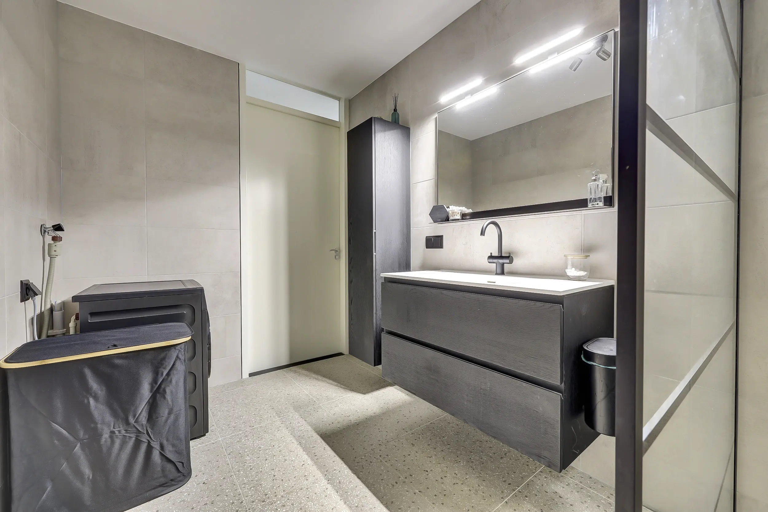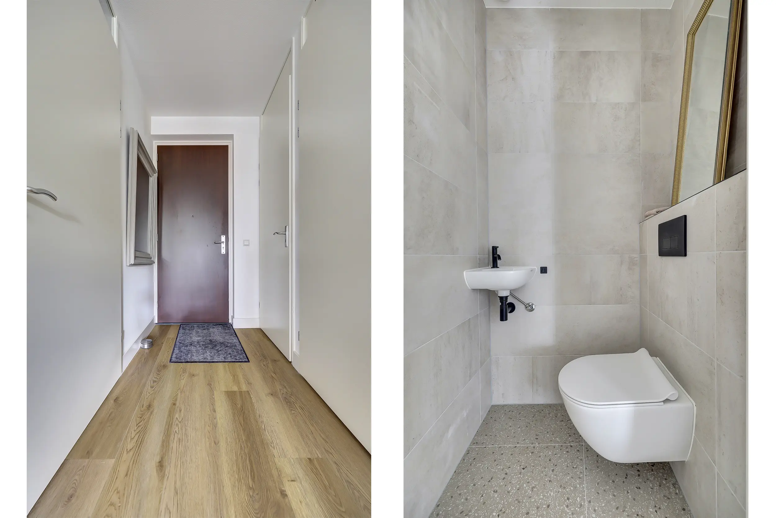 Hal met toegang tot vernieuwd toilet. De in 2023 vernieuwde badkamer is voorzien van een inlooppdouche en modern wastafelmeubel.