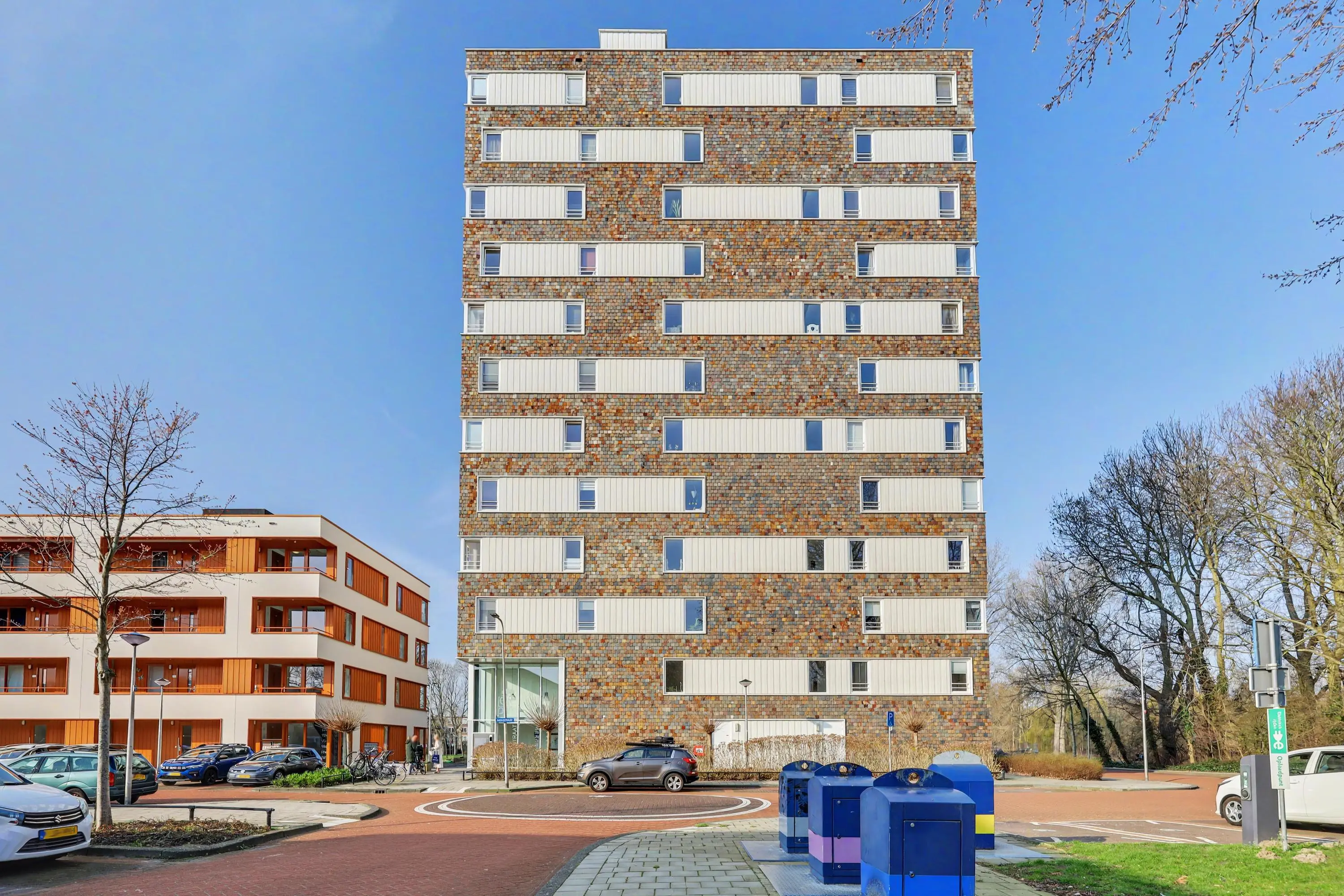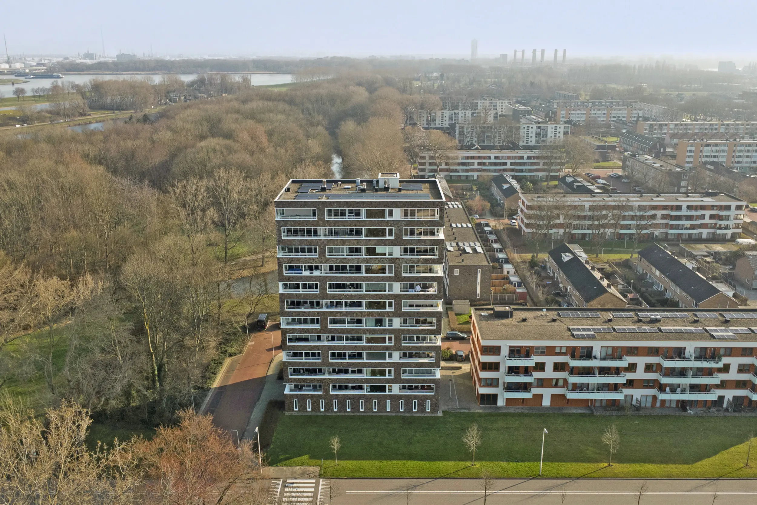 Aan de rand van het Hartelpark ligt dit schitterende appartementencomplex met leistenen gevelbekleding.