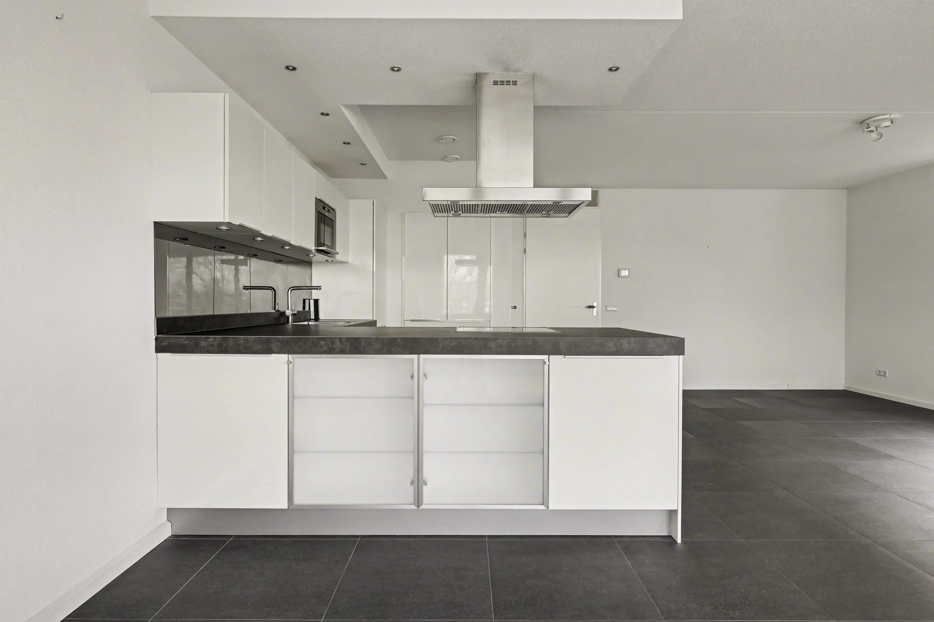 De nette open keuken keuken is uitgevoerd met inbouwapparatuur als kookplaat, oven, magnetron, afzuigkap en koel- vriescombinatie.