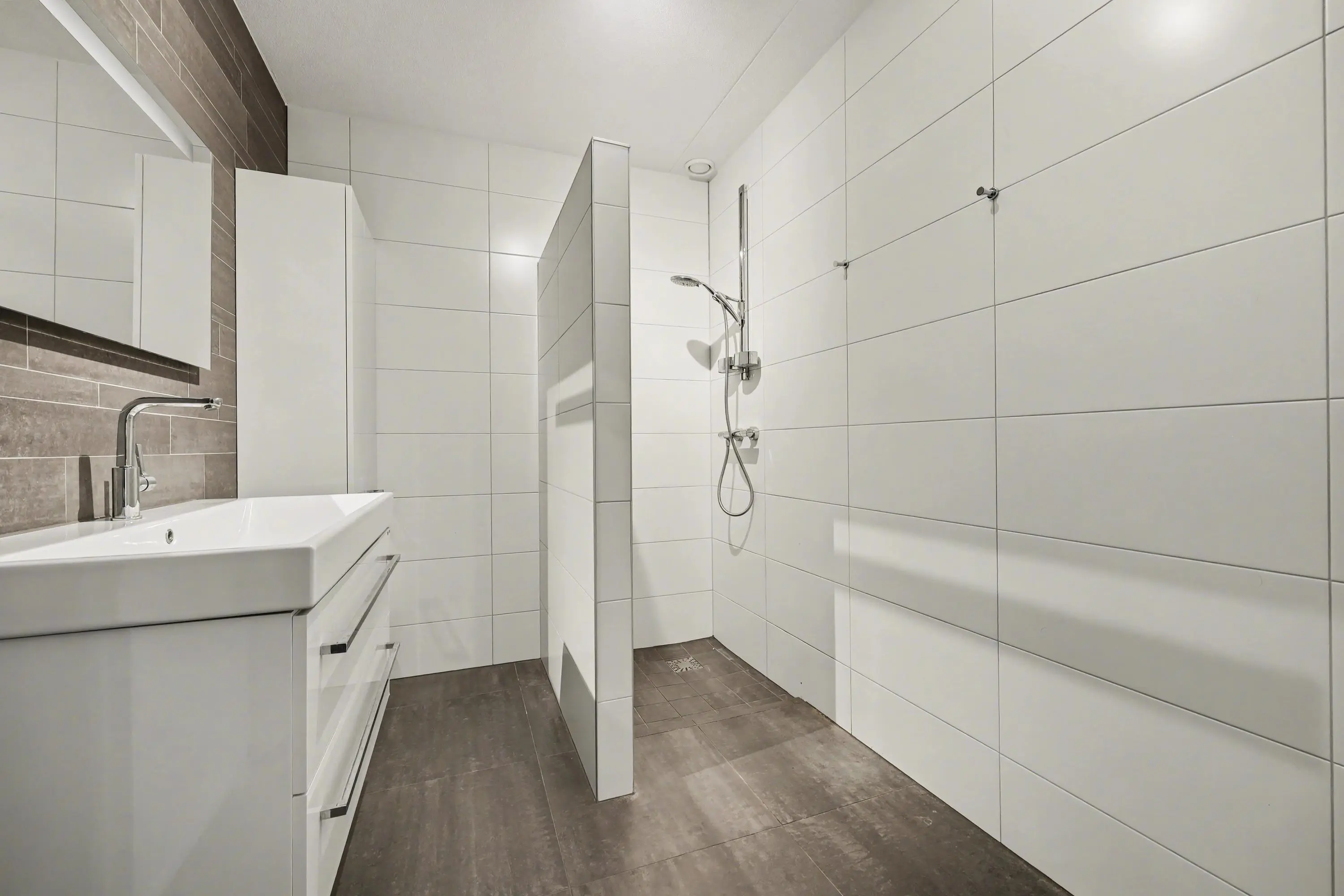 De badkamer is geheel betegeld en uitgevoerd met wastafelmeubel en inloopdouche, ter plaatse van de hal tref je het toilet en een bergkast. Het appartement heeft totaal 2 slaapkamers