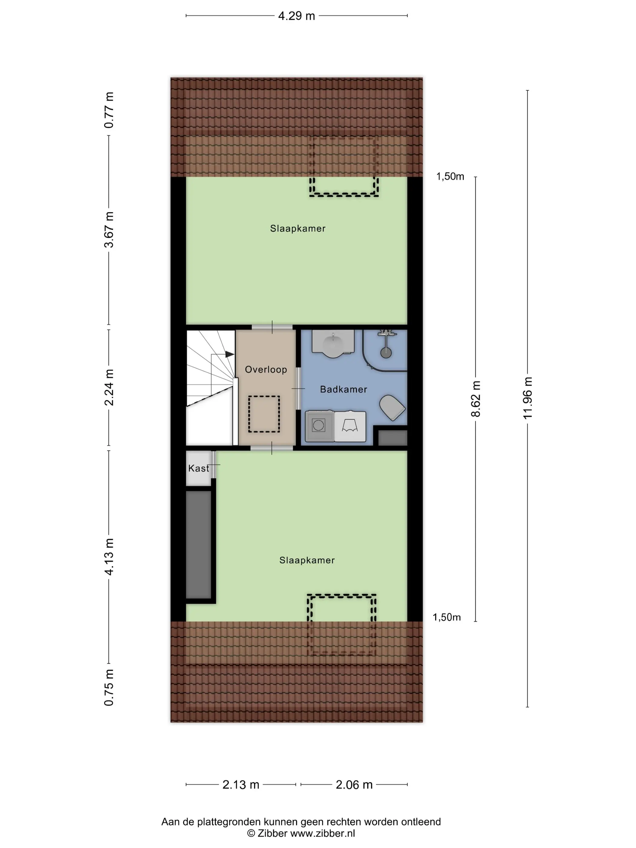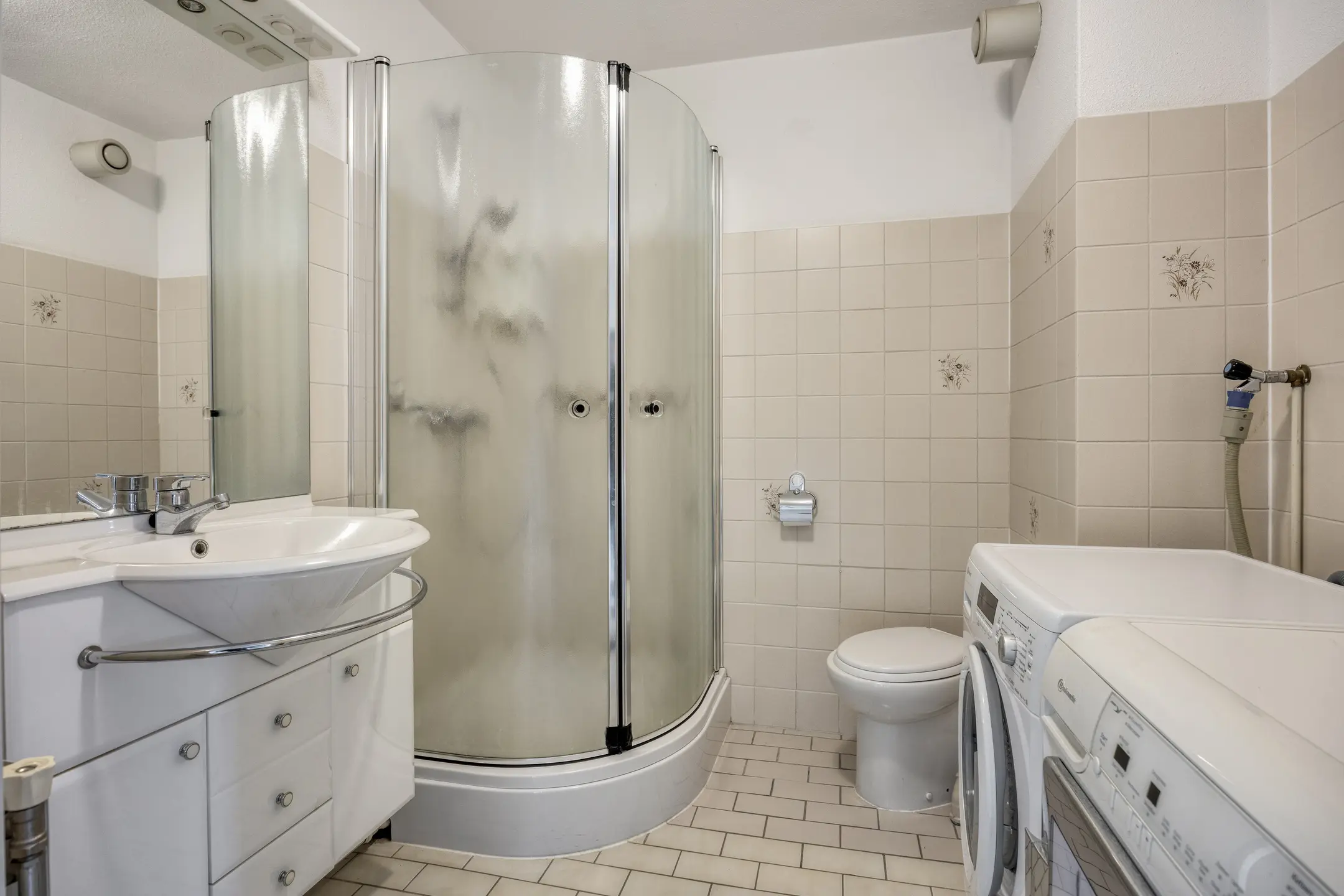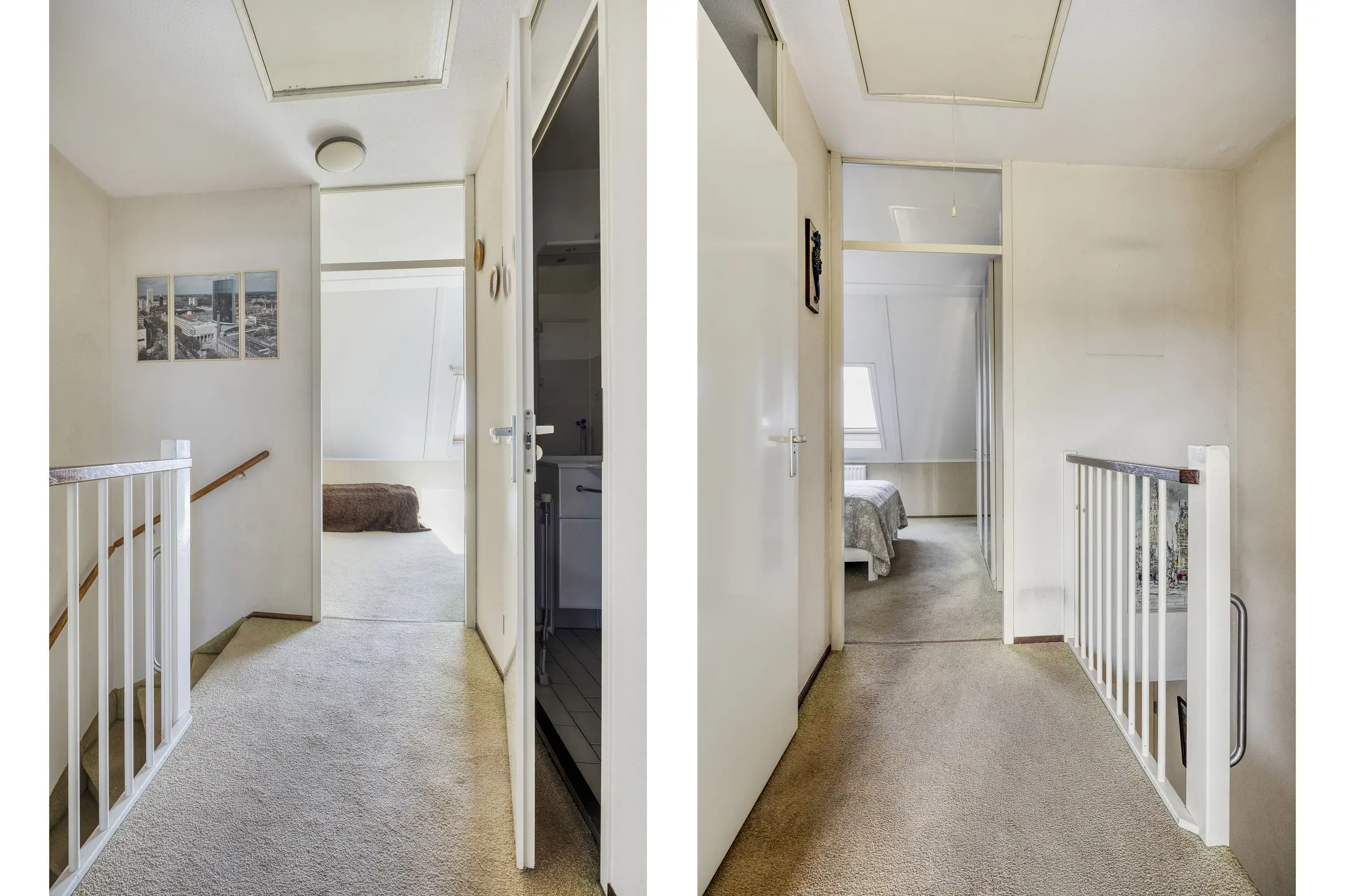 De overloop geeft toegang tot de twee slaapkamers aan de voor- en achterzijde van de woning. De badkamer is uitgerust met een toilet, douche, wastafel en wasmachine aansluiting.