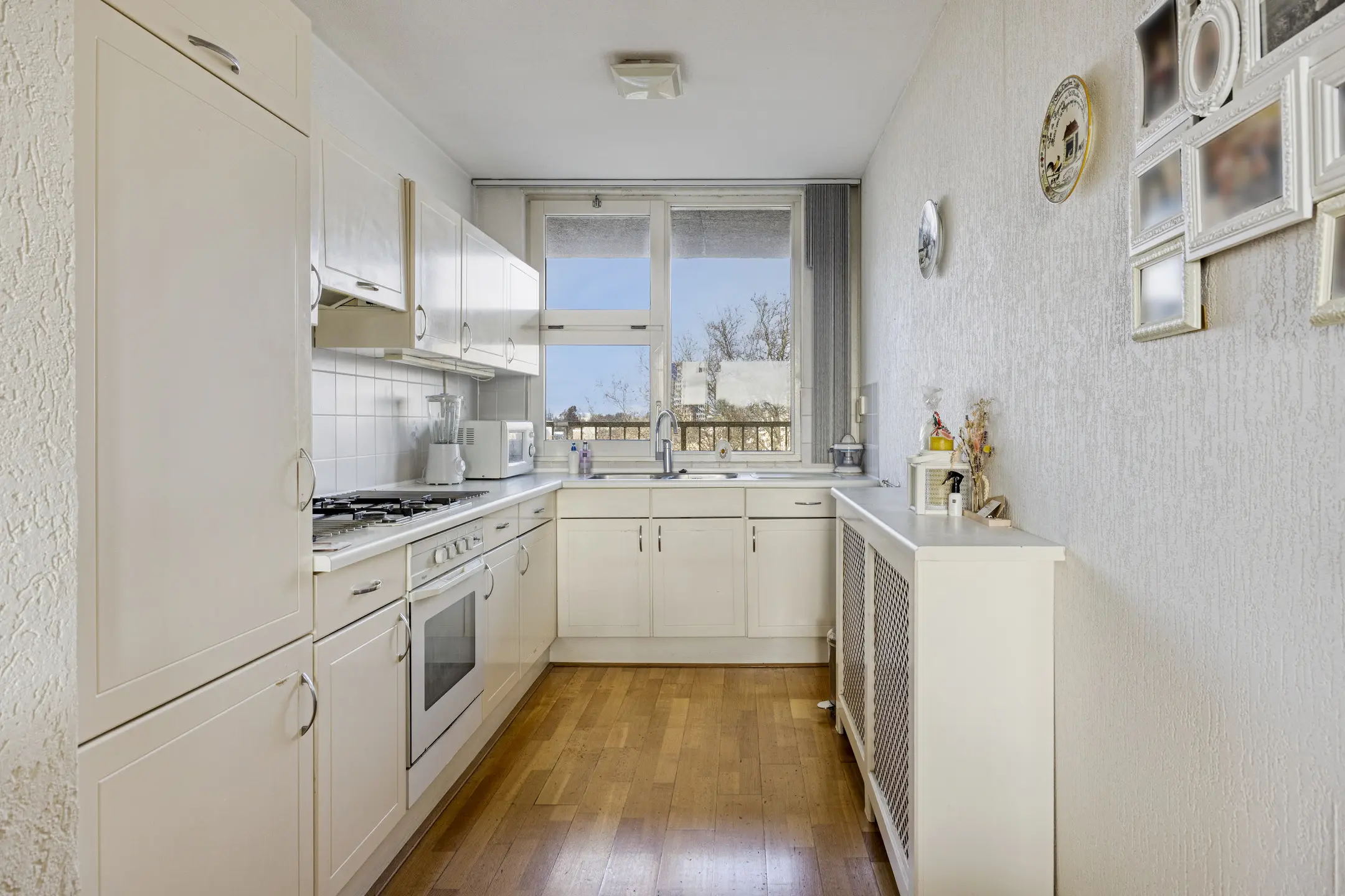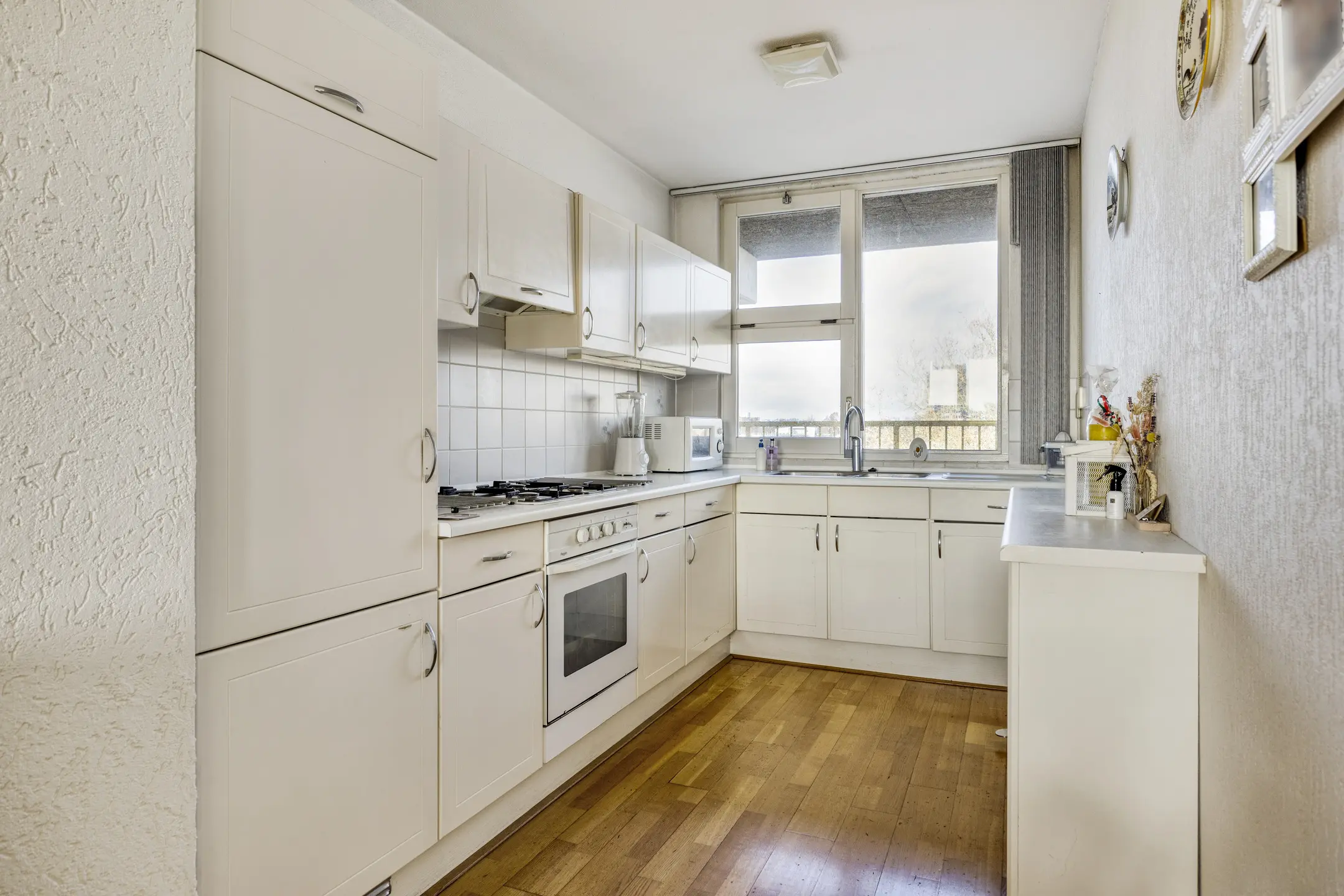 Entreehal die toegang geeft tot de afgesloten toiletruimte, trapopgang en de woonkamer. De woonkamer geniet veel natuurlijk licht door de grote ramen en heeft een nette afwerking. De open keuken in praktische L-opstelling is van alle gemakken voorzien: een gaskookplaat, afzuigkap, koel-/vriescombinatie en een combi oven/magnetron. Vanuit de woonkamer heeft u toegang tot het balkon met een fantastisch uitzicht!
