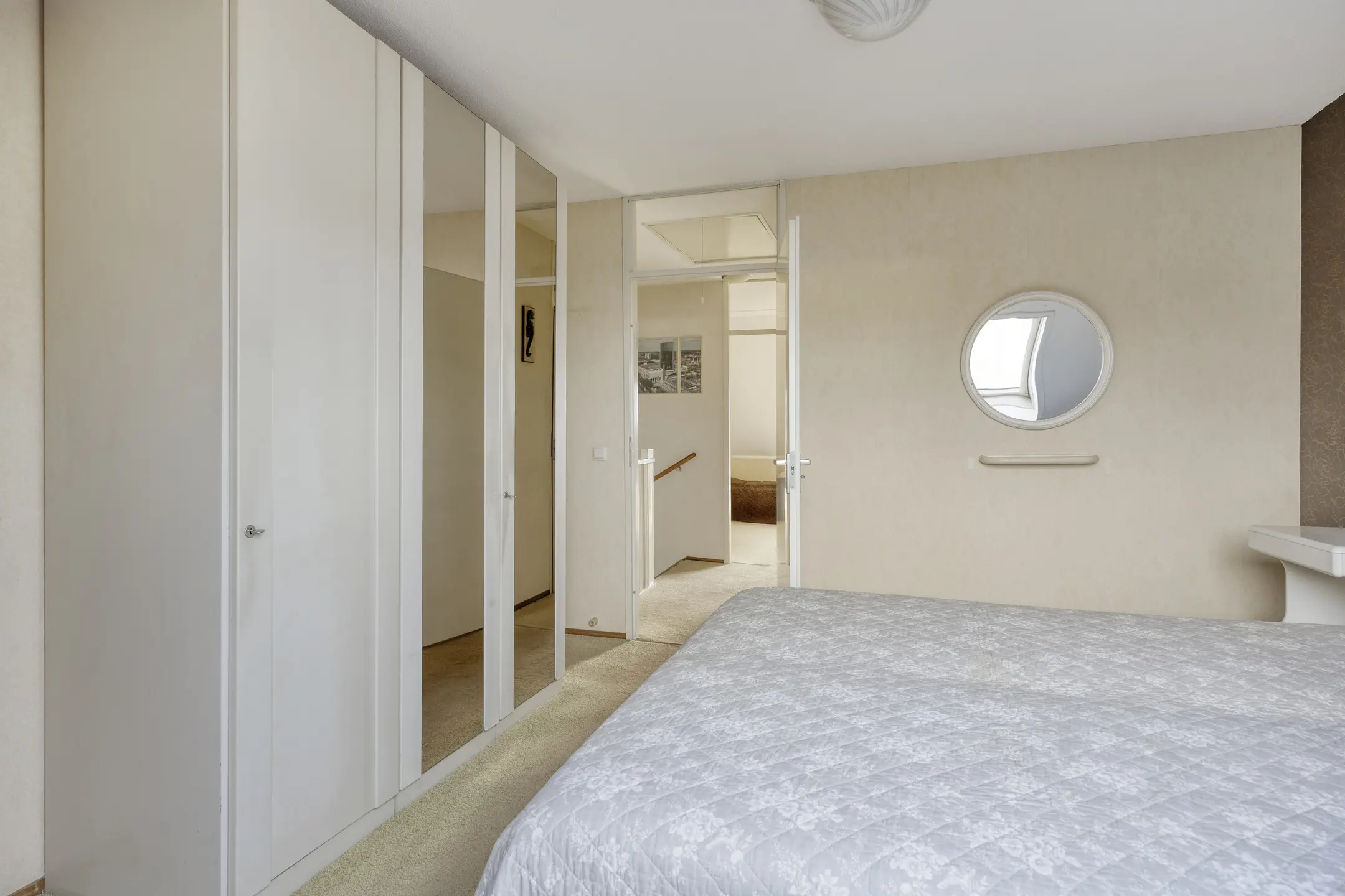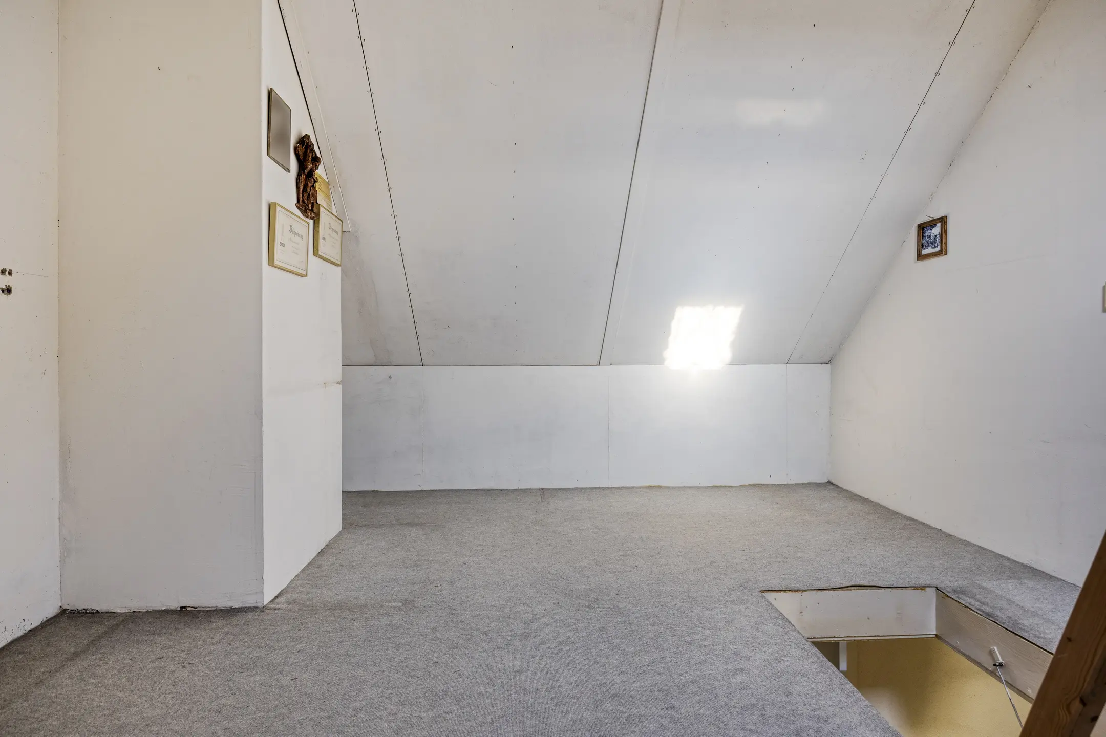 Open zolderkamer met knieschotten voor opbergruimte en dakramen voor voldoende daglicht om deze kamer als werk- of slaapkamer te gebruiken.