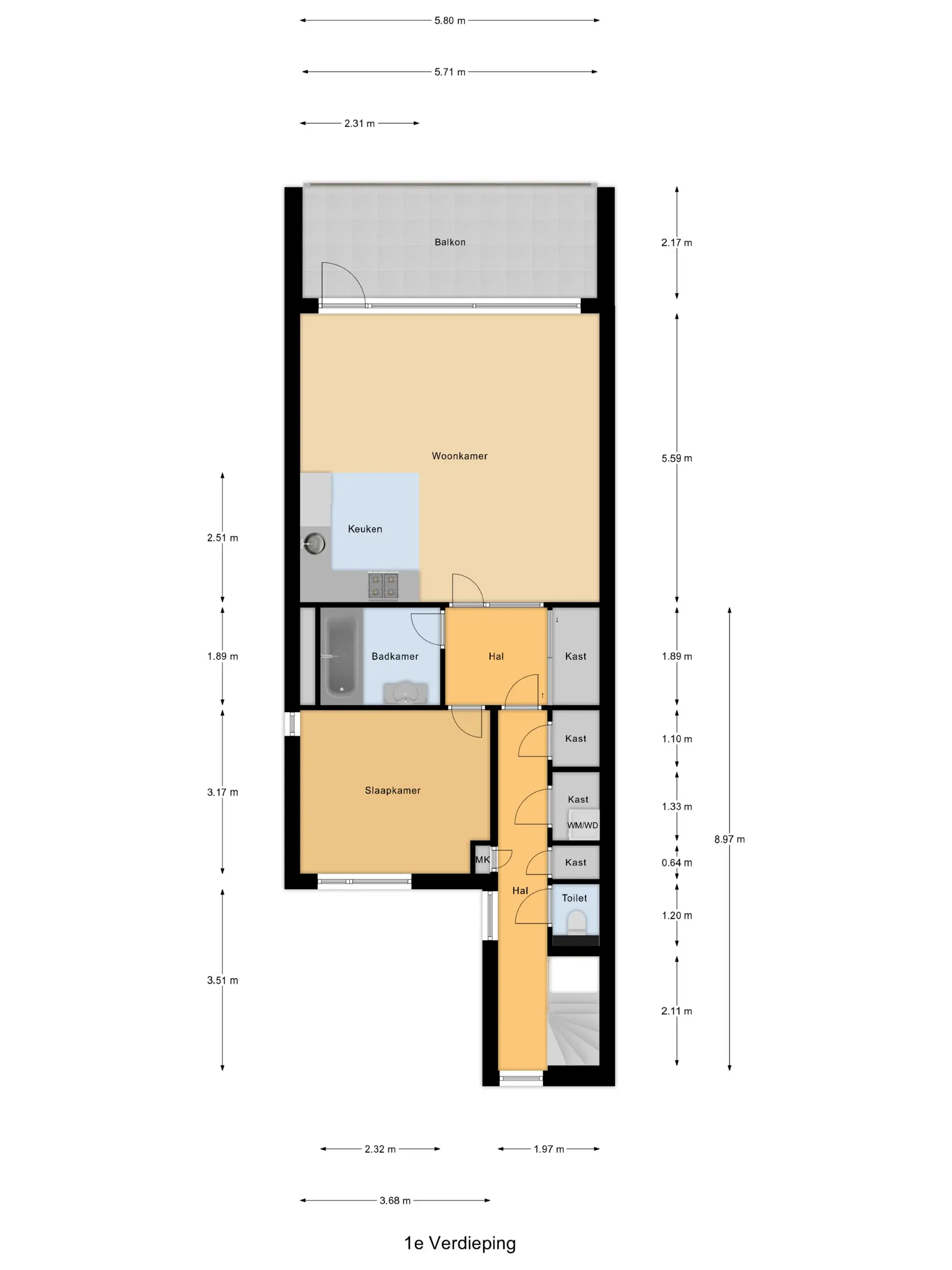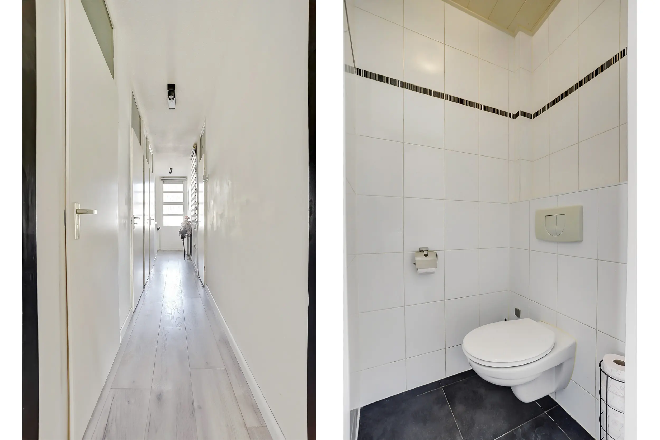 Overloop met veel kastruimte, toilet en meterkast.