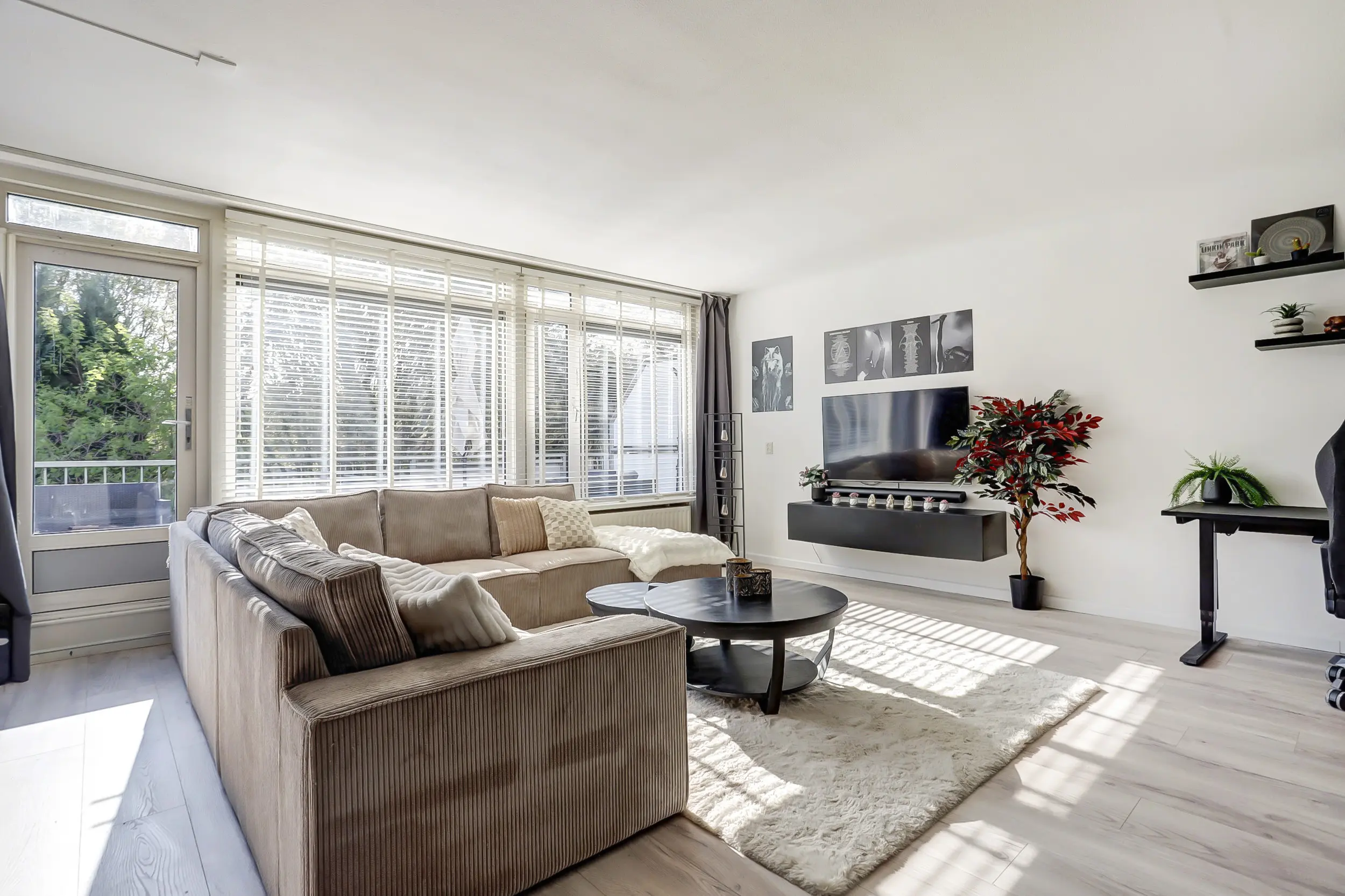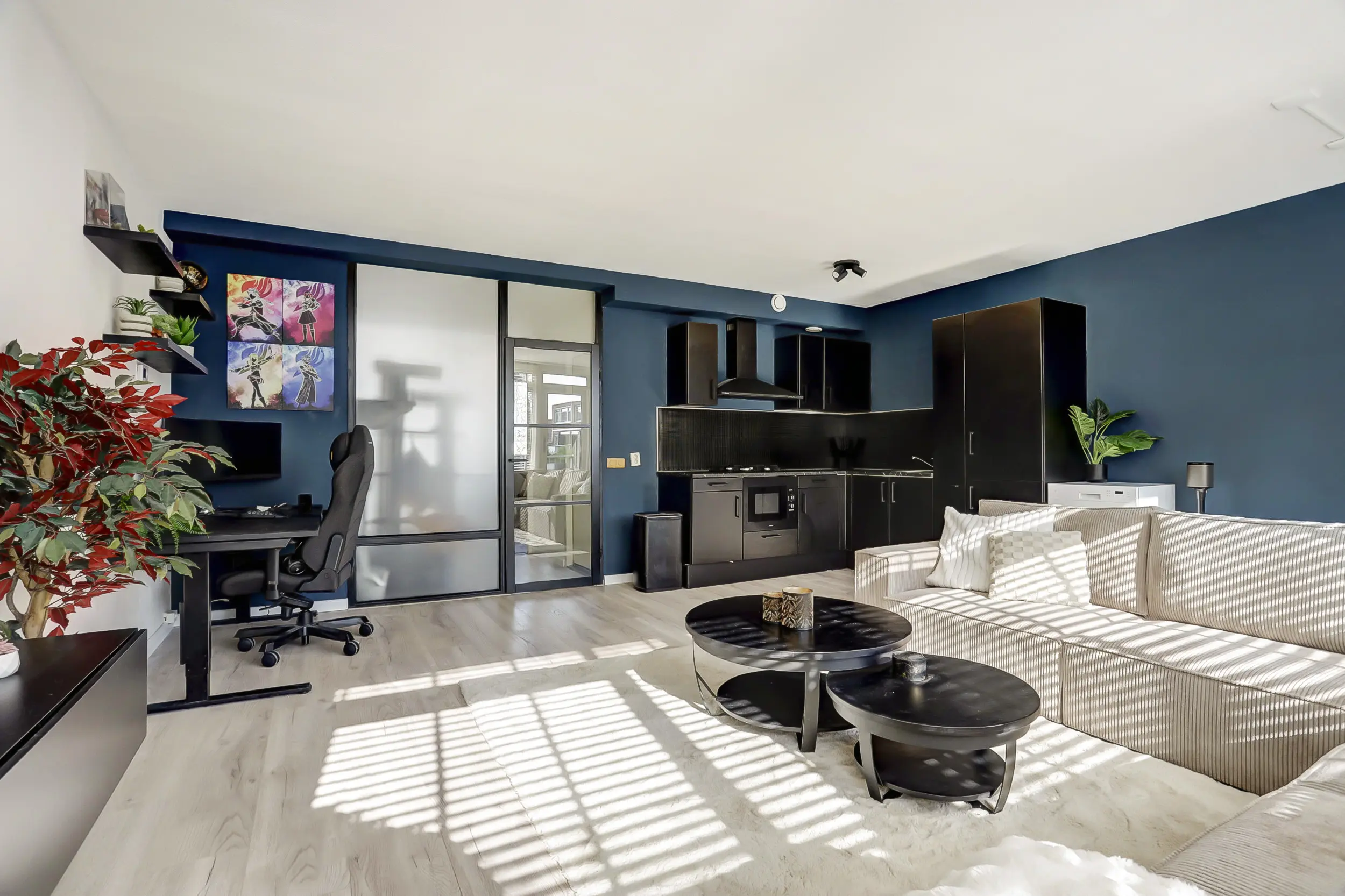 Via een tweede matzwarte deur met grote raampartijen treedt je de woonkamer binnen en ben je direct verrast door de genereuze lichtinval vanaf het dakterras.