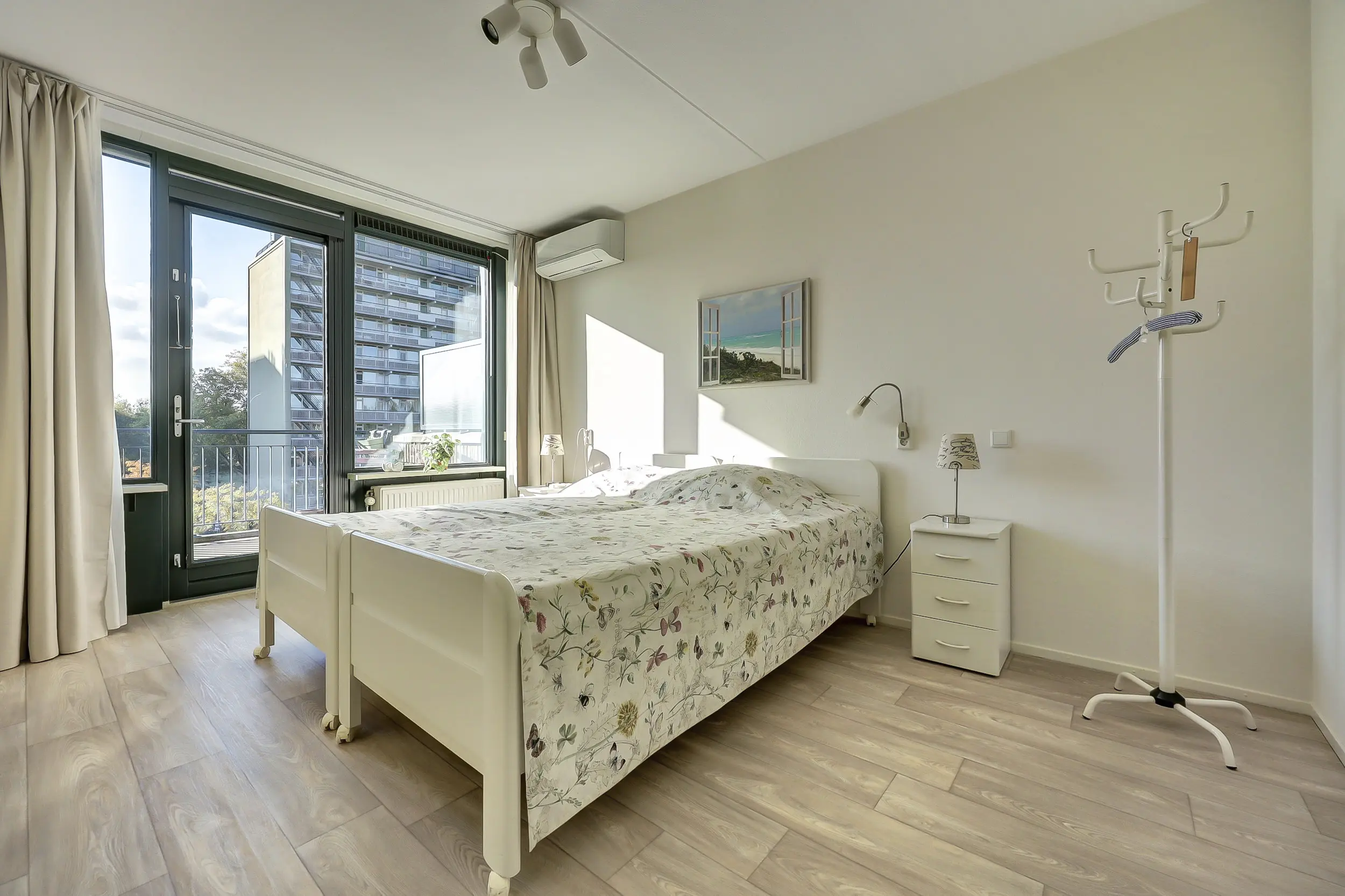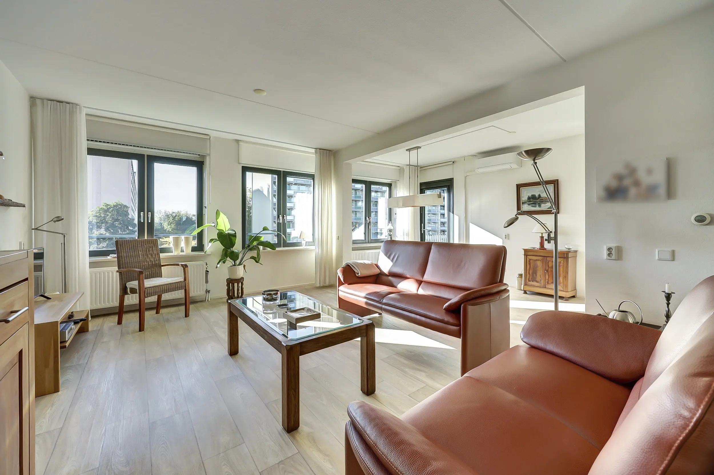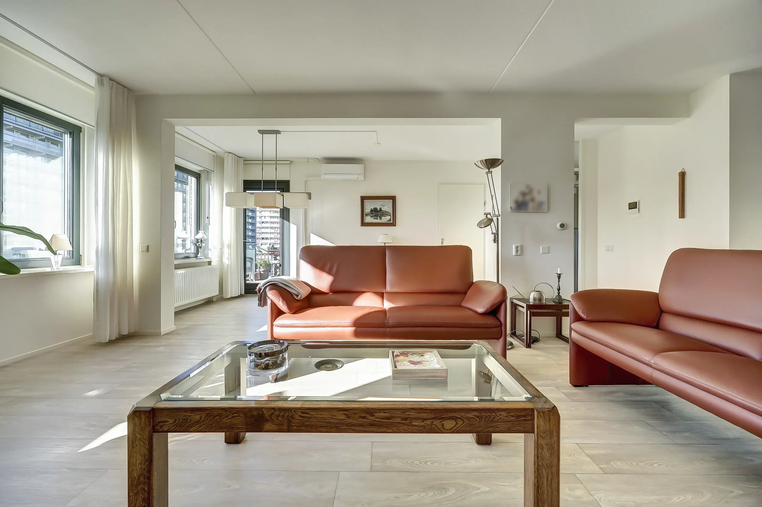 De woonkamer ligt aan de voorzijde van het gebouw en heeft dankzij de gunstige ligging en grote raampartijen veel natuurlijke lichtinval. Oorspronkelijk bestond deze ruimte uit twee kamers, waardoor het eenvoudig mogelijk is om weer een extra slaapkamer te realiseren. Vanuit de woonkamer is er toegang tot het zonnige balkon met vrij uitzicht. Tevens is de woonkamer voorzien van elektrisch bediende zonneschermen, wat zorgt voor extra comfort tijdens zonnige dagen.