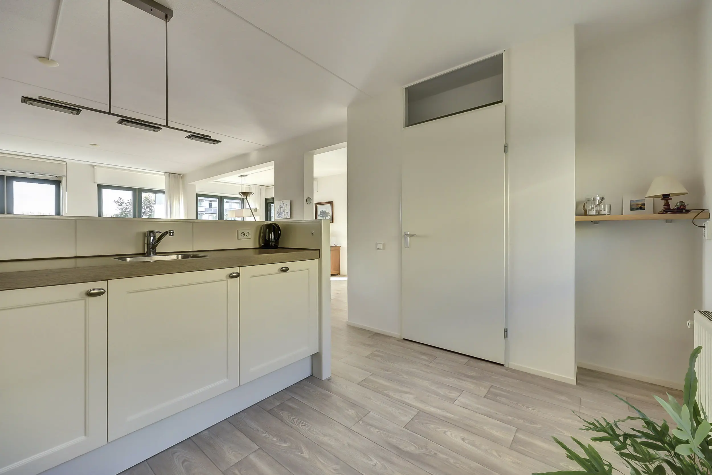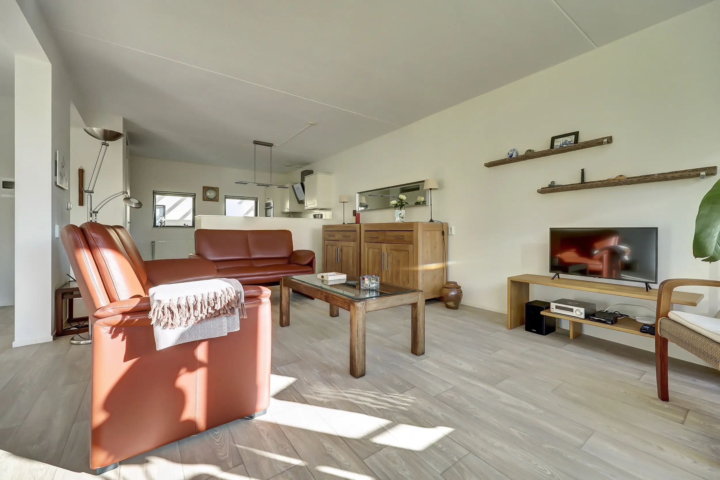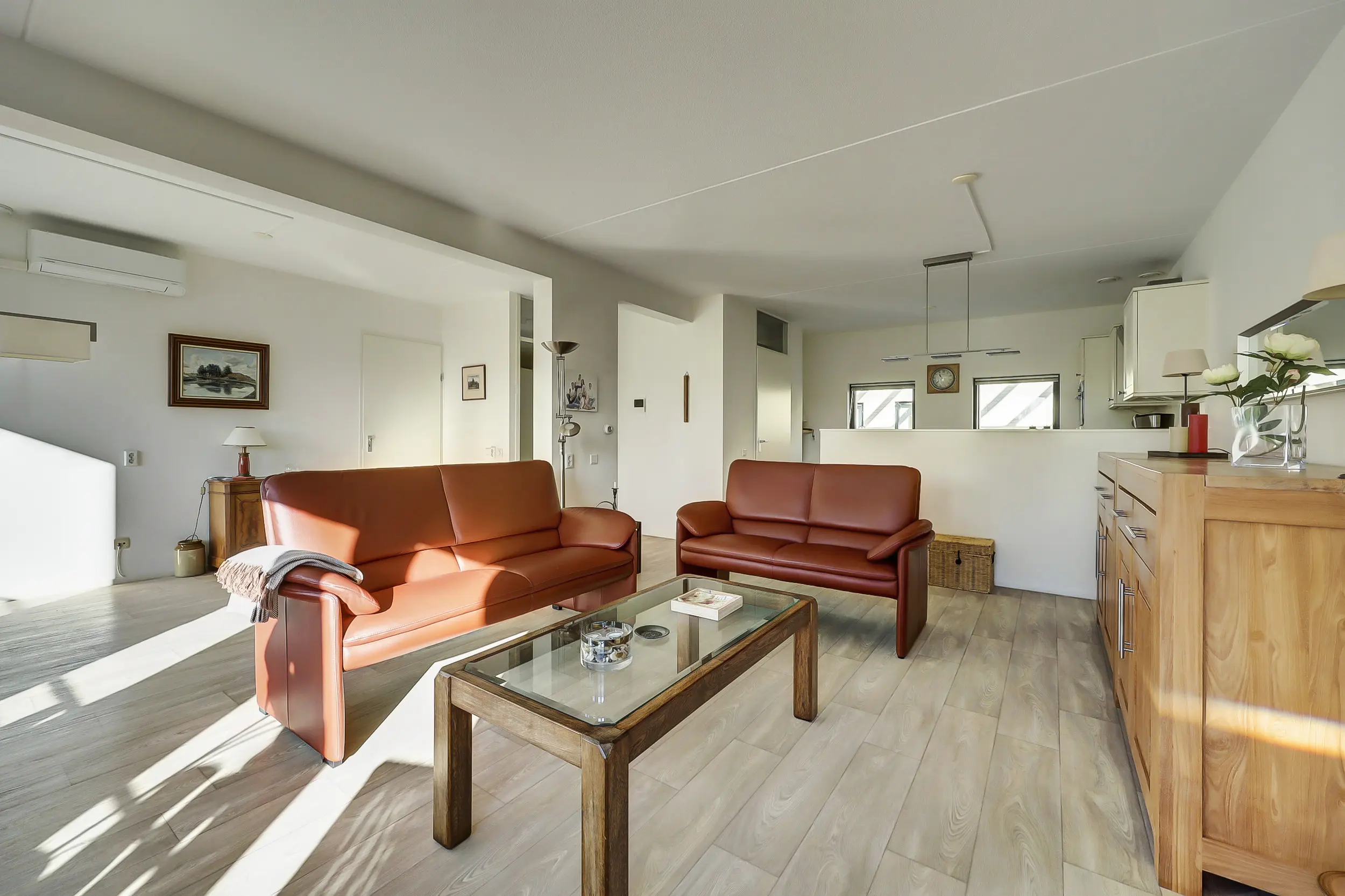 De woonkamer ligt aan de voorzijde van het gebouw en heeft dankzij de gunstige ligging en grote raampartijen veel natuurlijke lichtinval. Oorspronkelijk bestond deze ruimte uit twee kamers, waardoor het eenvoudig mogelijk is om weer een extra slaapkamer te realiseren. Vanuit de woonkamer is er toegang tot het zonnige balkon met vrij uitzicht. Tevens is de woonkamer voorzien van elektrisch bediende zonneschermen, wat zorgt voor extra comfort tijdens zonnige dagen.