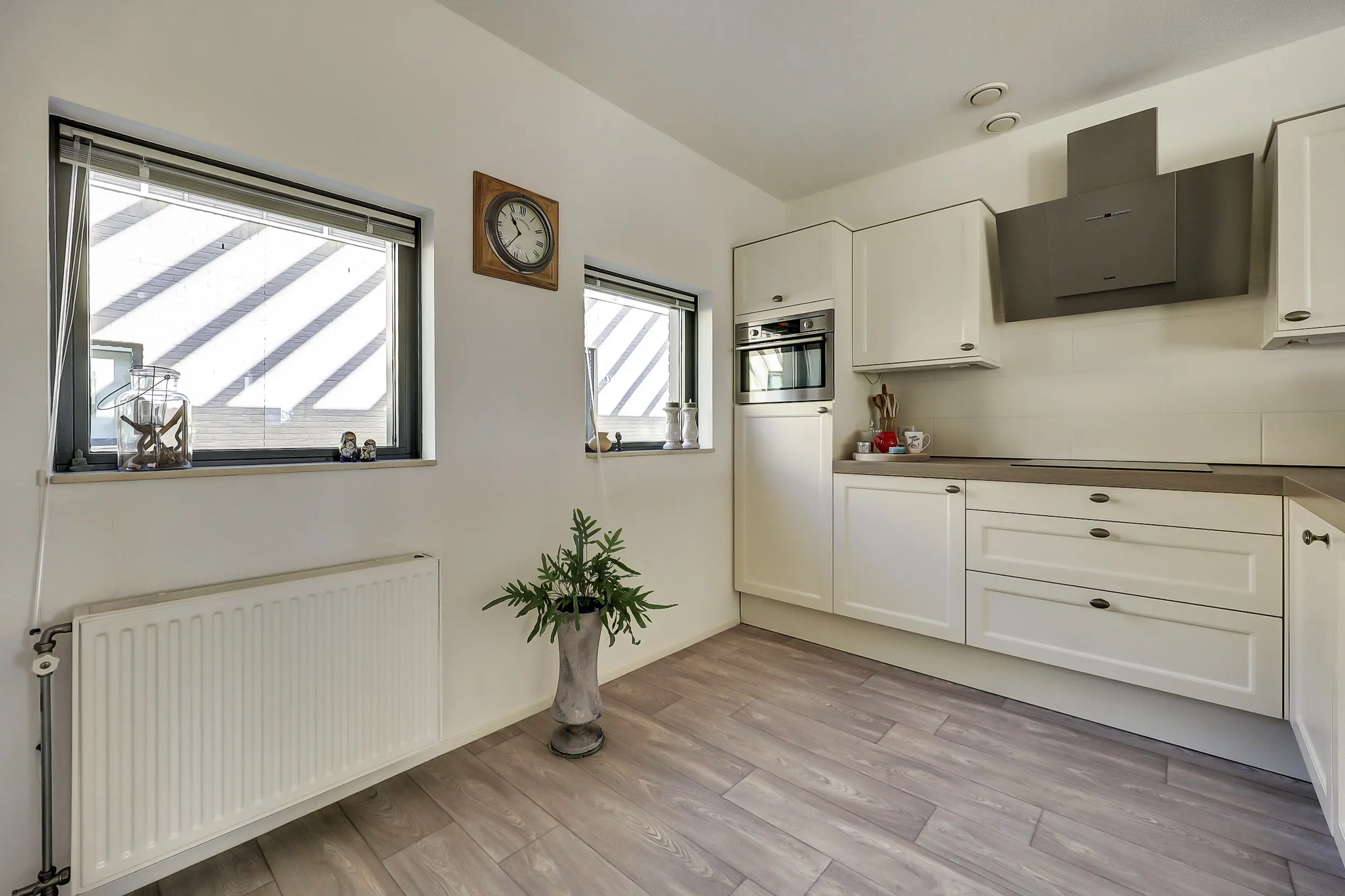 De open keuken in L-opstelling is praktisch ingericht en voorzien van diverse inbouwapparatuur, waaronder een inductiekookplaat met afzuigkap, koelkast, tafelmodel vriezer, vaatwasser en magnetron.