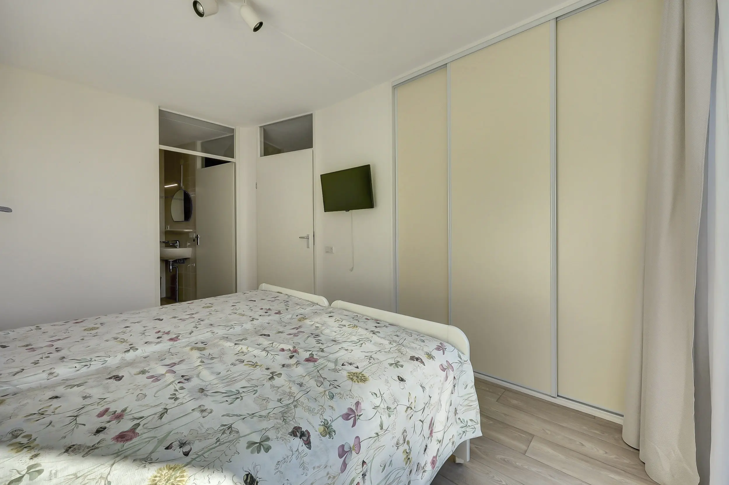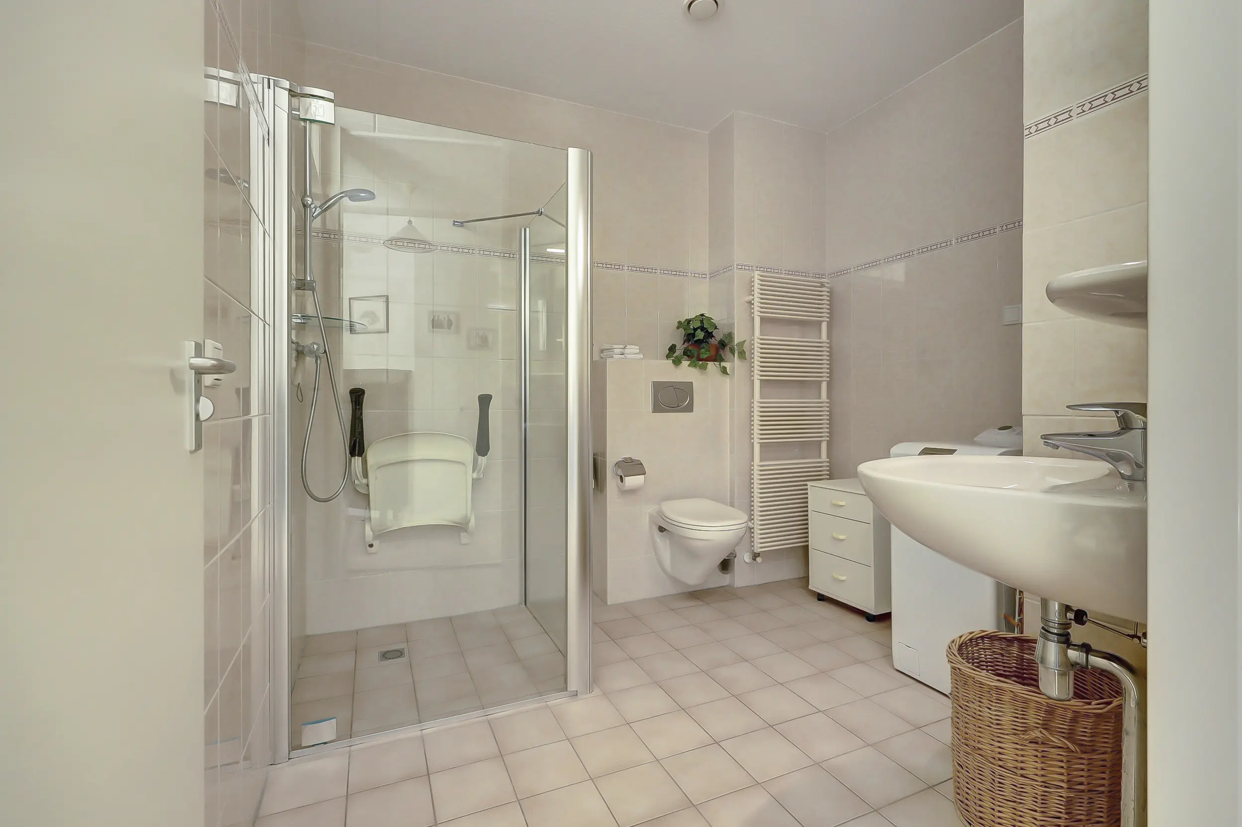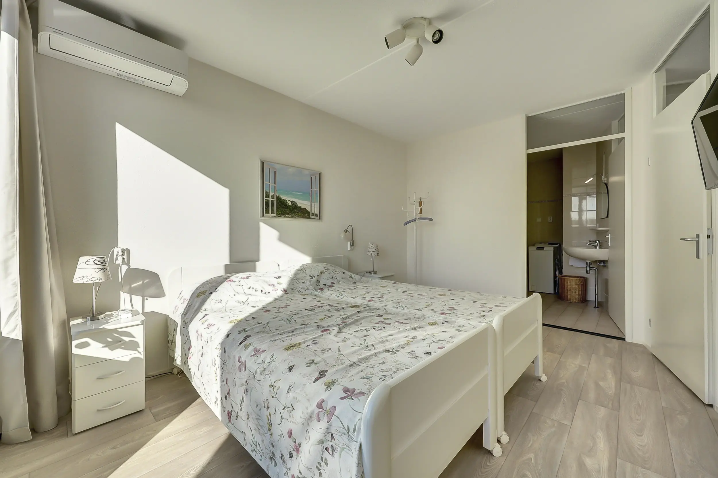 De slaapkamer, heeft directe toegang tot zowel het balkon als de badkamer. Deze is volledig betegeld en ruim opgezet, met een douche, tweede toilet, wastafel en aansluitingen voor wasmachine en droger. De badkamer is zo ingericht dat het geschikt is voor mindervaliden.