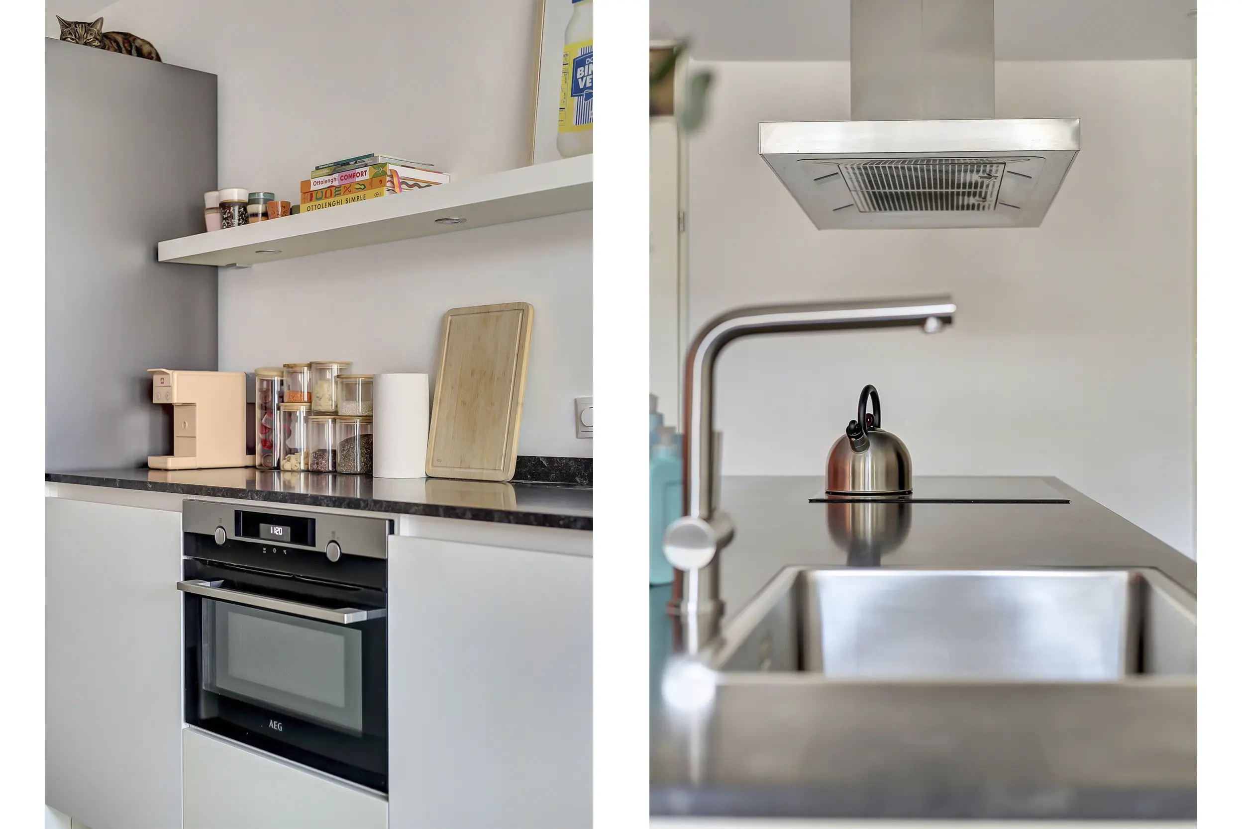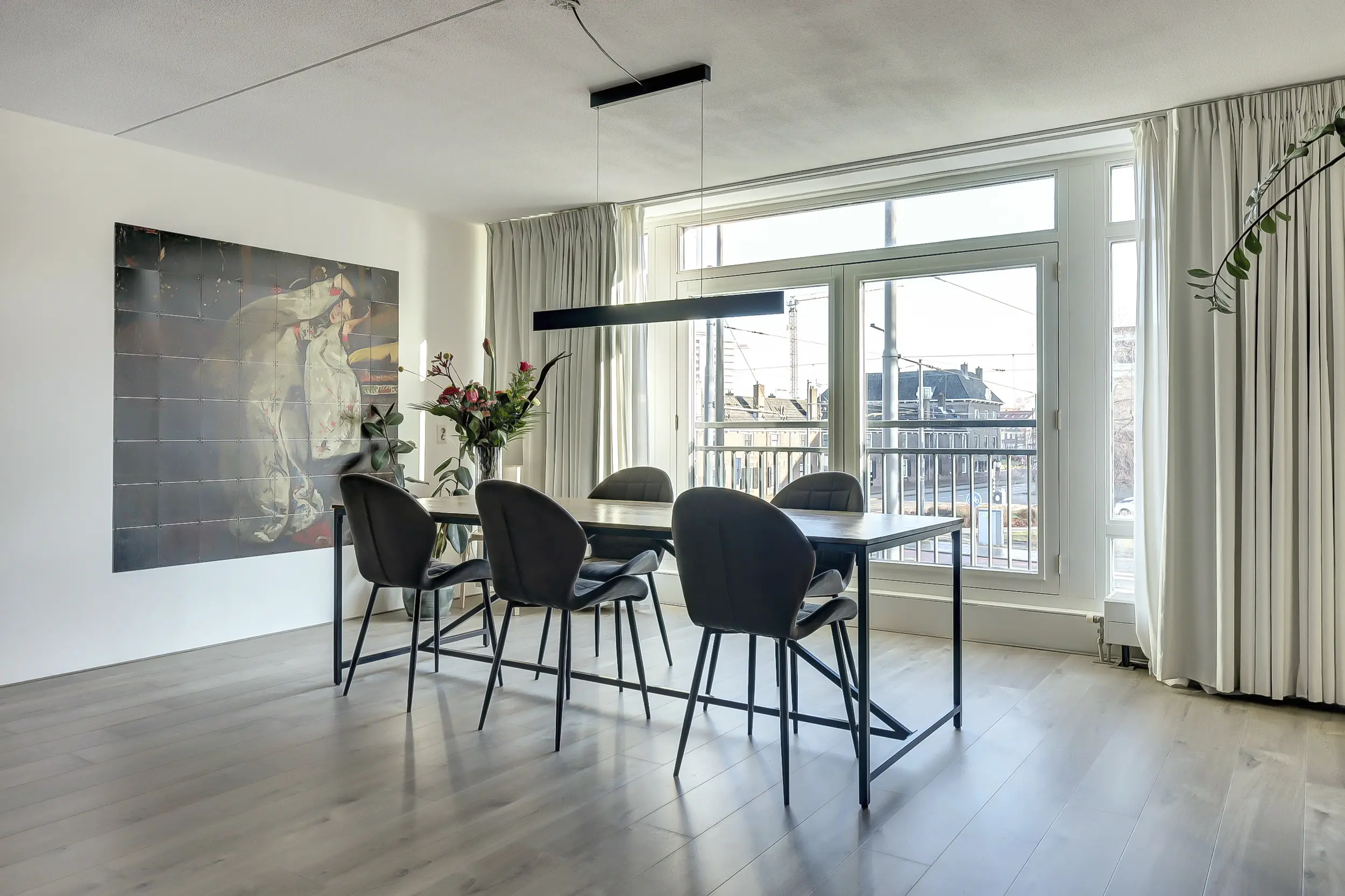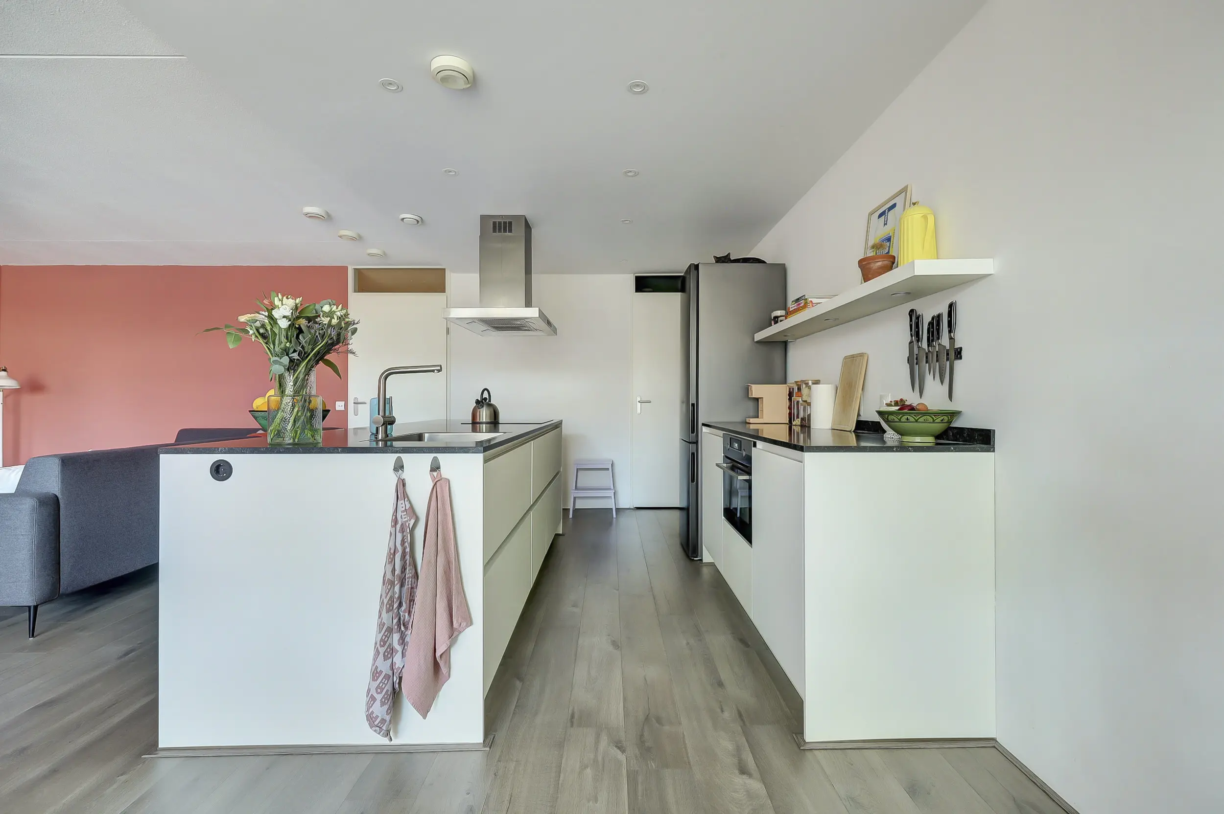 De riante woonkamer is licht en ruim opgezet, met een grote raampartij en openslaande deuren met Frans balkon. De open keuken vormt het hart van de woning en is modern uitgevoerd met een kookeiland voorzien van inductiekookplaat, afzuigkap en spoelbak. Daarnaast is er een ruim werkblad met oven, losse koel-vriescombinatie en volop bergruimte, perfect voor wie van koken en gezelligheid houdt.