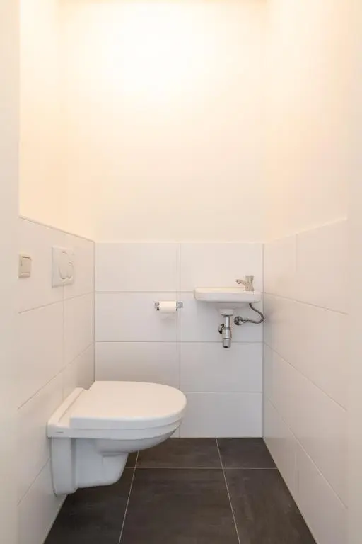 Betegelde toiletruimte met vrij hangend toilet en wasbakje, meterkast, ruime berging