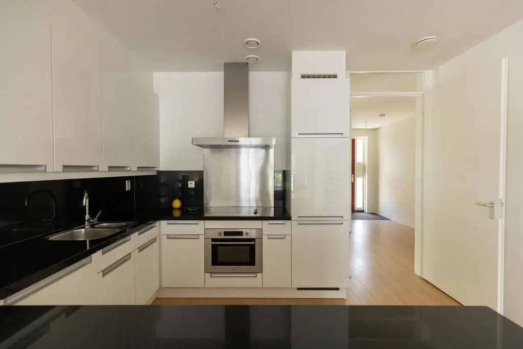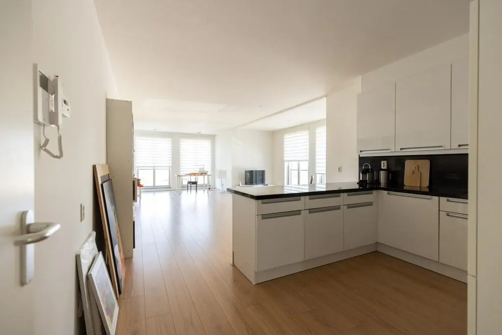 slaapkamer. De open inbouwkeuken met stenen blad met zitgedeelte heeft een