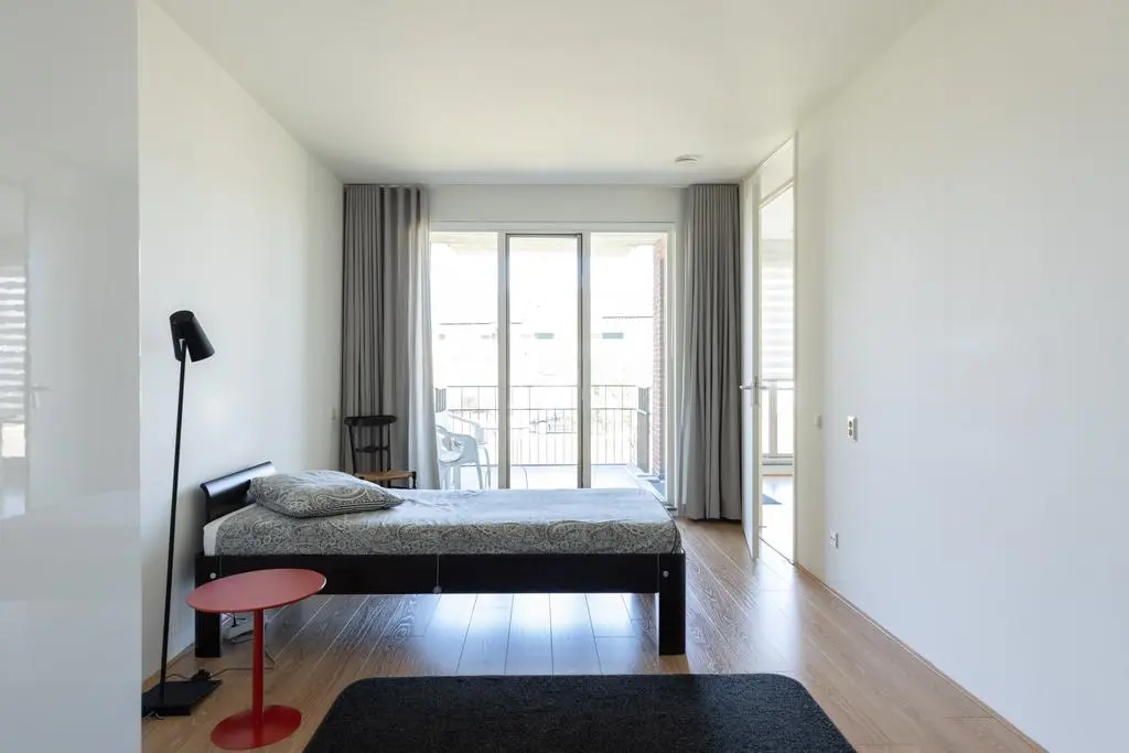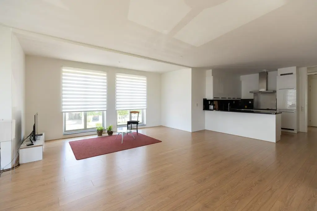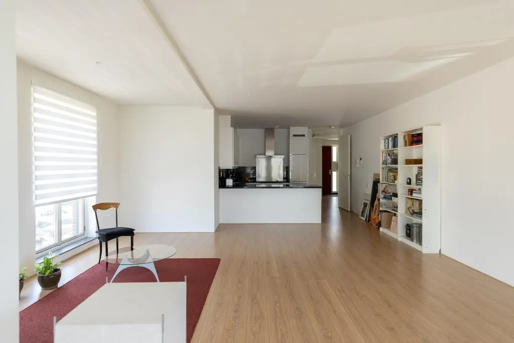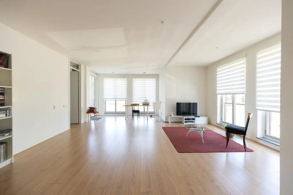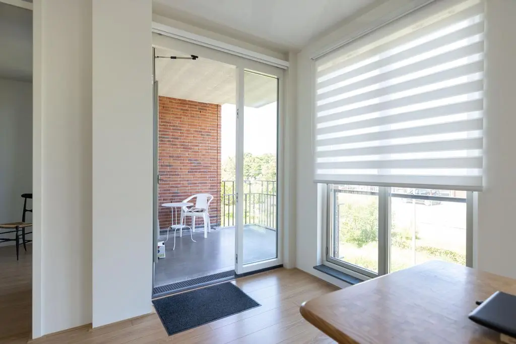 Lichte woonkamer met rondom glaspartijen met toegang tot balkon en 2e