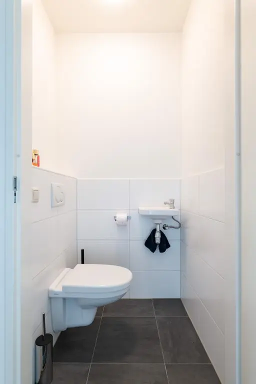 Betegelde toiletruimte met vrij hangend toilet en wasbakje, meterkast, ruime berging