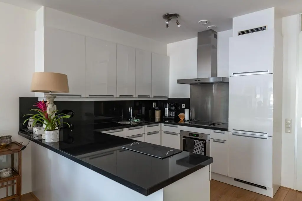 De open keuken met granieten blad met bargedeelte heeft een