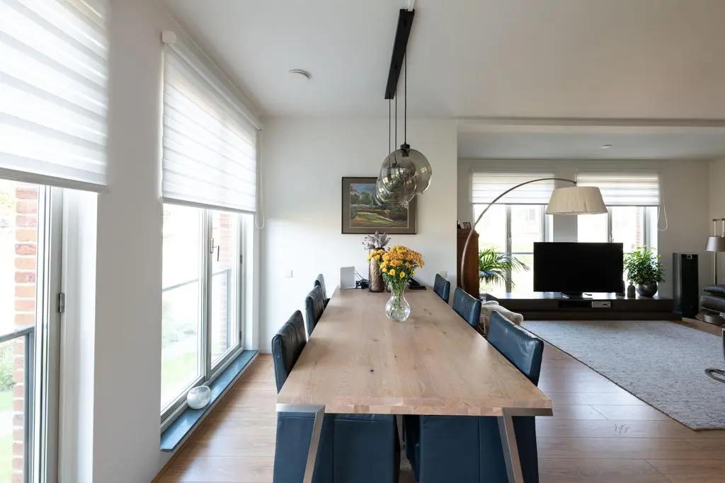 Lichte en sfeervolle woonkamer met rondom glaspartijen met toegang tot balkon en 2e slaapkamer.