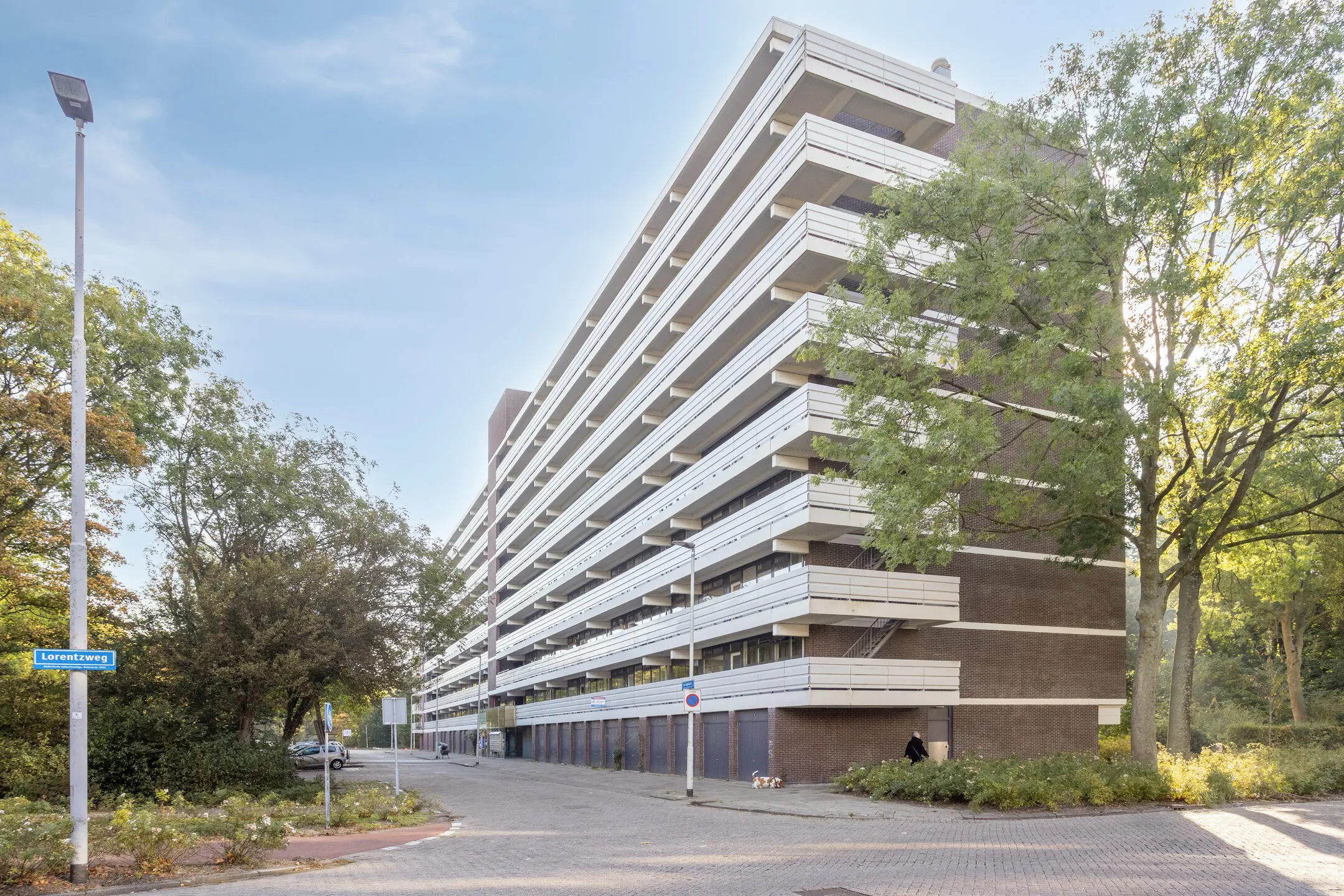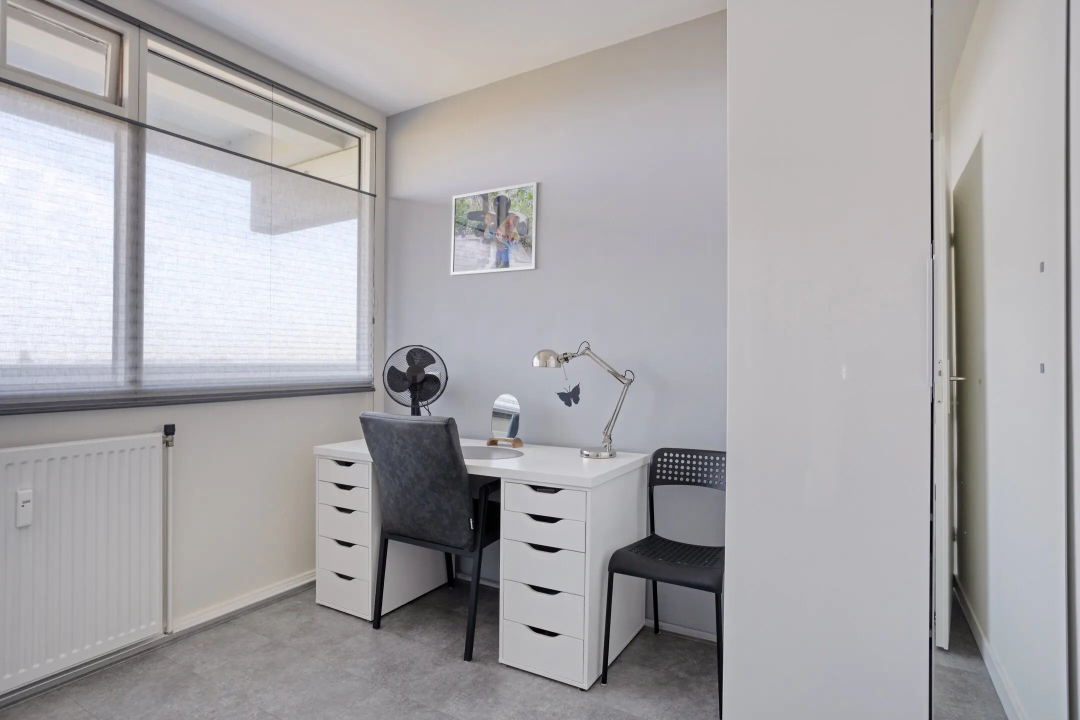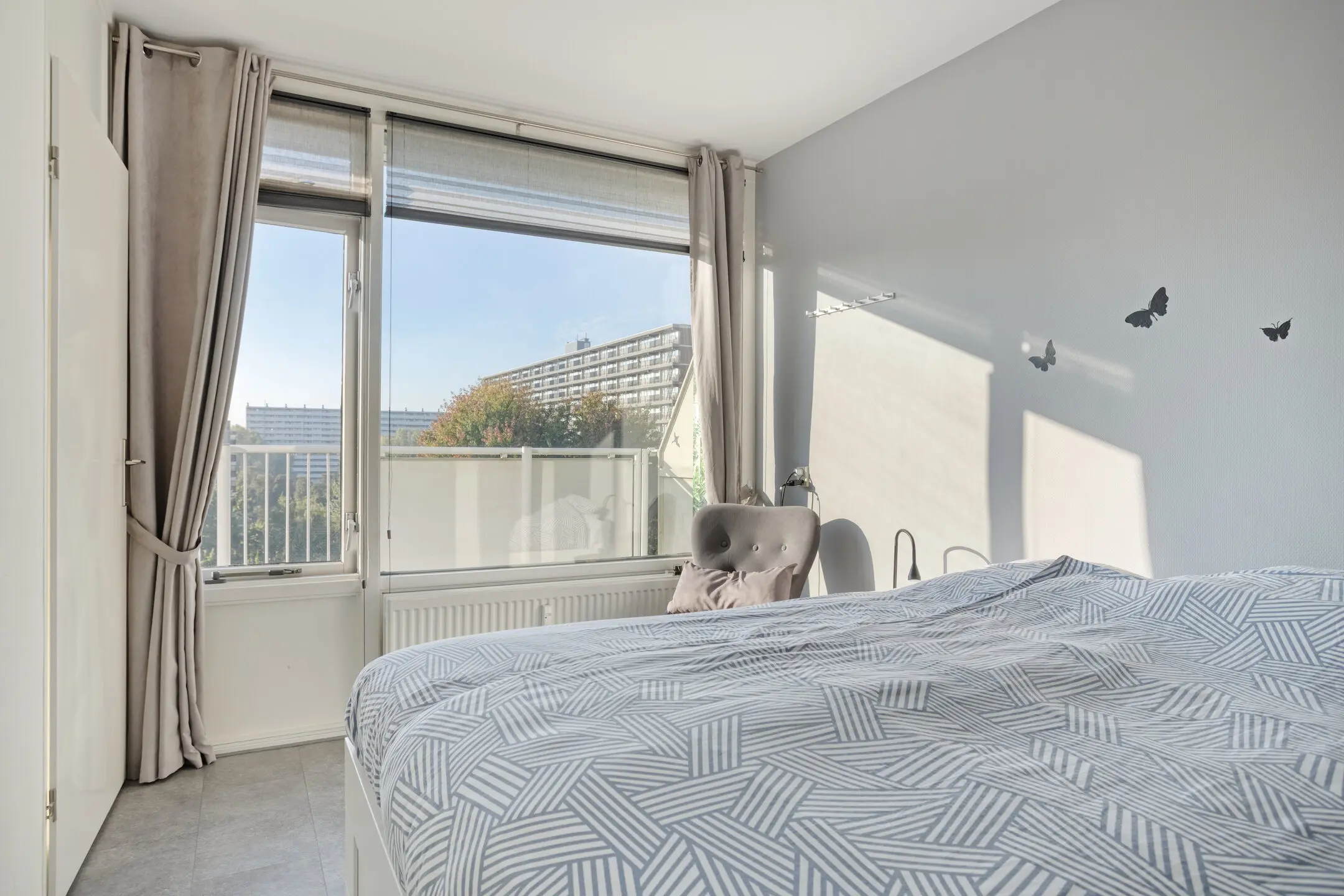 Galerij met toegang tot de woning. Bij binnenkomst kom je in de hal met intercom, meterkast en een deur met glas die toegang biedt tot de tussenhal. Vanuit de tussenhal bereik je alle vertrekken. De eerste slaapkamer bevindt zich aan de voorzijde van de woning. Hiernaast is er een praktische inpandige berging/inloopkast die volop opbergruimte biedt.