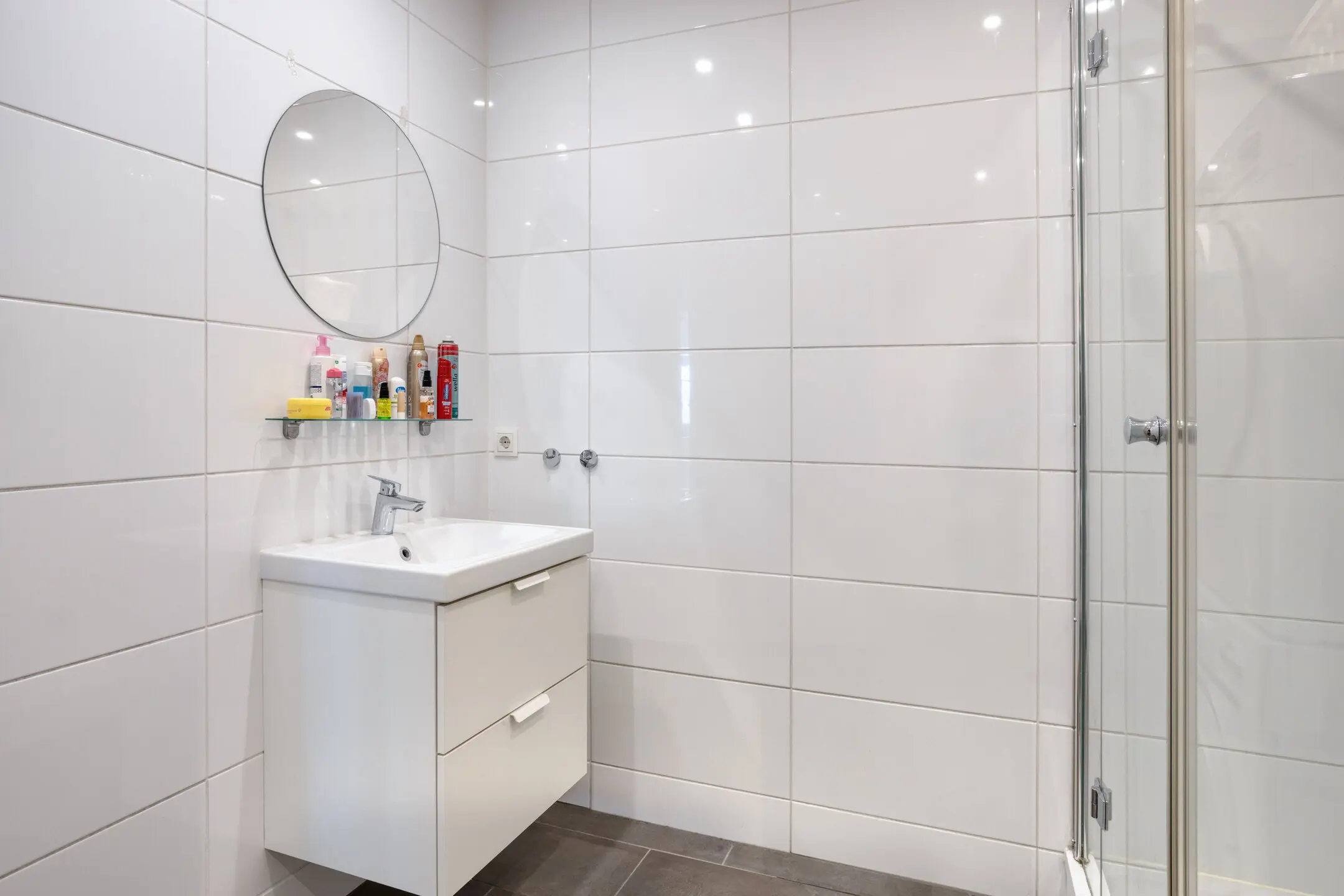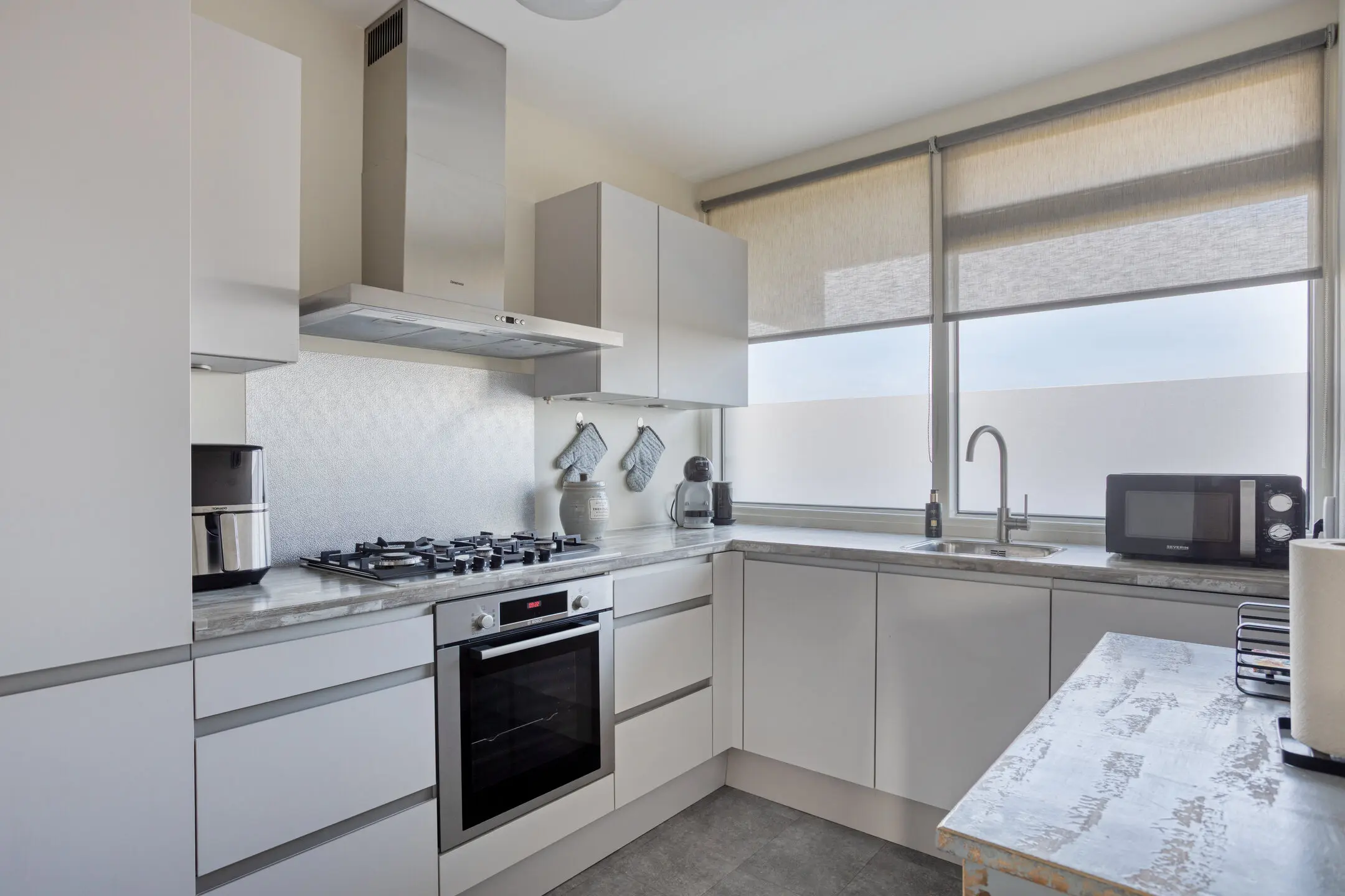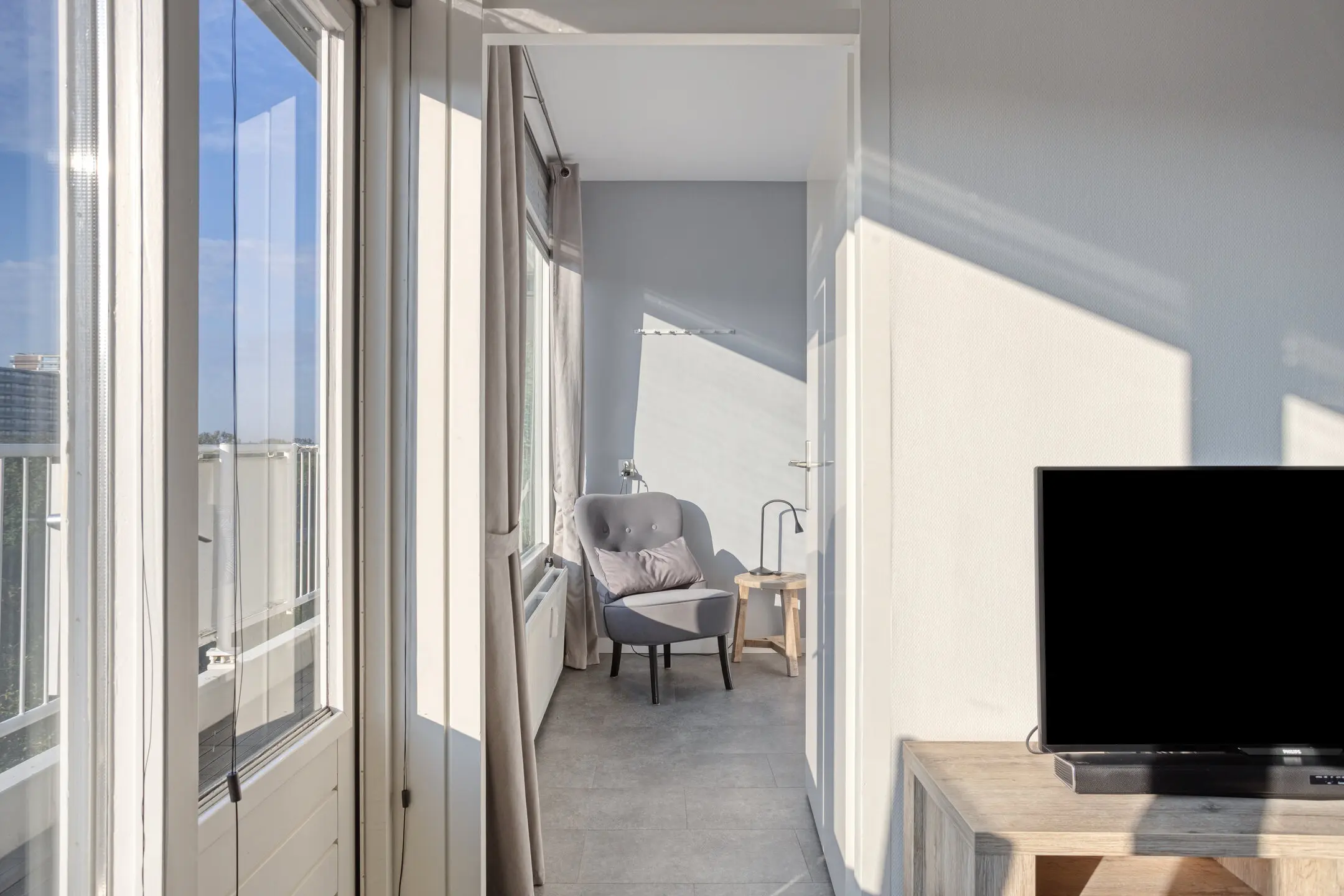 De ruime woonkamer is gelegen aan de achterzijde en is erg licht door de grote raampartij met deur naar het zonnige balkon dat gunstig op het zuid/zuidoosten is gelegen. Hier kun je genieten van de zon en de rust, terwijl je uitkijkt over het aangrenzende parkje. De (rood/wit/grijs gestreepte) zonneschermen met elektrische bediening zorgen ervoor dat de warmte buiten blijft. De tweede slaapkamer ligt aan achterzijde van het appartement. De volledig betegelde badkamer is uitgerust met een douche, wandcloset, wastafelmeubel en de aansluitingen voor de wasmachine en droger. Aan de voorzijde van de woning bevindt zich de open keuken. Deze is geplaatst in L-opstelling en is uitgerust met een gasfornuis met wokbrander, RVS afzuigkap (recirculatie), vaatwasmachine, koel-/vriescombinatie (2021), oven (2021) en spoelbak onder het raam. Het appartement is m.u.v. de natte ruimtes voorzien van grijze PVC tegels welke drempelloos zijn doorgelegd.