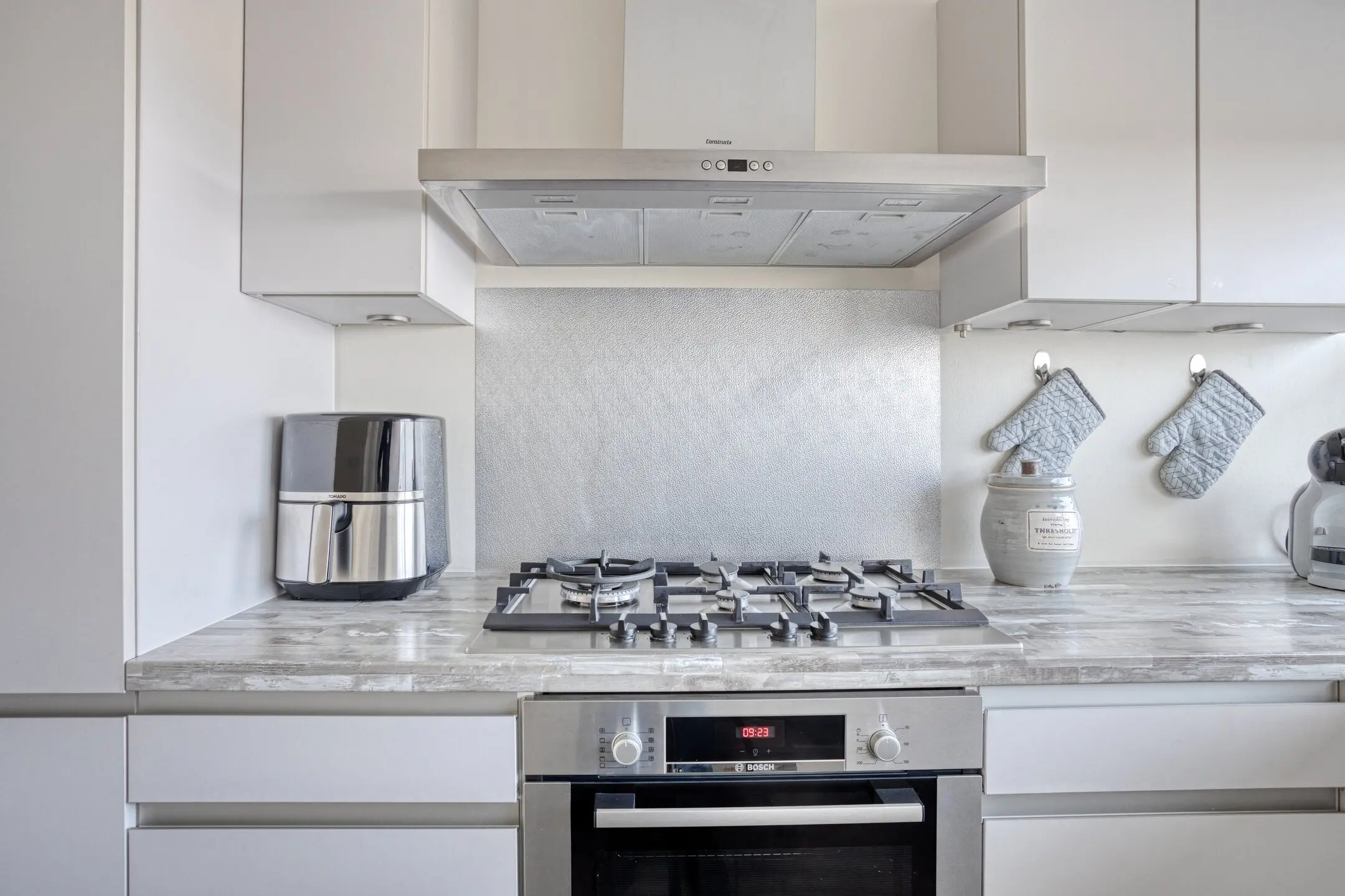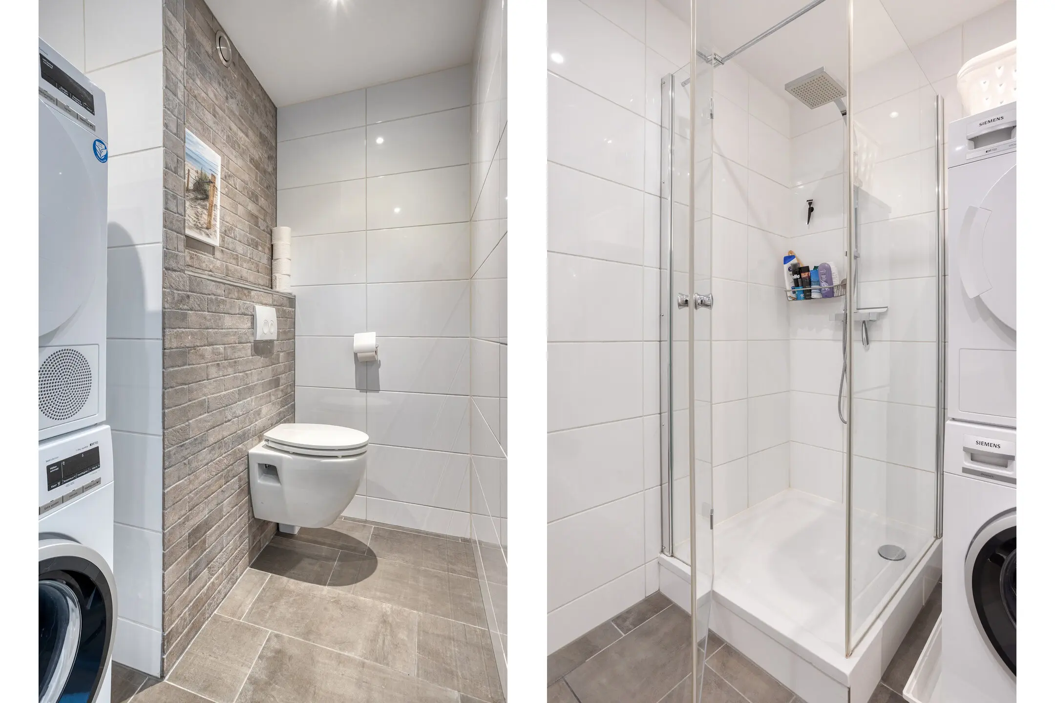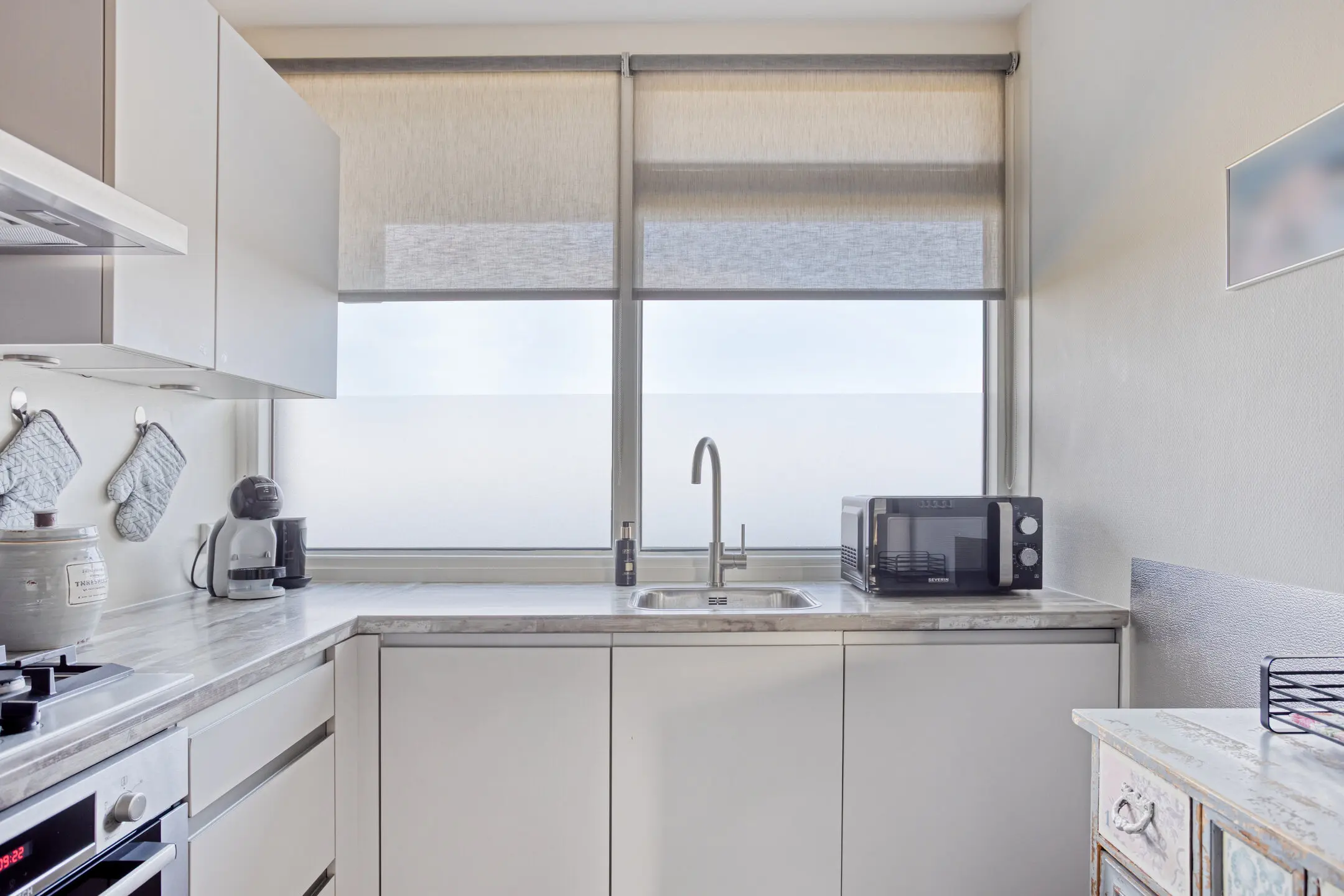 De ruime woonkamer is gelegen aan de achterzijde en is erg licht door de grote raampartij met deur naar het zonnige balkon dat gunstig op het zuid/zuidoosten is gelegen. Hier kun je genieten van de zon en de rust, terwijl je uitkijkt over het aangrenzende parkje. De (rood/wit/grijs gestreepte) zonneschermen met elektrische bediening zorgen ervoor dat de warmte buiten blijft. De tweede slaapkamer ligt aan achterzijde van het appartement. De volledig betegelde badkamer is uitgerust met een douche, wandcloset, wastafelmeubel en de aansluitingen voor de wasmachine en droger. Aan de voorzijde van de woning bevindt zich de open keuken. Deze is geplaatst in L-opstelling en is uitgerust met een gasfornuis met wokbrander, RVS afzuigkap (recirculatie), vaatwasmachine, koel-/vriescombinatie (2021), oven (2021) en spoelbak onder het raam. Het appartement is m.u.v. de natte ruimtes voorzien van grijze PVC tegels welke drempelloos zijn doorgelegd.