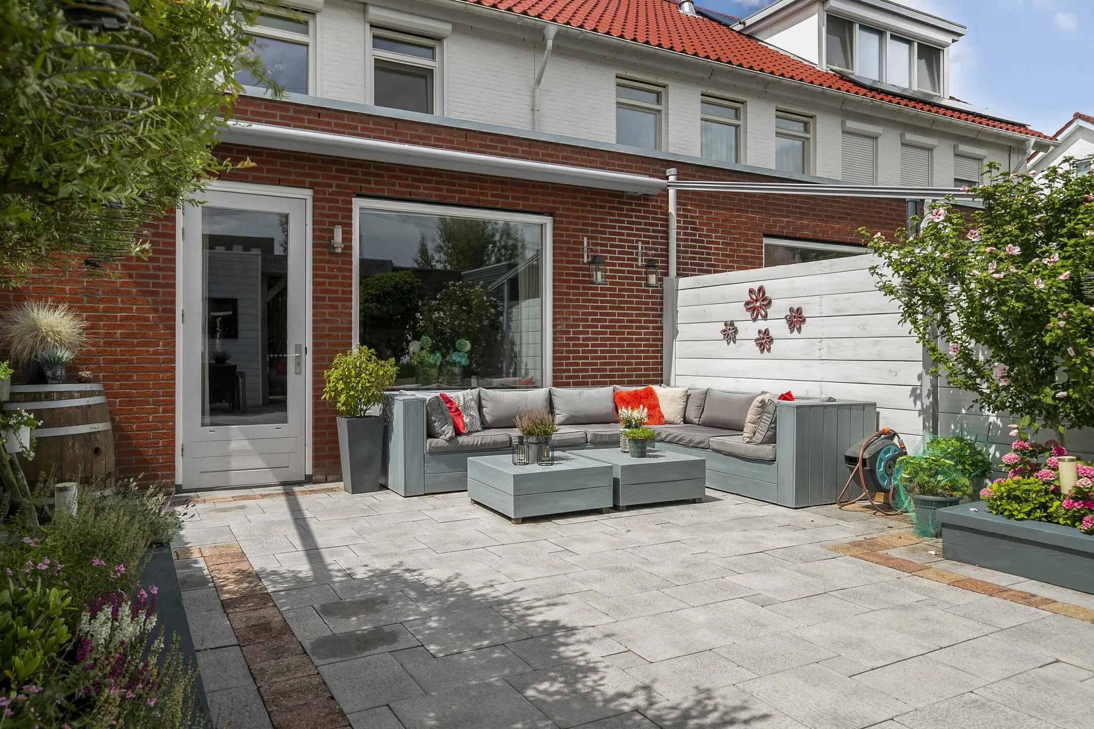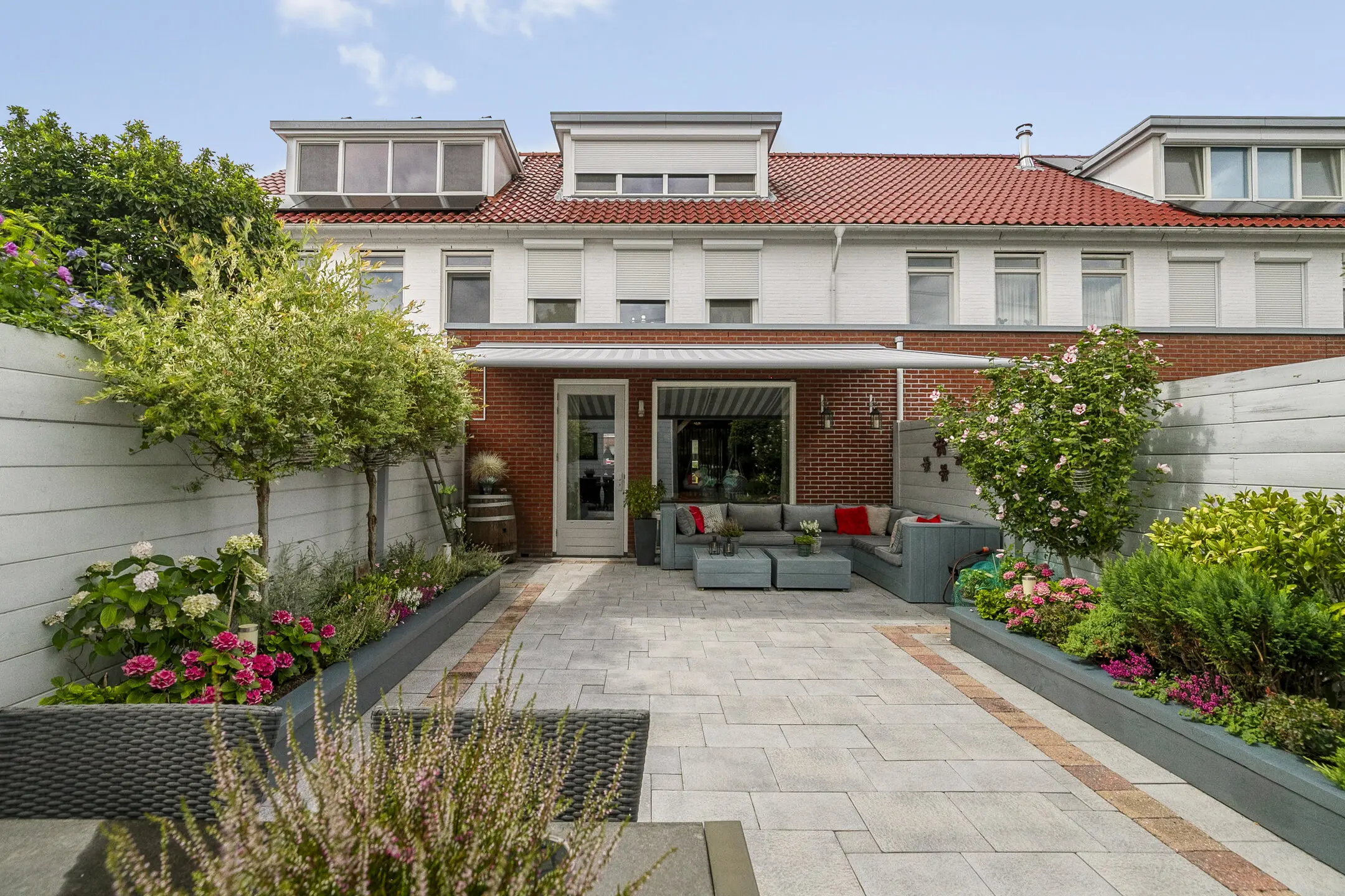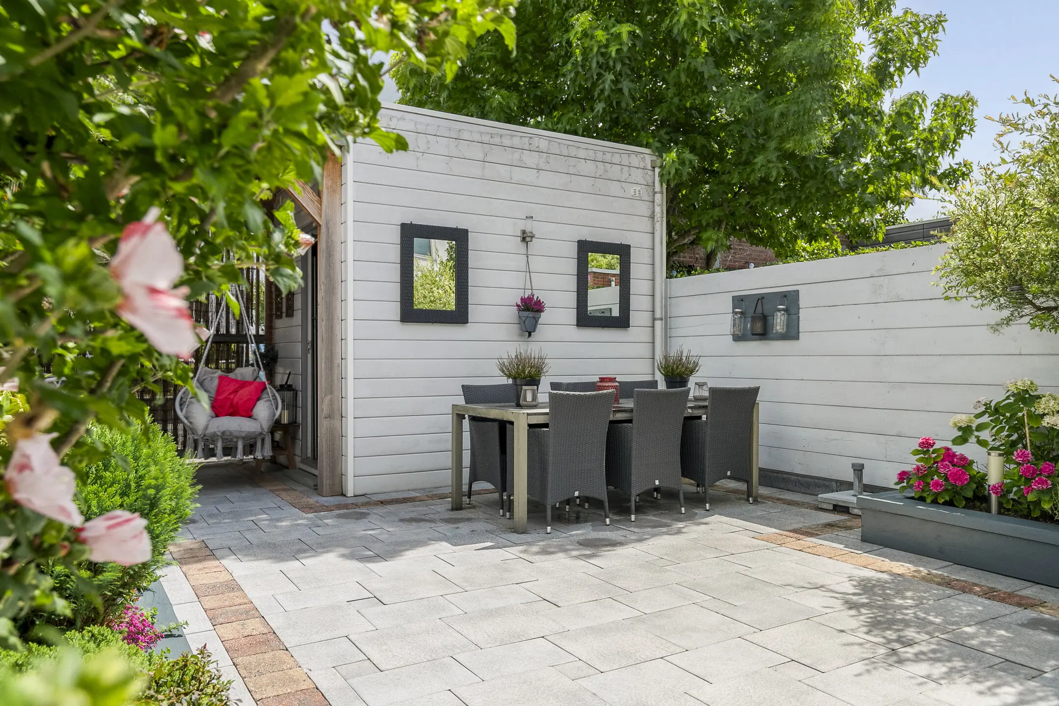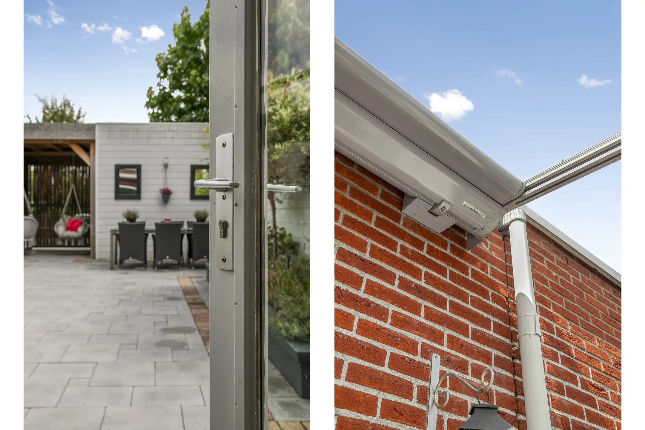 Nette voortuin (west) met vaste beplanting. In de nabije omgeving van de woning is voldoende gratis parkeergelegenheid. De op het oosten gelegen achtertuin is onderhoudsvriendelijk aangelegd, hier is een buitenkraan, achterpoort en een berging geïsoleerd en voorzien van onderhoudsvrije Werzaliete delen aanwezig. Het (rood/grijs) gestreepte elektrische zonnescherm houdt de zon uit de woonkamer.