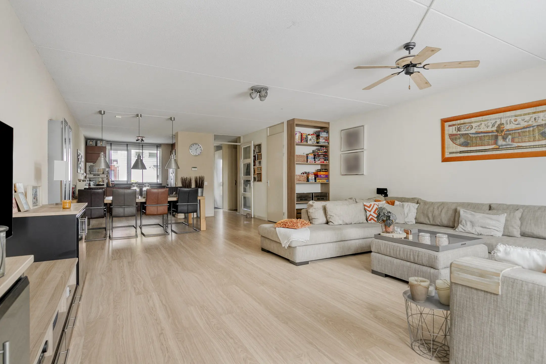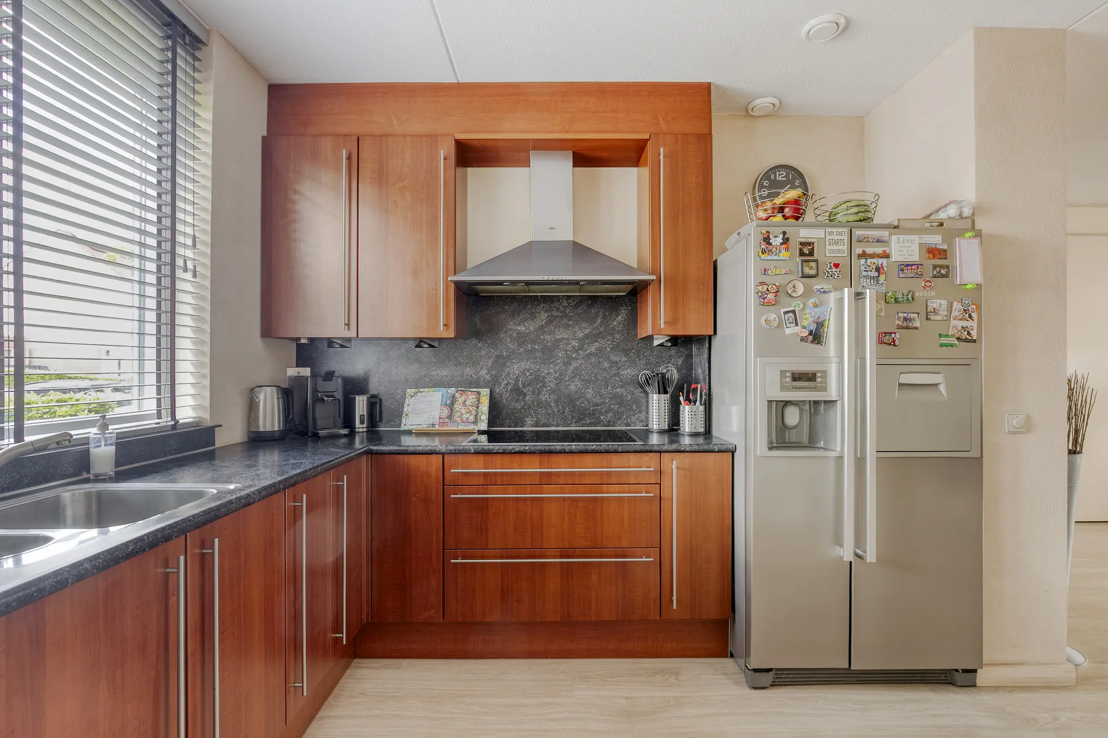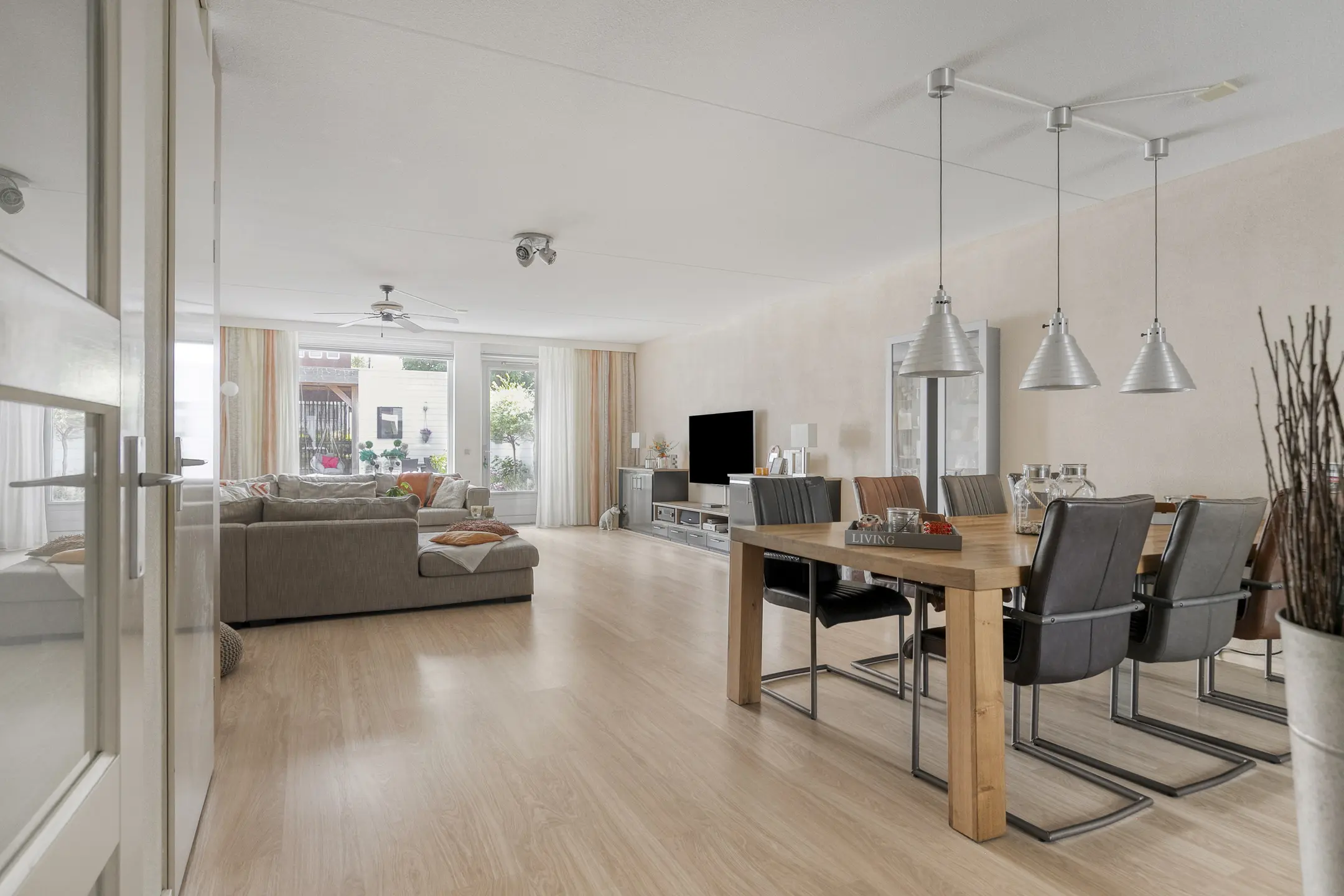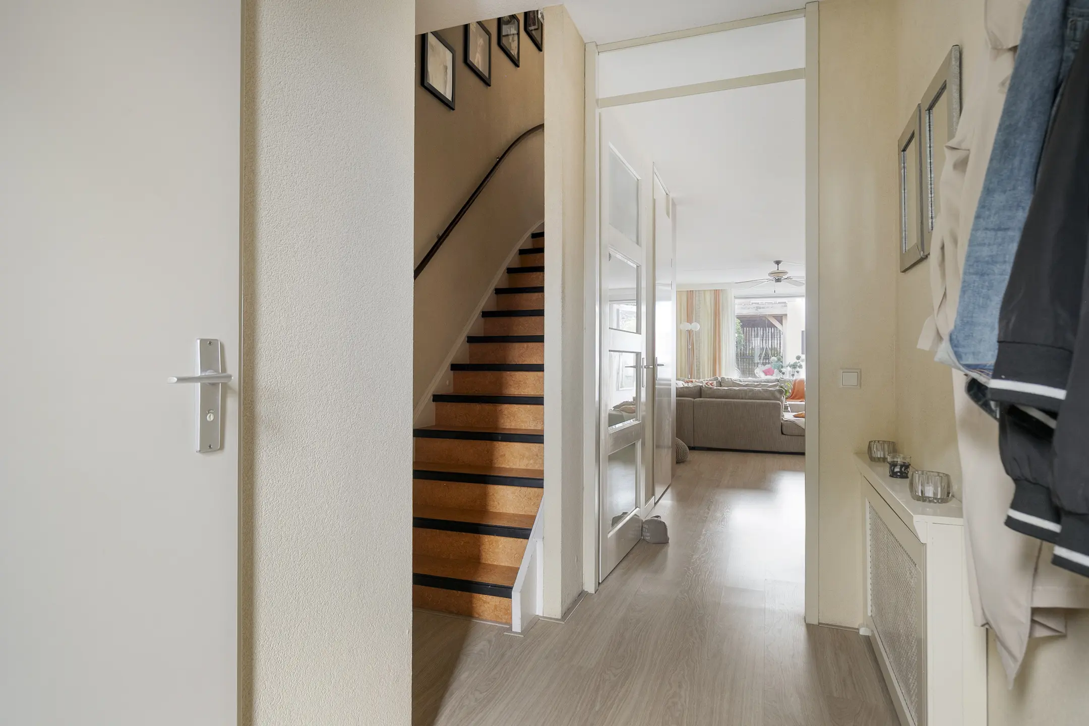 Entree, ruime hal met meterkast en trapopgang, in lichte kleurstelling betegelde toiletruimte met wandcloset en fonteintje. De royale living bestaat uit een open keuken aan de voorzijde van de woning en een tuingerichte woonkamer met deur (met plissé hor) naar de tuin. De keuken is geplaatst in L-opstelling en is uitgerust met een keramische kookplaat, RVS afzuigkap (met afvoer naar buiten), oven, een magnetron met crisp- en grill functie en een combi magnetron oven, vaatwasmachine, carousselkast, losse Amerikaanse koelkast en 1 1/2 spoelbak onder het raam. De gezellige woonkamer is heel licht door de grote raampartij, is tijdens de bouw 2,40 meter uitgebouwd en er is een praktische vaste kast aanwezig. Op de begane grond ligt een nette laminaatvloer.