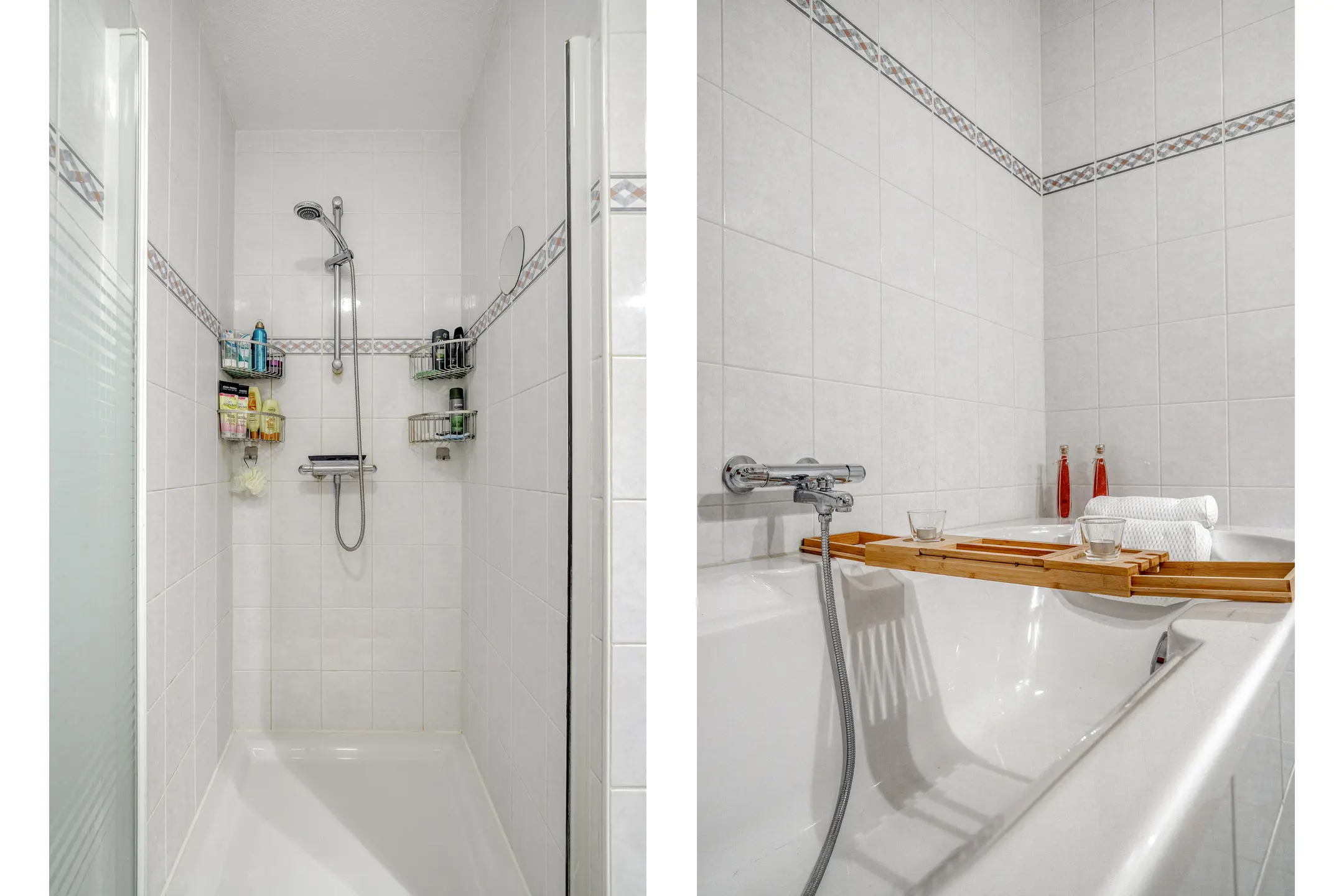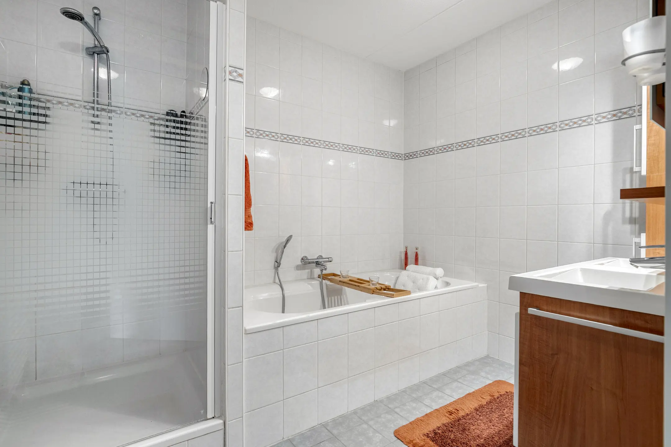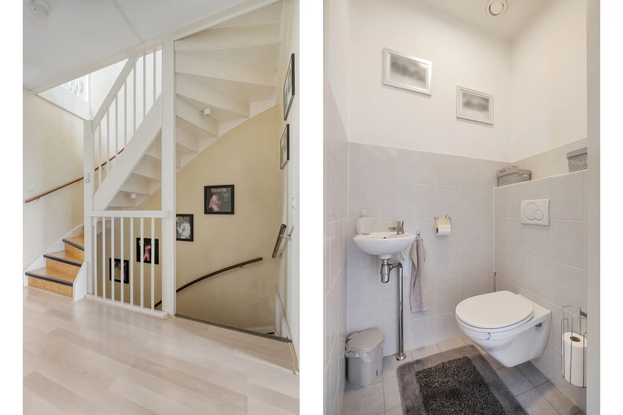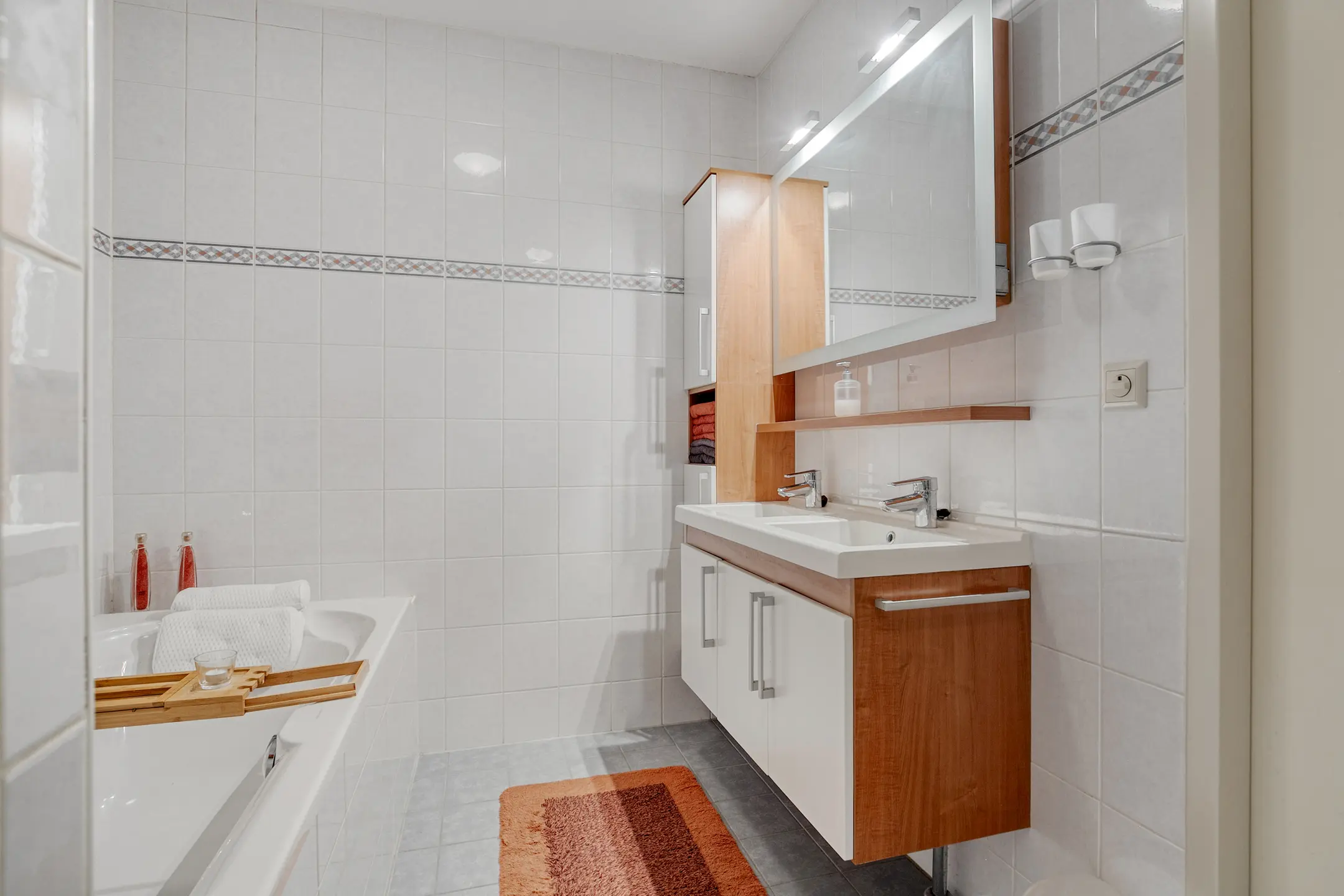 Overloop, 2 slaapkamers van een fijn formaat aan de achterzijde van de woning. De hoofdslaapkamer ligt aan de voorzijde en heeft een schuifkastenwand met spiegeldeur. Alle slaapkamers zijn voorzien van een rolluik met elektrische bediening. Op de overloop en in de slaapkamers ligt een drempelloos doorlopende lichte laminaatvloer. De tot het plafond betegelde badkamer is uitgerust met een ligbad, douche, designradiator en dubbele wastafelmeubel. Op de overloop is een separate toiletruimte aanwezig met wandcloset en fonteintje.