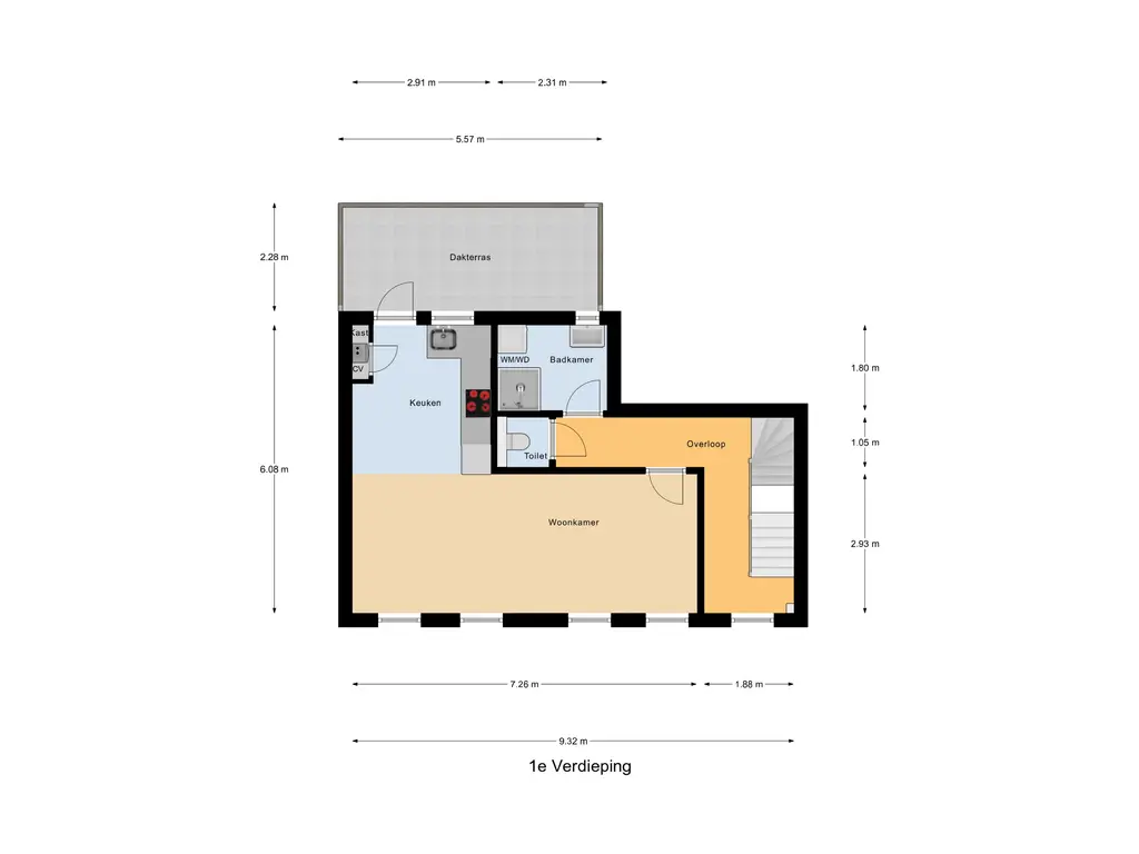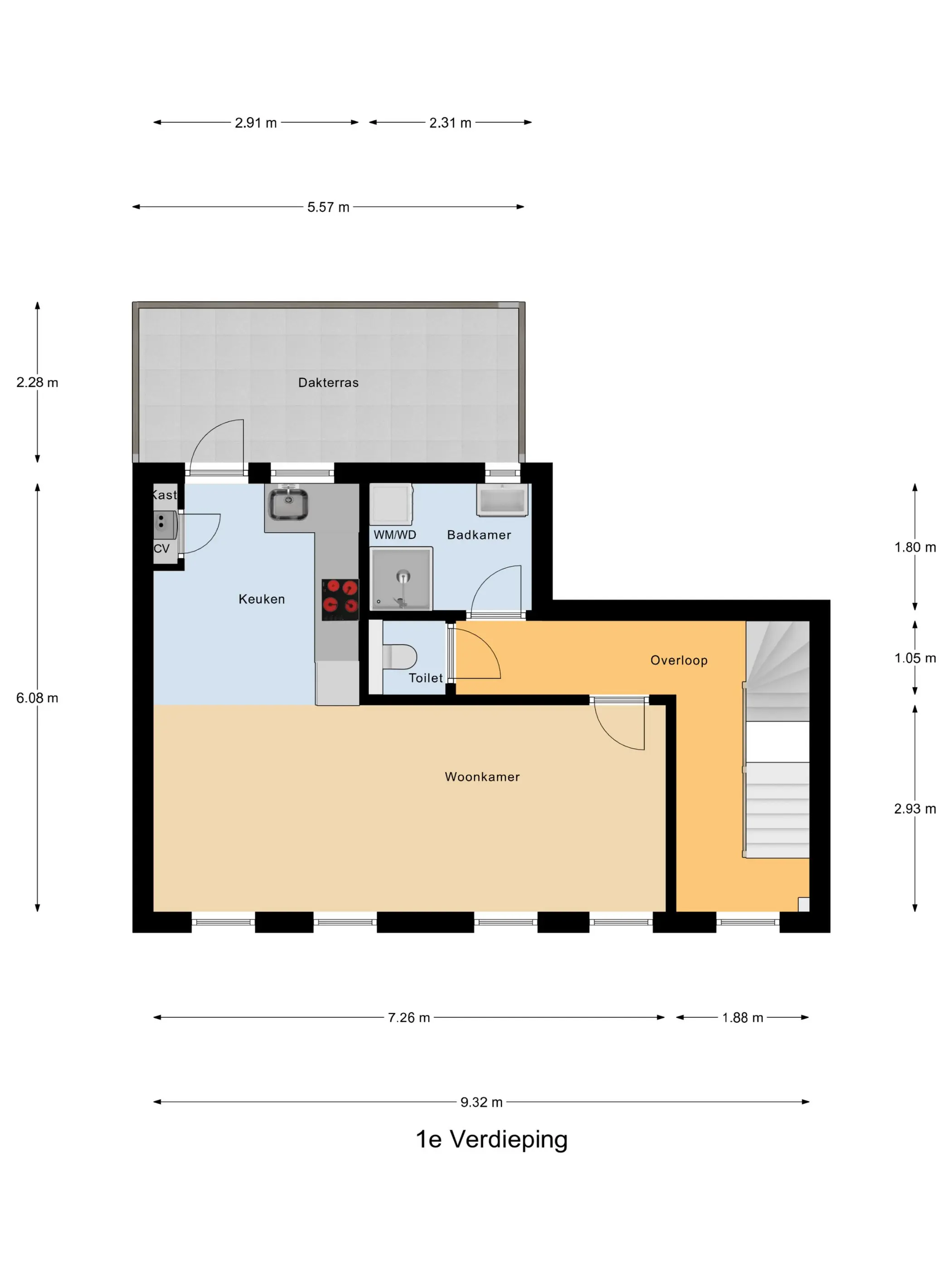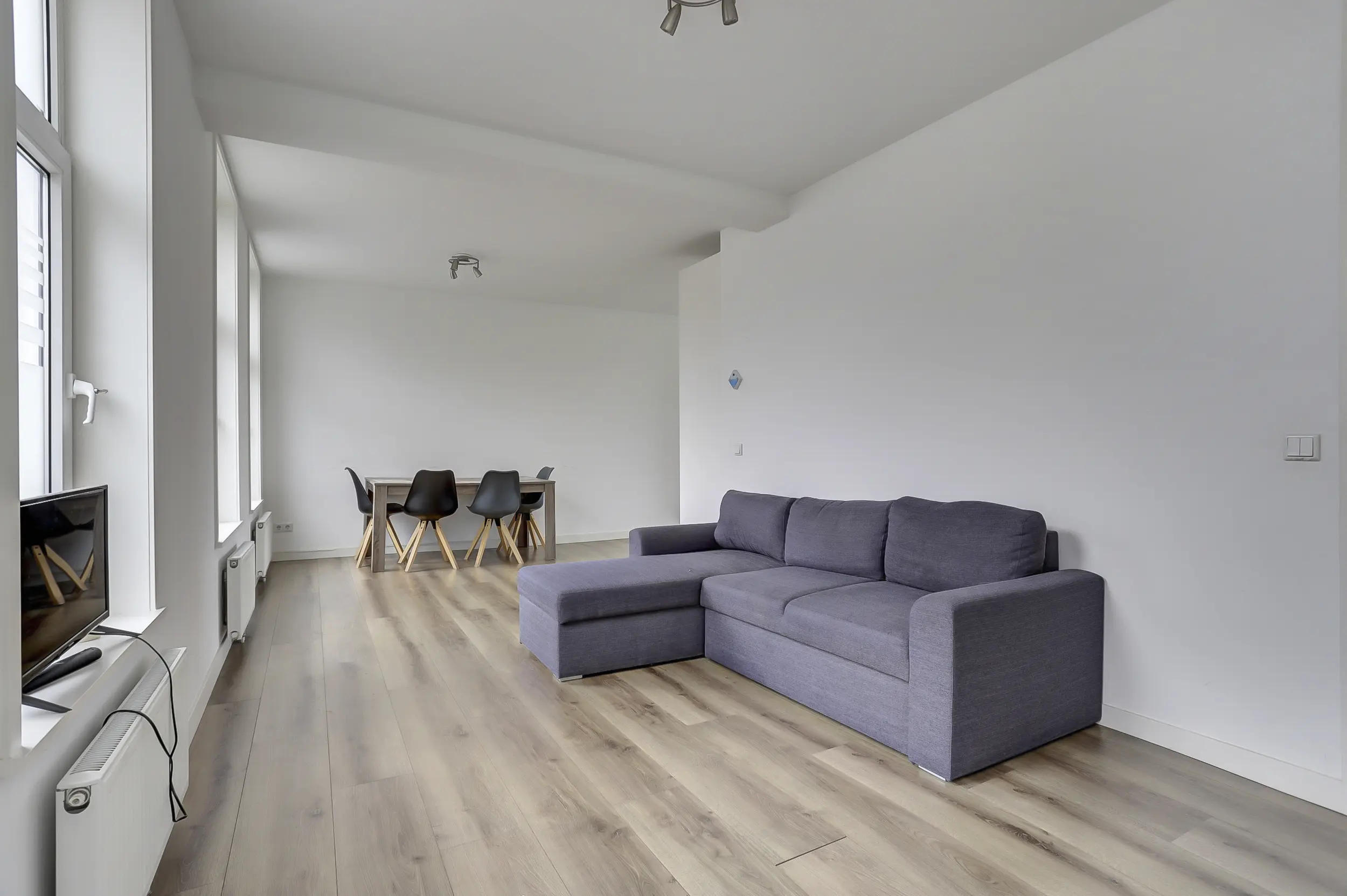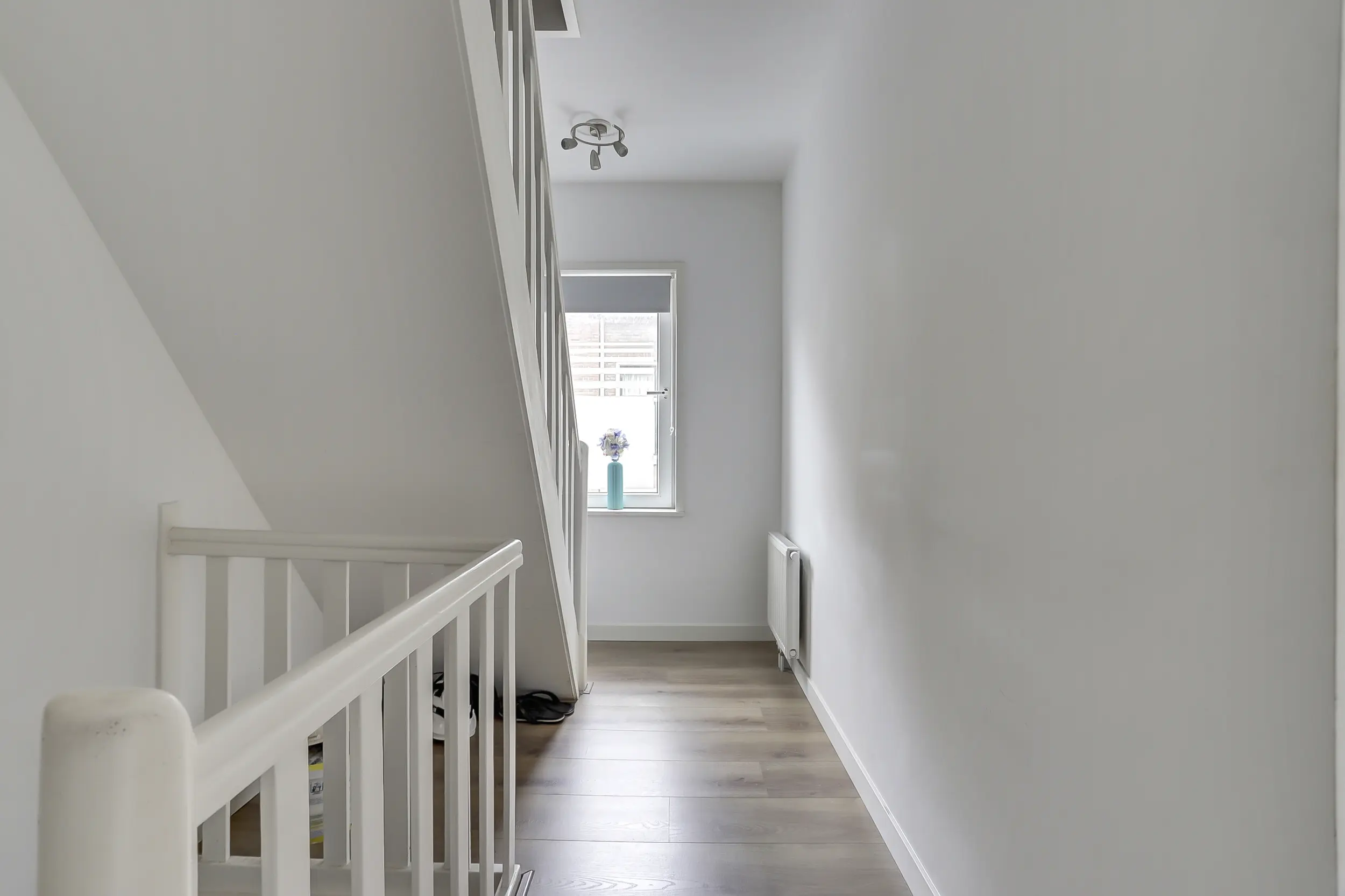 Via de gezamenlijke entree op de begane grond bereik je de eerste verdieping. Hier kom je binnen op een ruime overloop die toegang biedt tot de lichte woonkamer met halfopen keuken. Dankzij de gunstige ligging valt er veel natuurlijk licht binnen, wat zorgt voor een aangename sfeer.