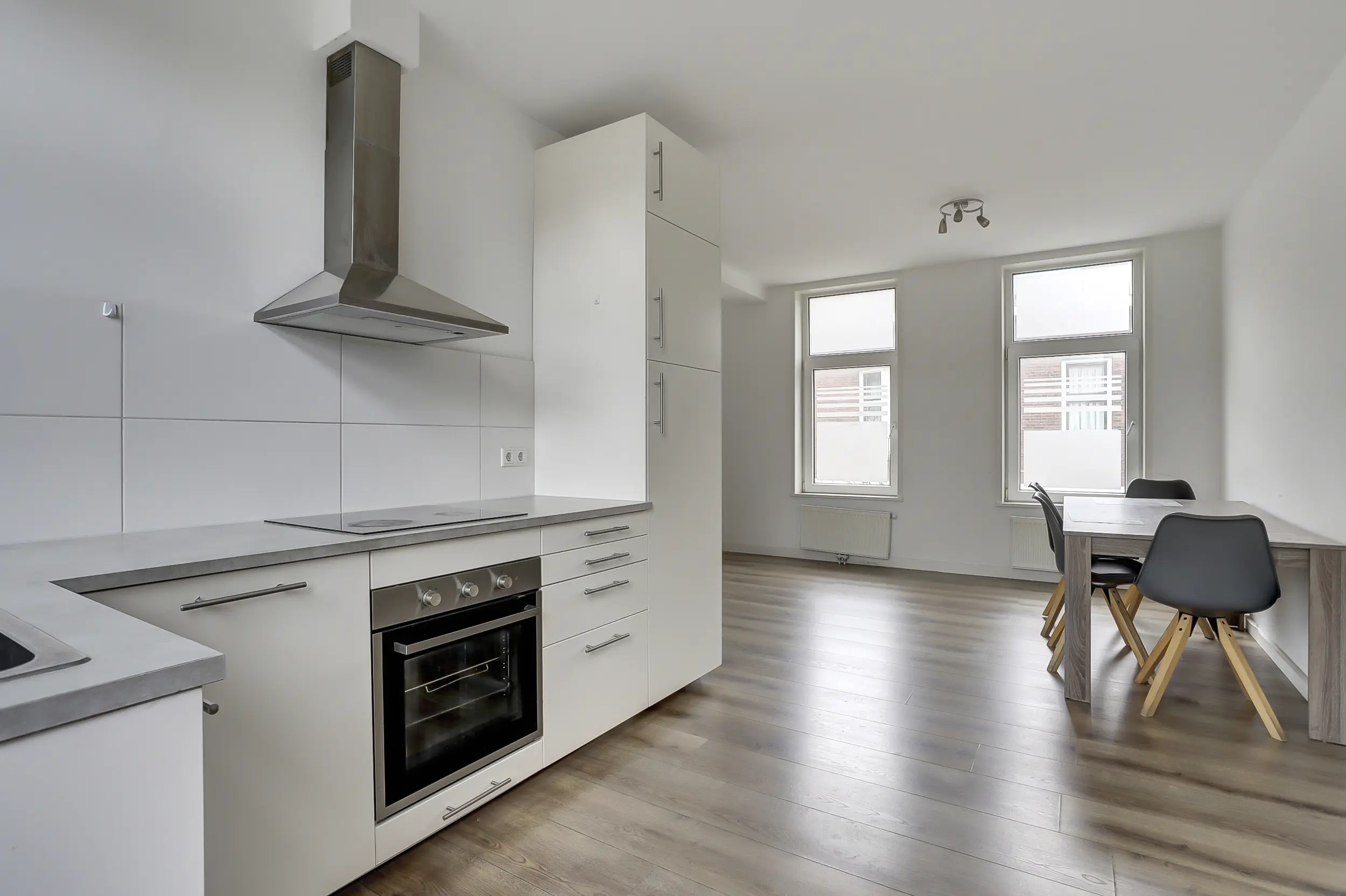 De keuken is modern uitgevoerd in strak wit en voorzien van diverse inbouwapparatuur, waaronder een elektrische kookplaat, afzuigkap, oven, koel-vriescombinatie en vaatwasser. Vanuit de keuken is er directe toegang tot het ruime balkon, gelegen op het noorden.