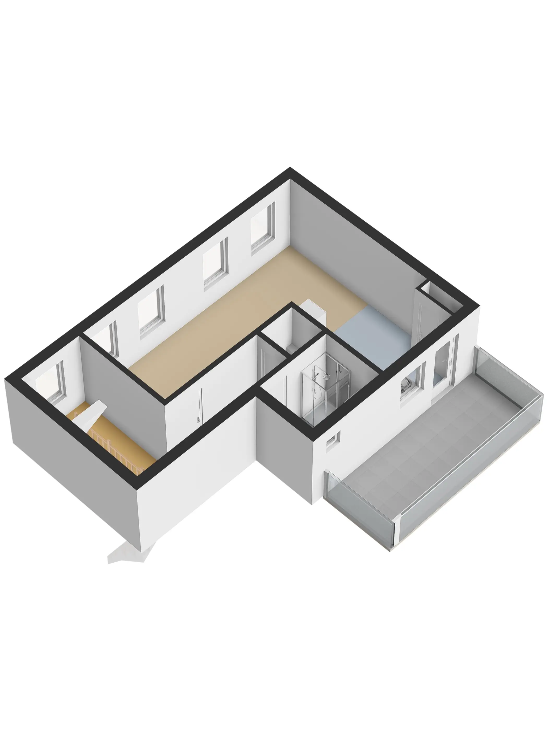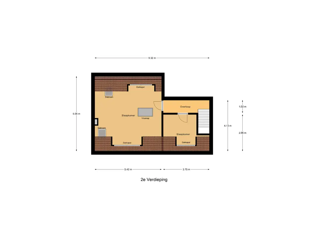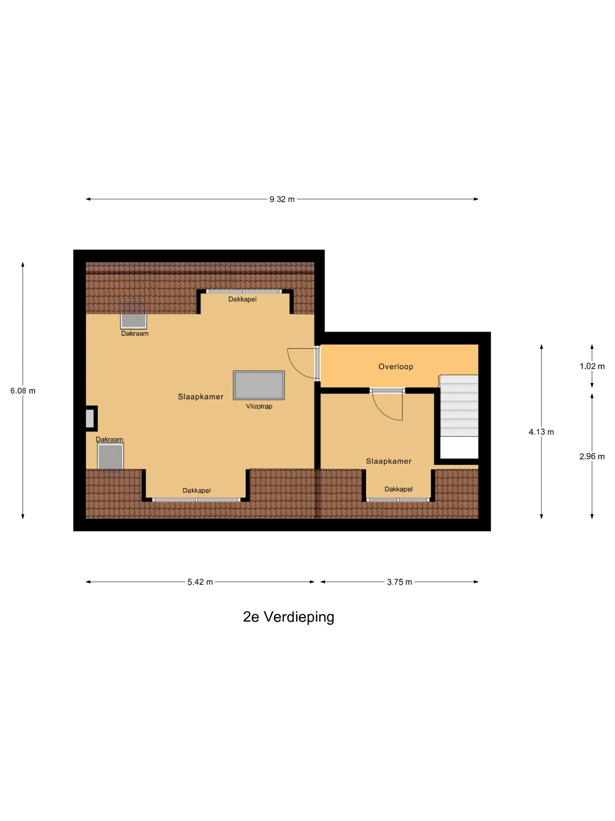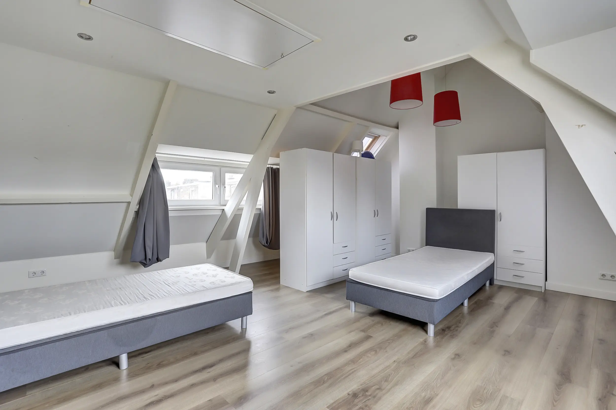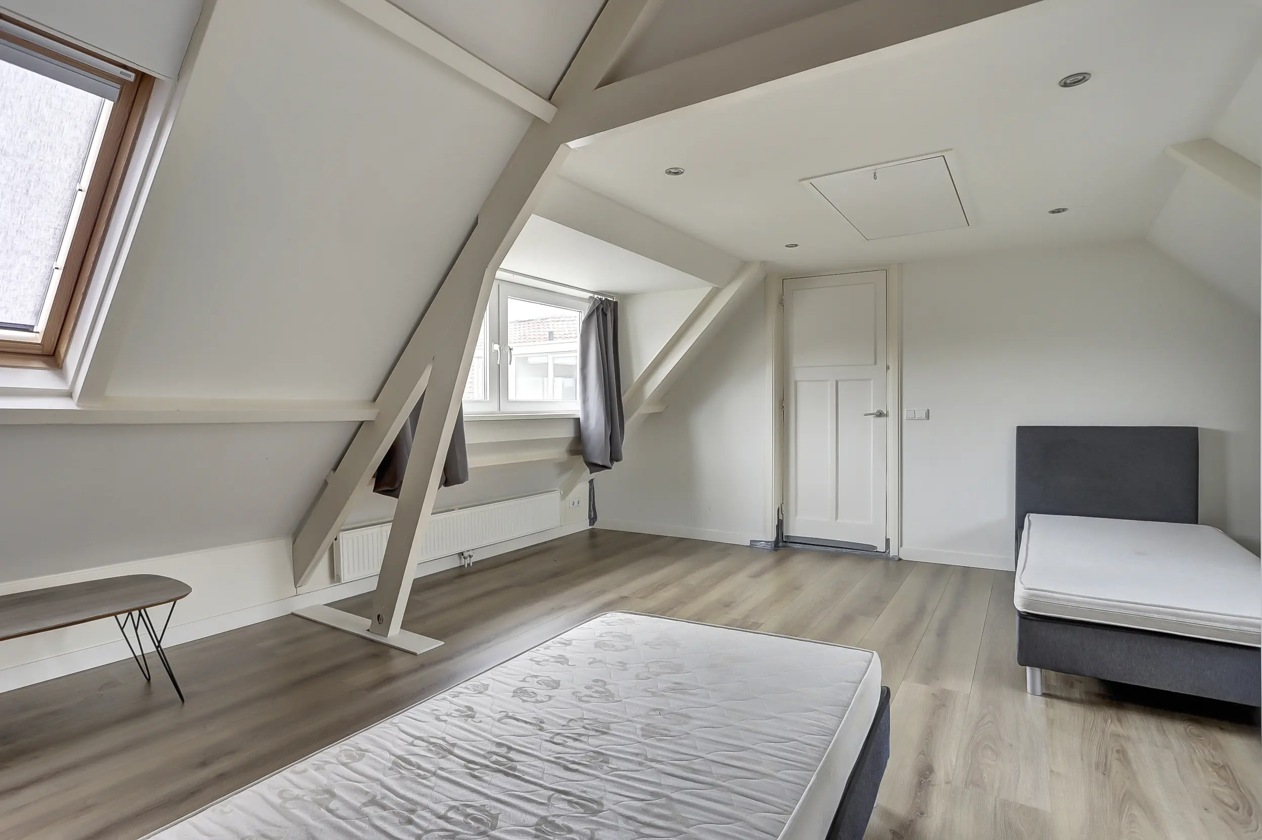 Via een vaste trap bereik je de tweede verdieping, waar zich twee slaapkamers bevinden. De slaapkamer aan de achterzijde (ca. 32 m²) is verrassend ruim en speels ingedeeld, met een dakkapel die zorgt voor extra licht en ruimte. De tweede slaapkamer (ca. 11 m²) beschikt eveneens over een dakkapel.