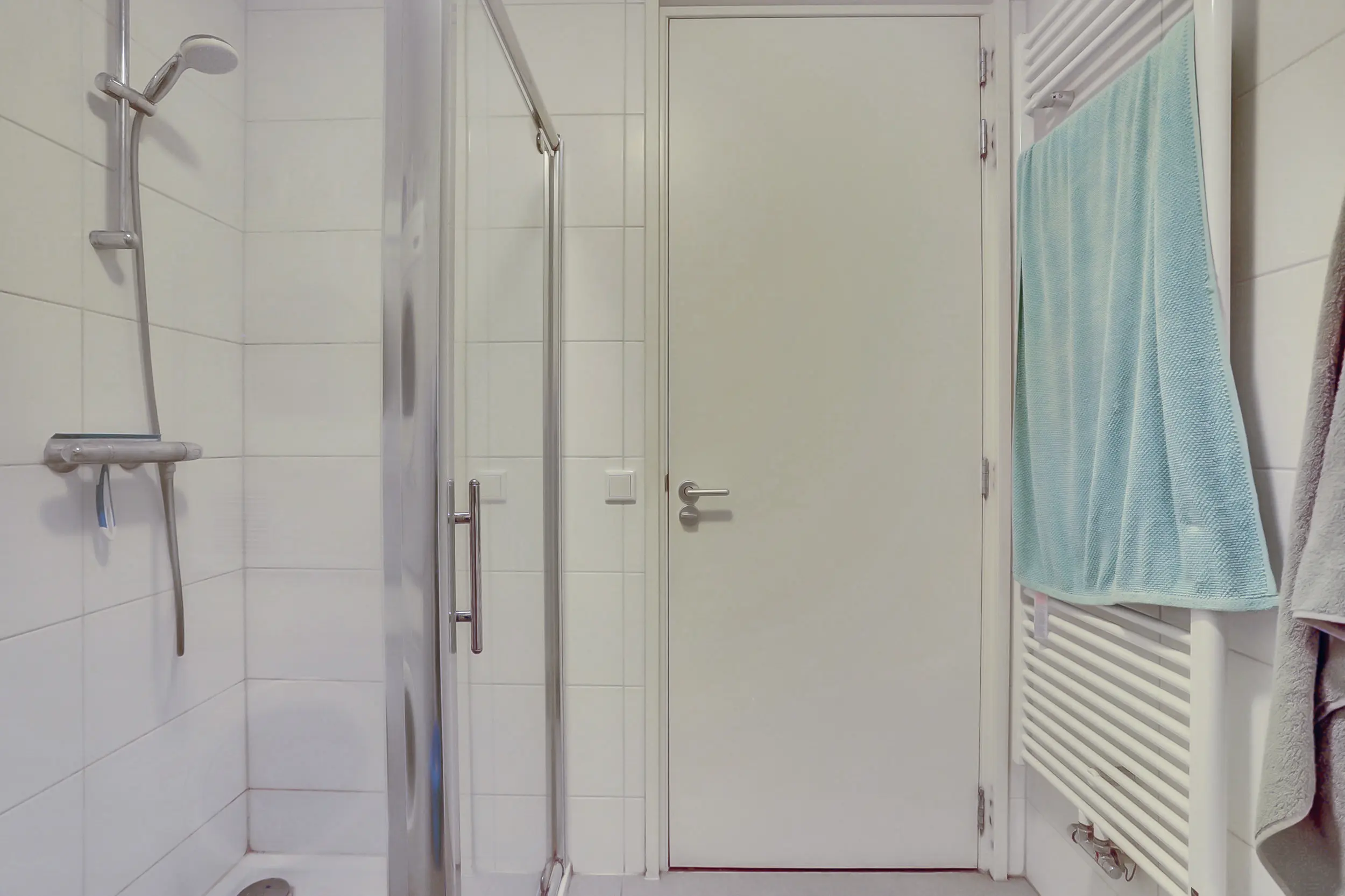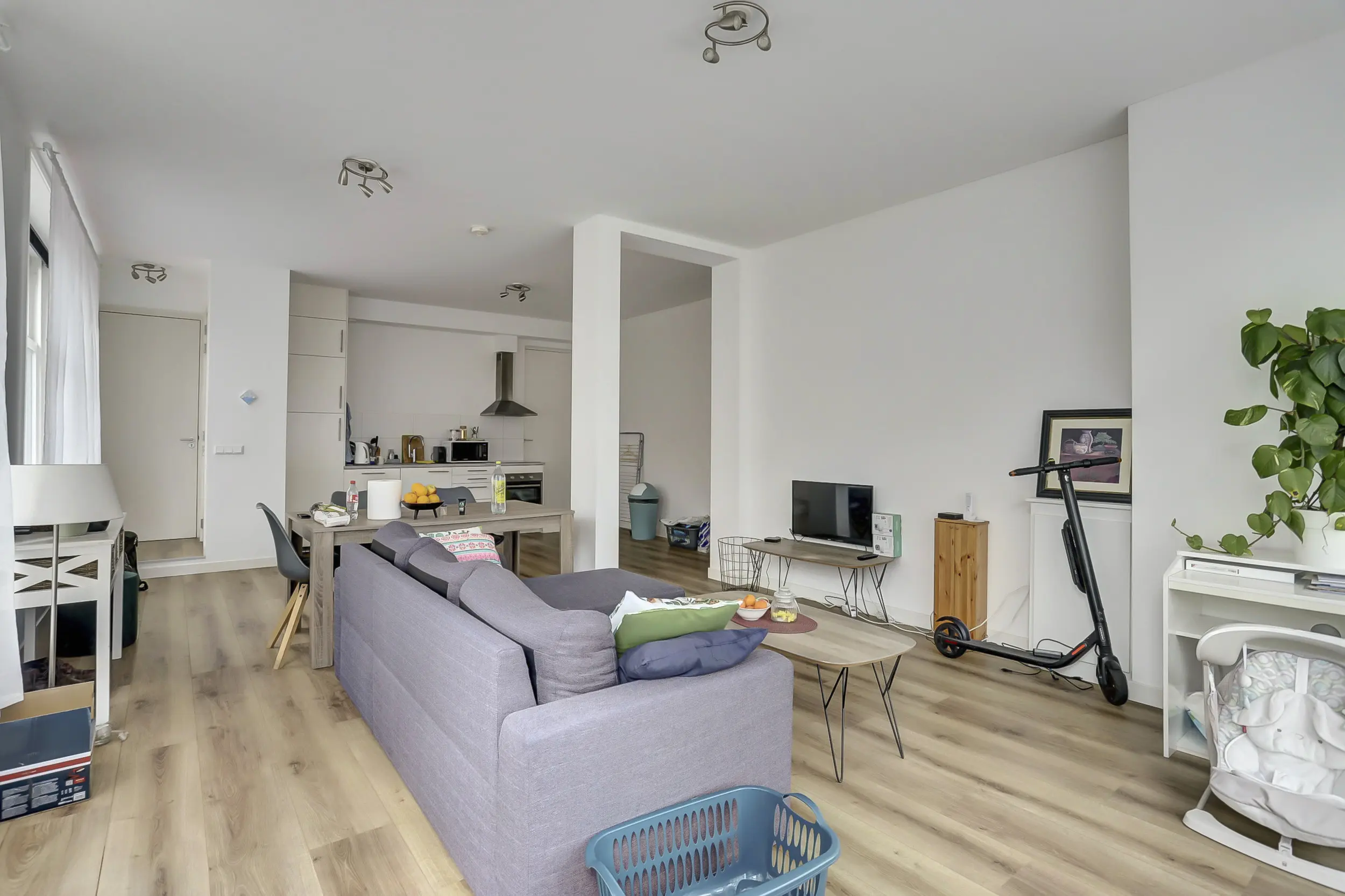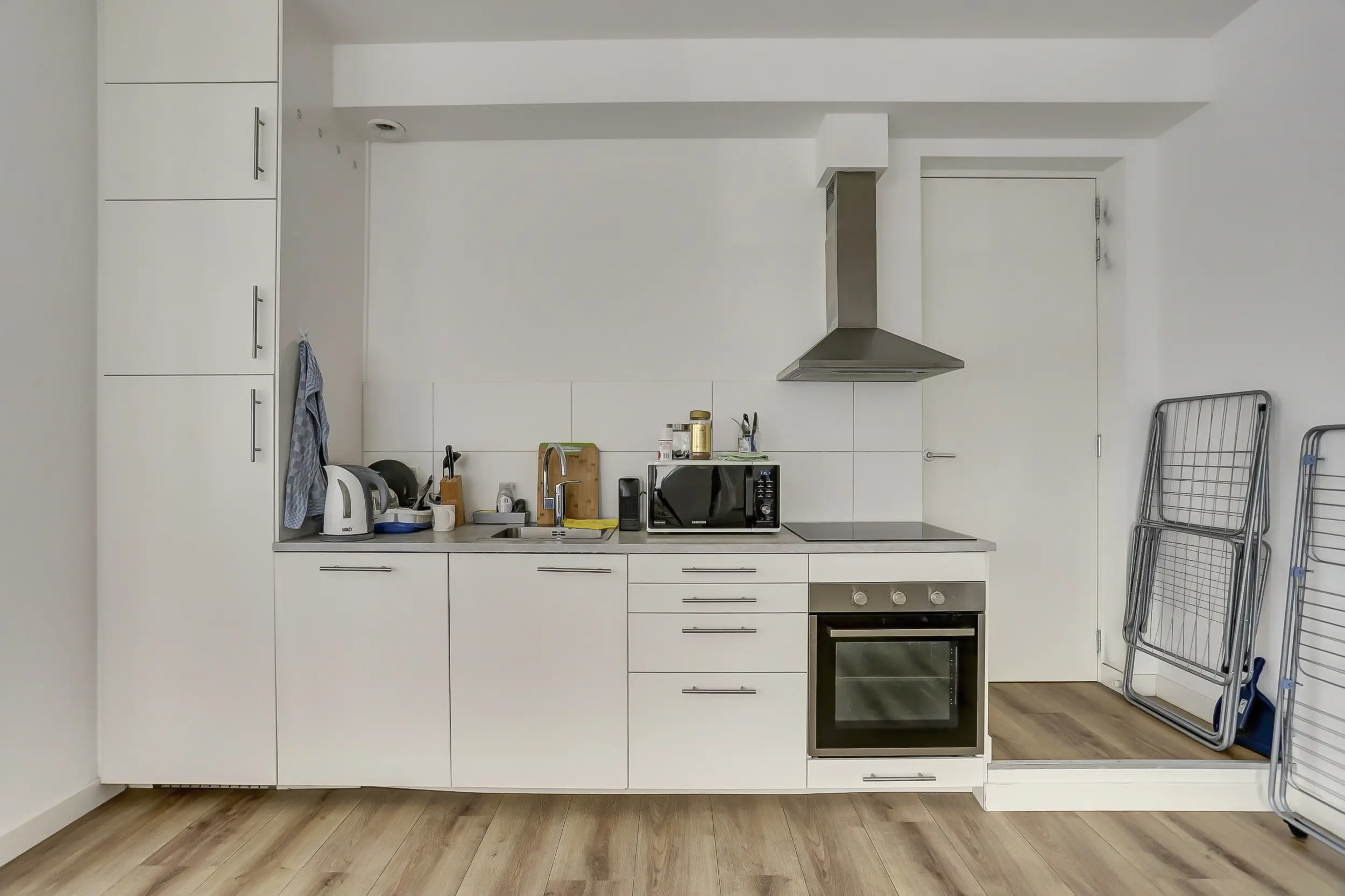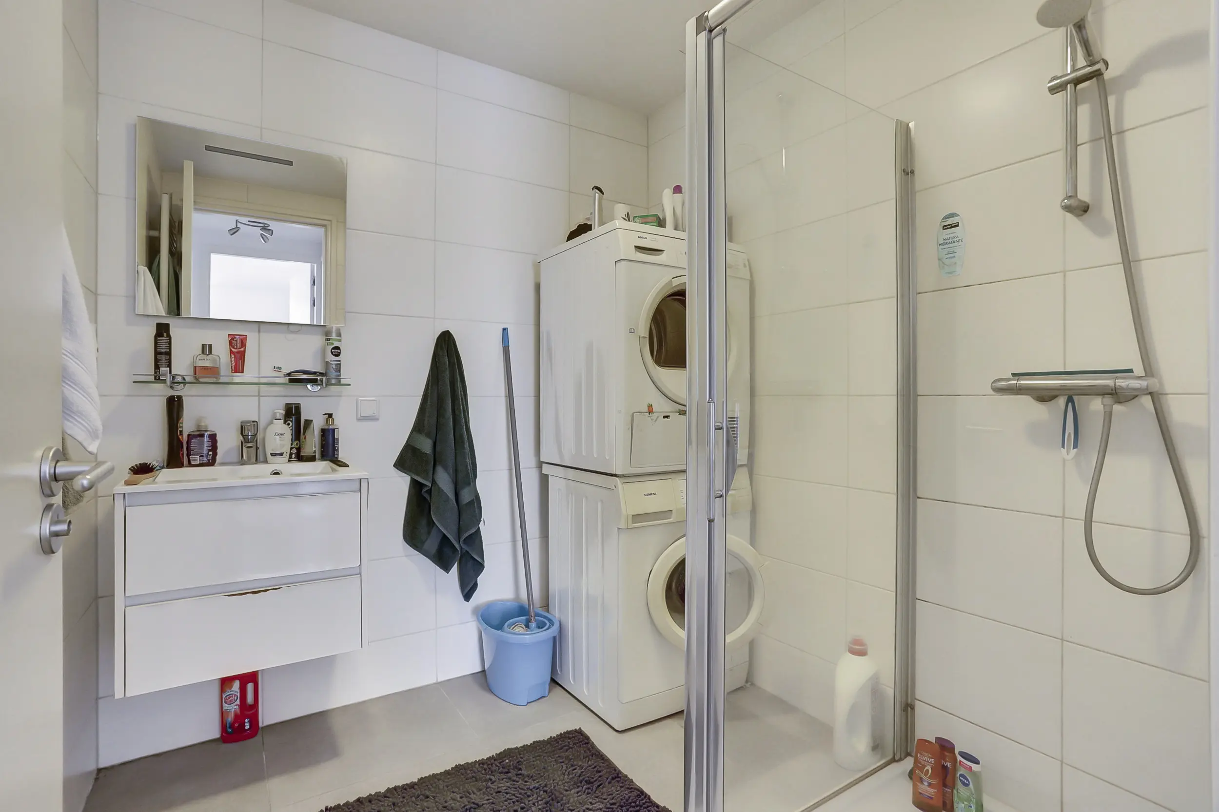 De woonkamer is voorzien van een moderne, strak witte open keuken met diverse inbouwapparatuur, waaronder een elektrische kookplaat, afzuigkap, oven, koel-vriescombinatie en vaatwasser. Vanuit de keuken is er toegang tot het separate toilet en de volledig betegelde badkamer, uitgerust met een inloopdouche, wastafelmeubel, radiator en aansluiting voor de wasmachine.