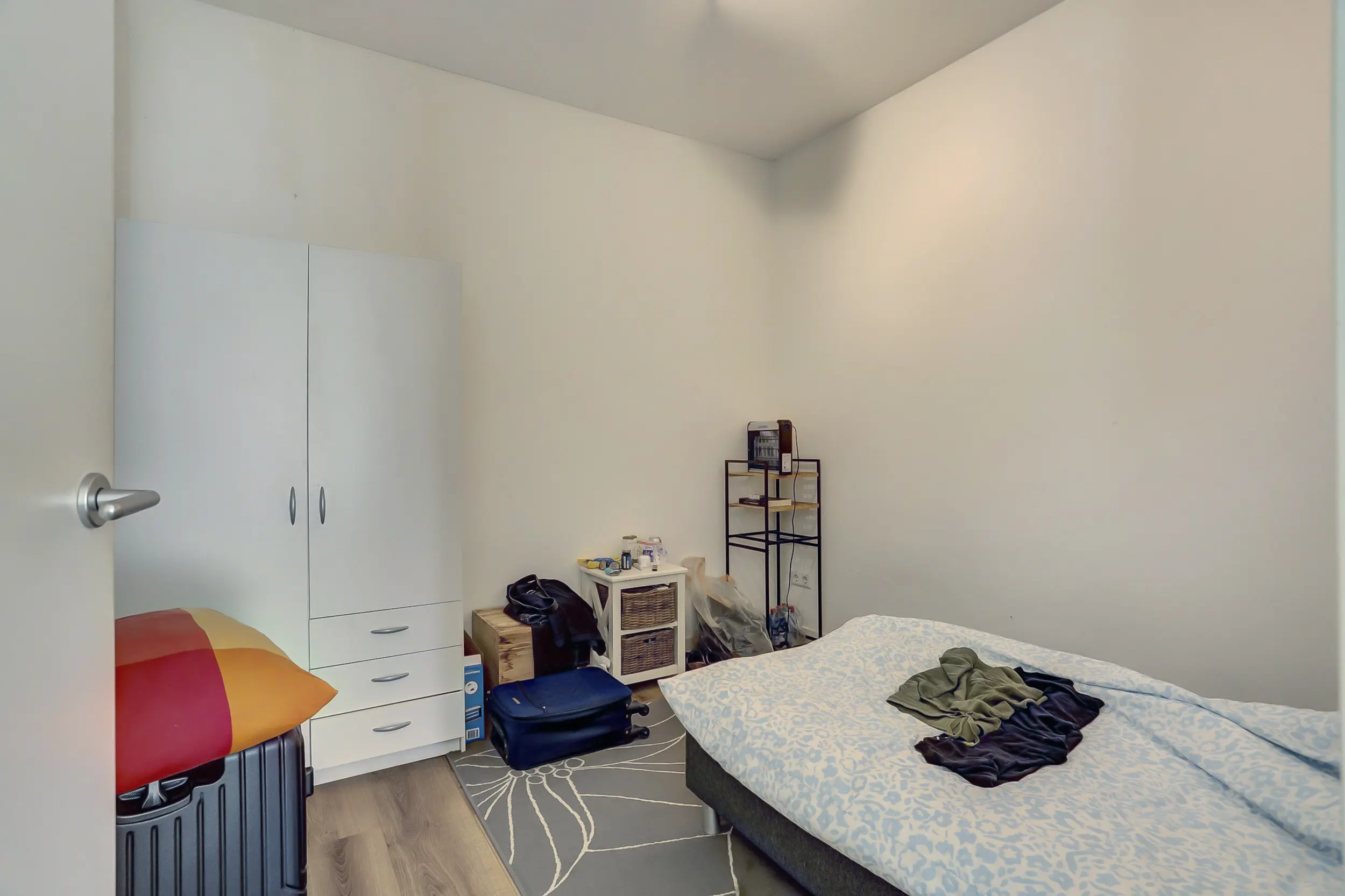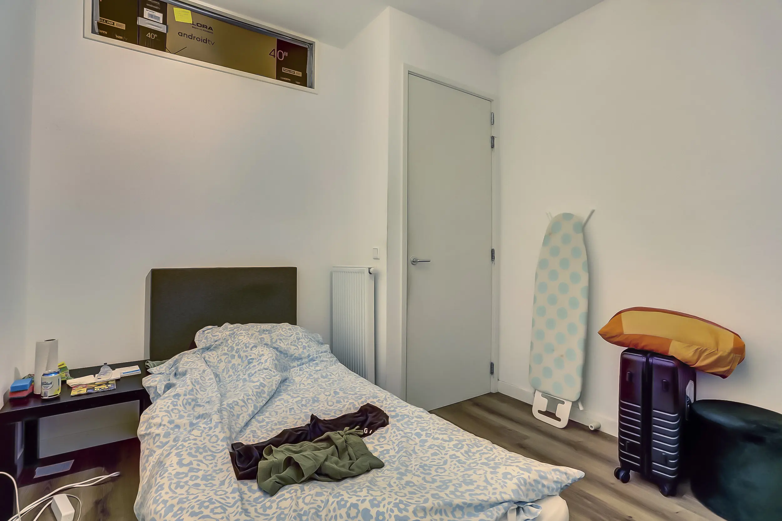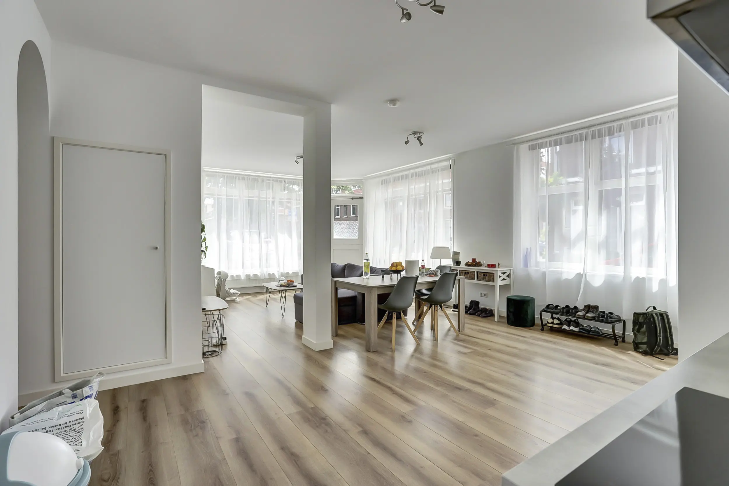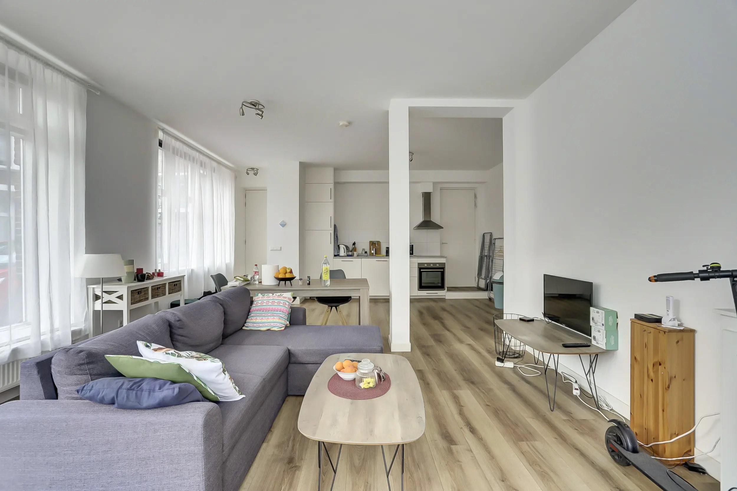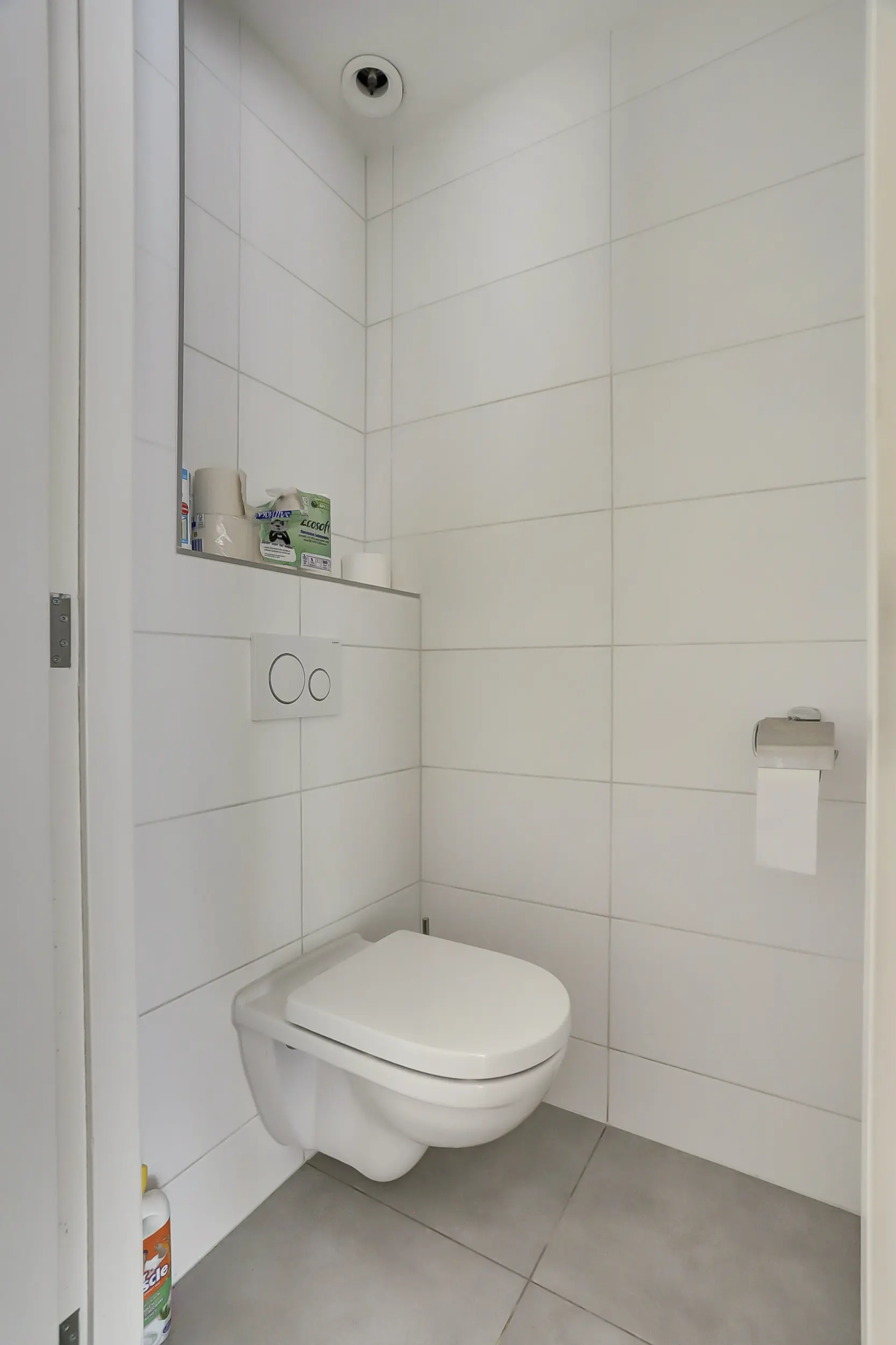 De woonkamer is voorzien van een moderne, strak witte open keuken met diverse inbouwapparatuur, waaronder een elektrische kookplaat, afzuigkap, oven, koel-vriescombinatie en vaatwasser. Vanuit de keuken is er toegang tot het separate toilet en de volledig betegelde badkamer, uitgerust met een inloopdouche, wastafelmeubel, radiator en aansluiting voor de wasmachine.