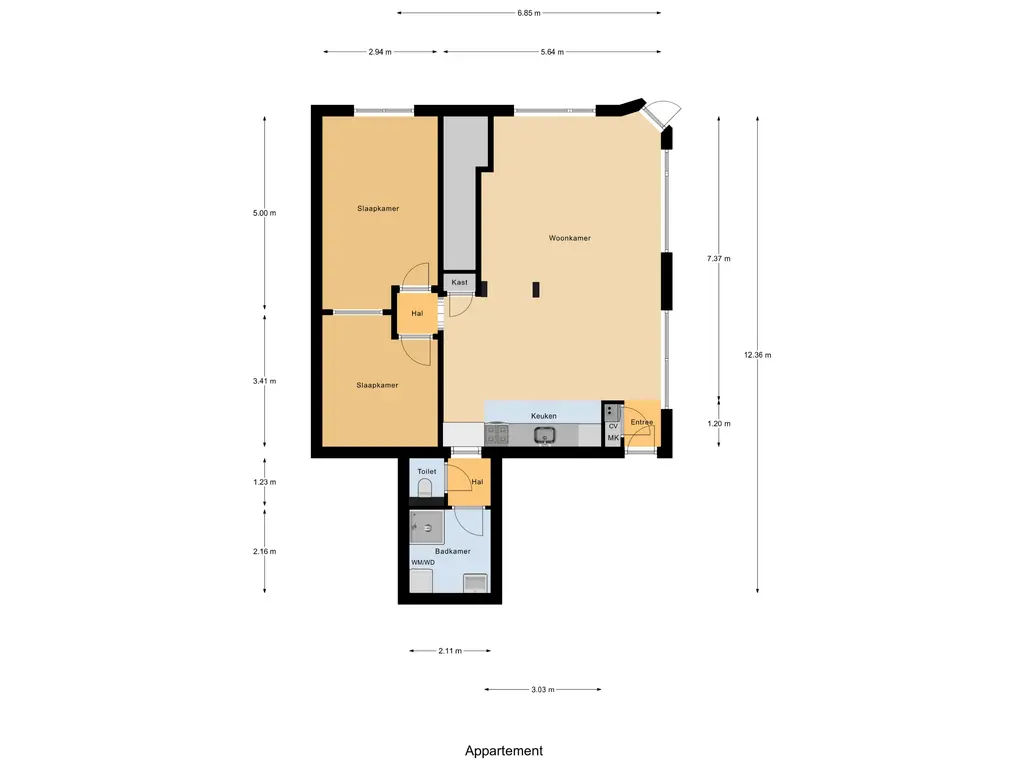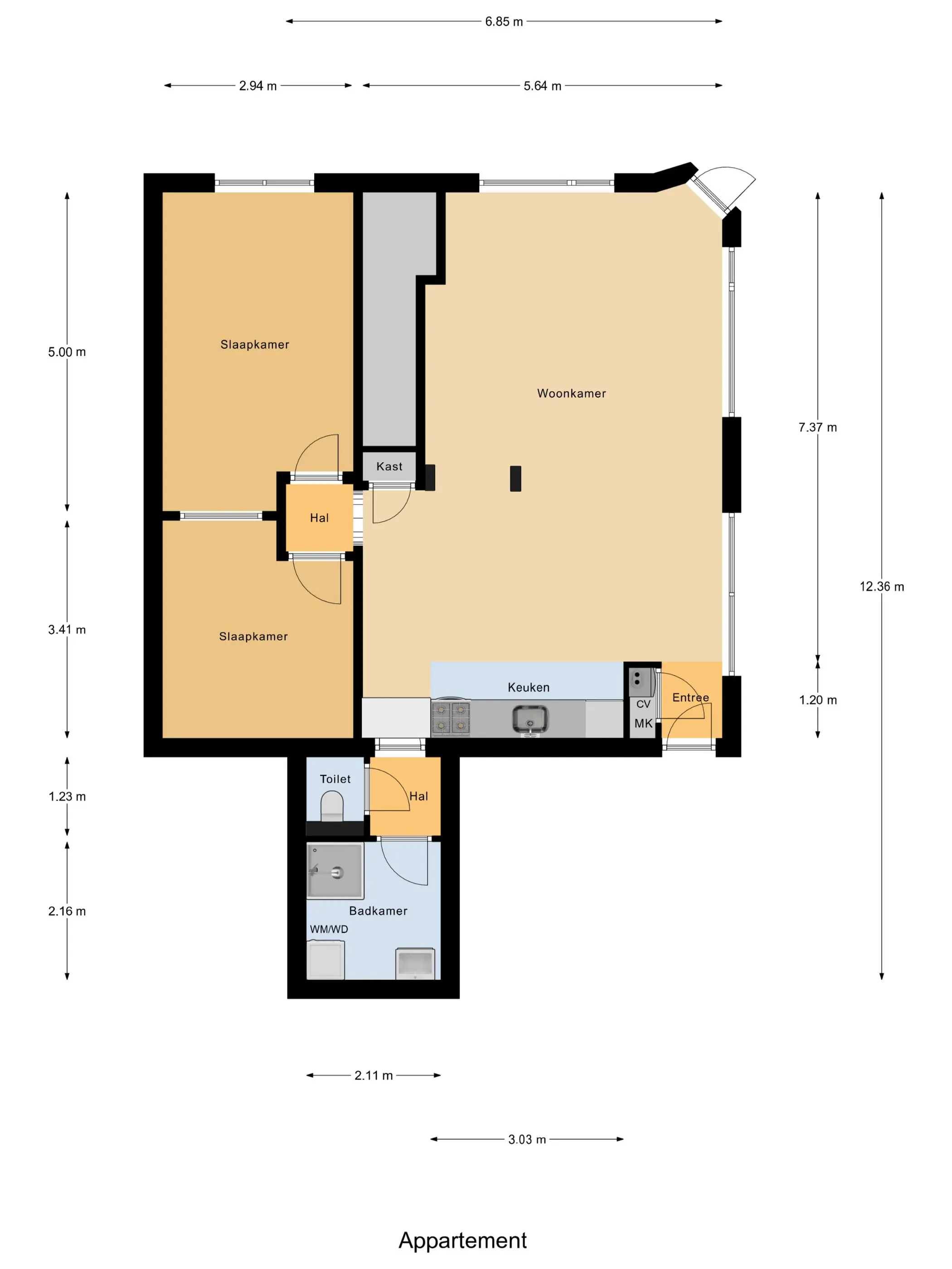 Via de gezamenlijke entree op de begane grond bereik je het appartement. Bij binnenkomst kom je in een compacte entreehal, die leidt naar de ruime en lichte woonkamer. Dankzij de hoekligging en de grote raampartijen valt er veel daglicht binnen, waardoor de ruimte open en luchtig aanvoelt.