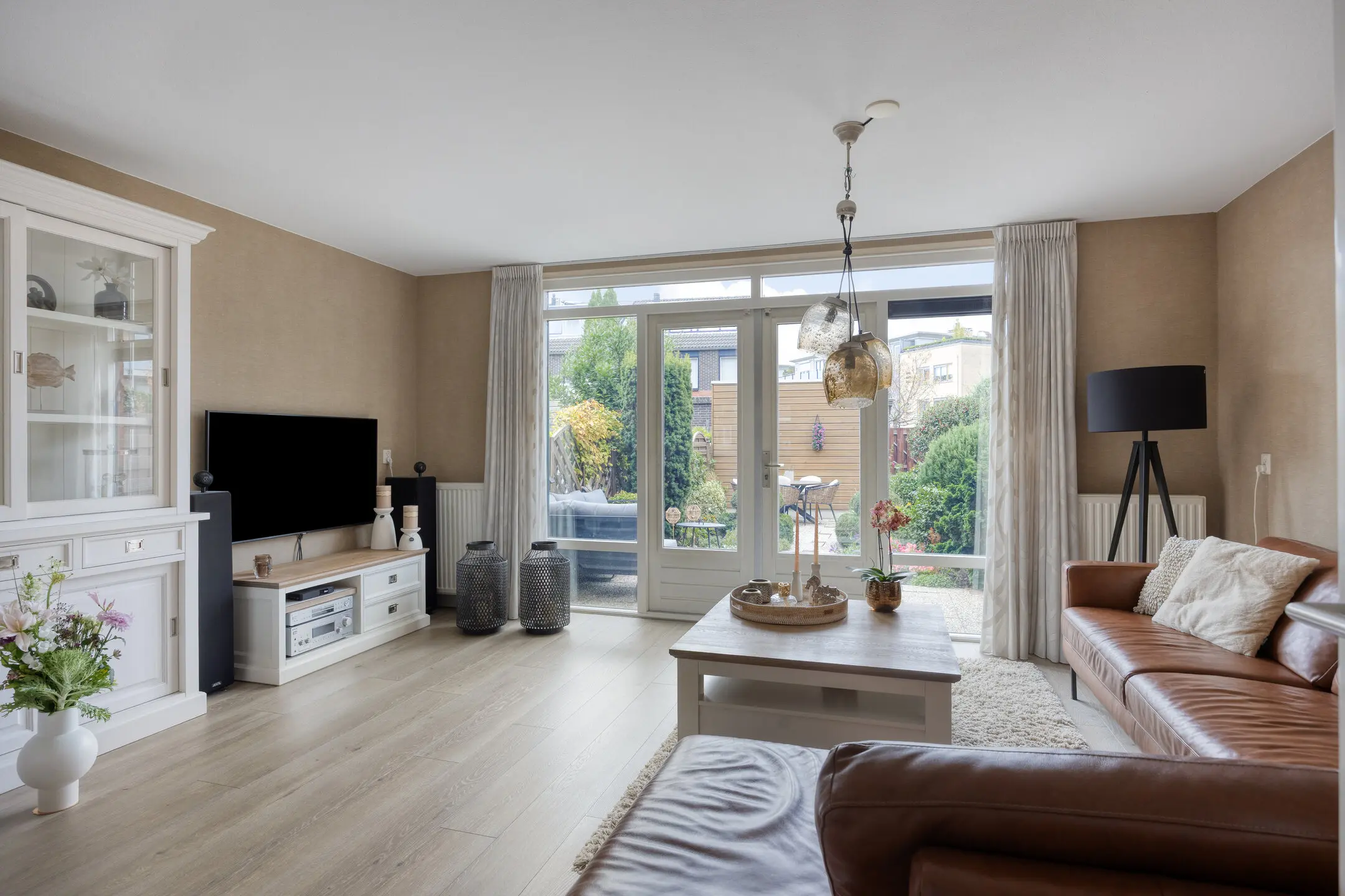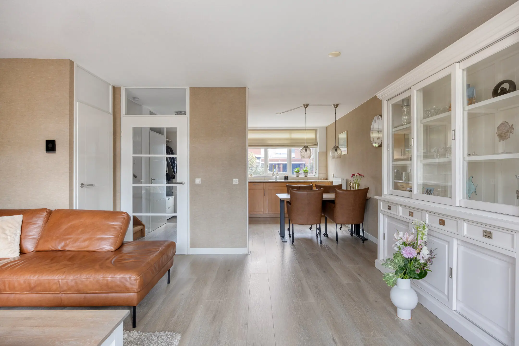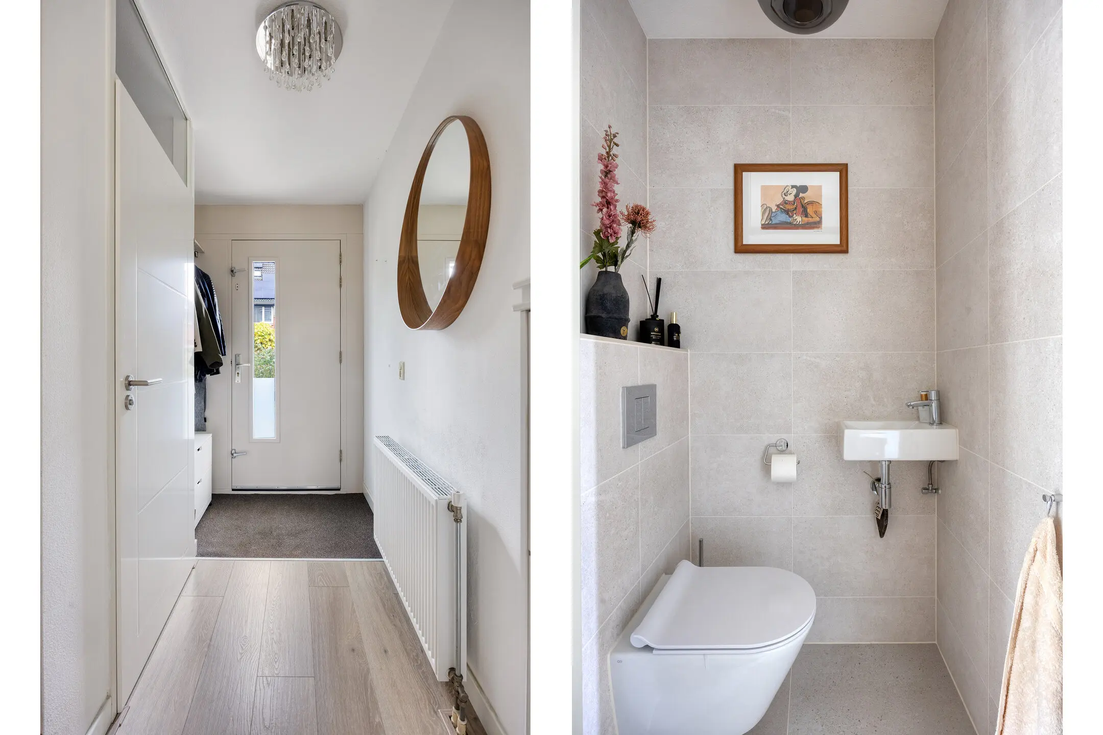 Entree, hal met meterkast en trapopgang. De geheel in lichte kleurstelling betegelde toiletruimte is gemoderniseerd in maart 2025. en is uitgerust met een wandcloset en fonteintje. Via een deur met glas inzet is de living bereikbaar, bestaande uit een open keuken aan de voorzijde en een tuingerichte woonkamer. De keuken is geplaatst in L-opstelling en is voorzien van een keramische kookplaat, RVS afzuigkap, vaatwasmachine, koel-/vriescombinatie, combi-oven en spoelbak onder het raam. In de gezellige woonkamer is een praktische trapkast aanwezig en de openslaande deuren geven toegang tot de achtertuin.
