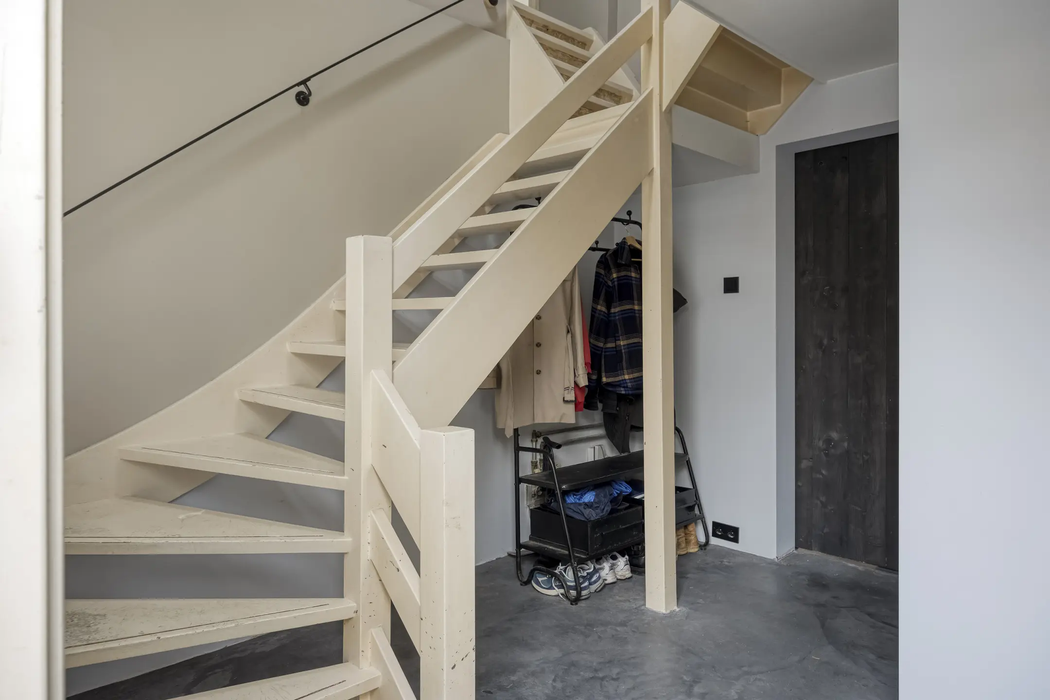 Via de entree/hal met trapopgang bereikt u de moderne toiletruimte met fonteintje.