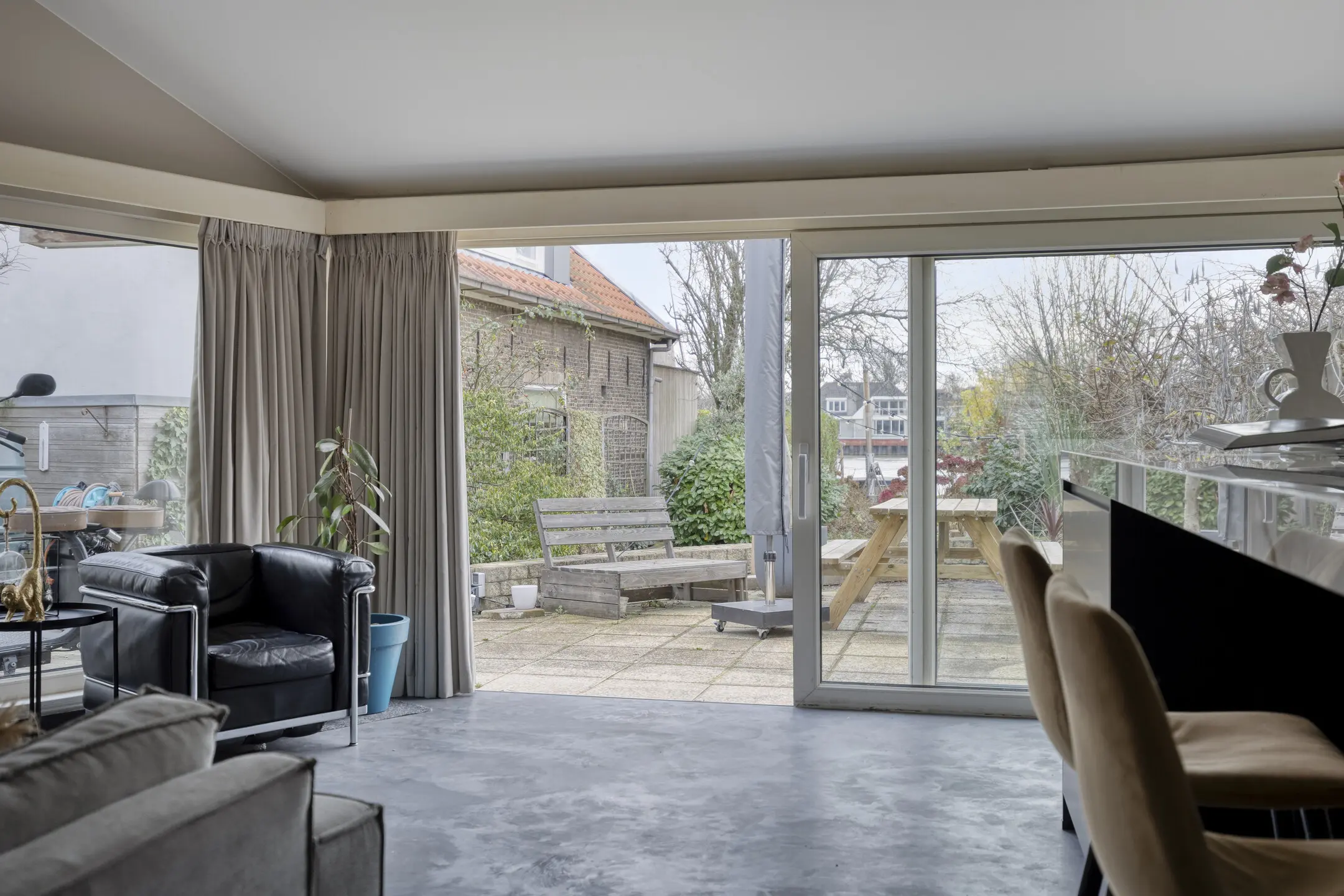 De begane grond beschikt over twee met elkaar verbonden woonkamers, wat zorgt voor een open en ruimtelijk gevoel. De woonkamer kenmerkt zich door een prettige lichtinval en een fraai uitzicht op de tuin en het water.
