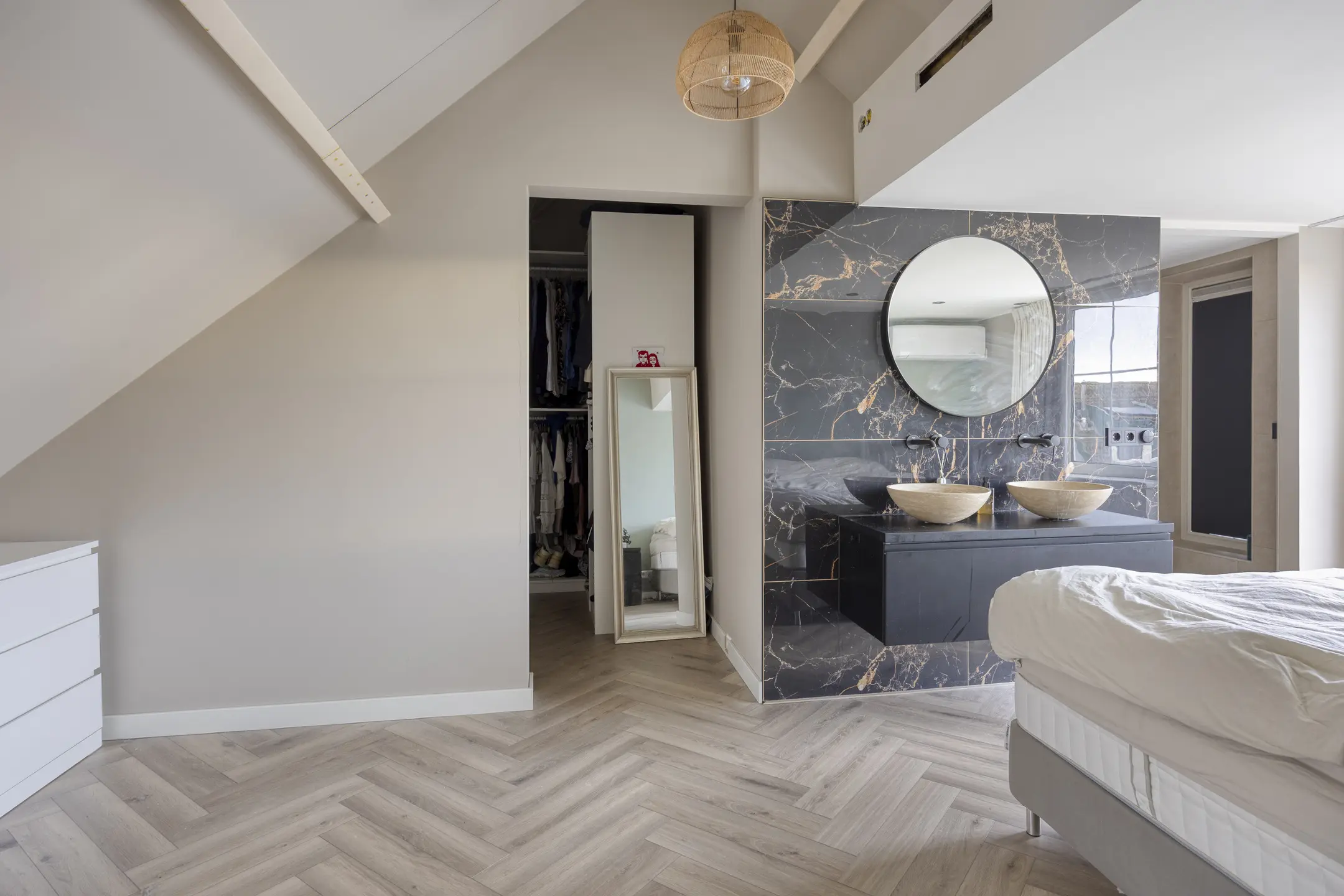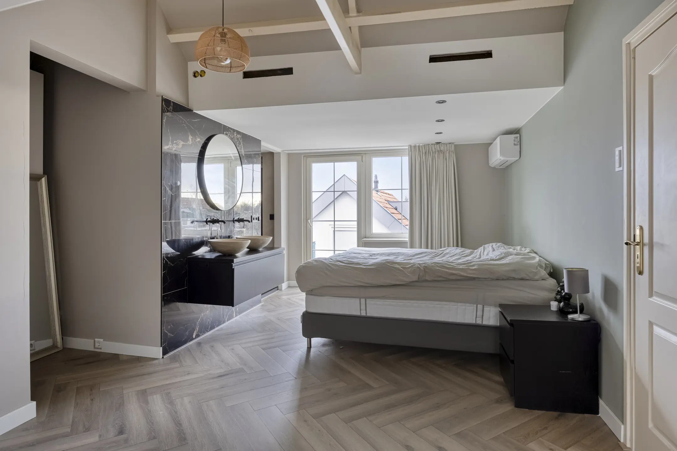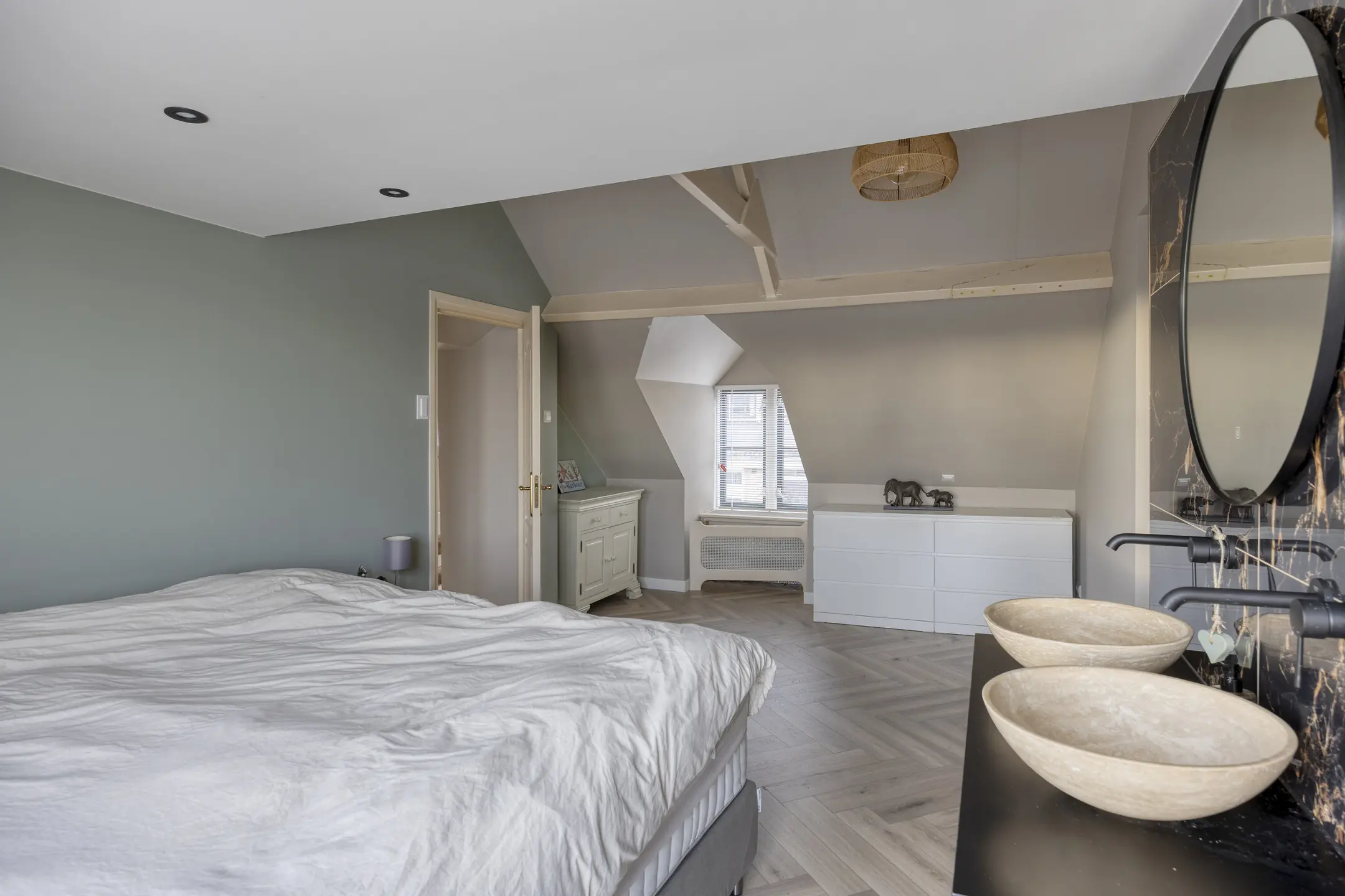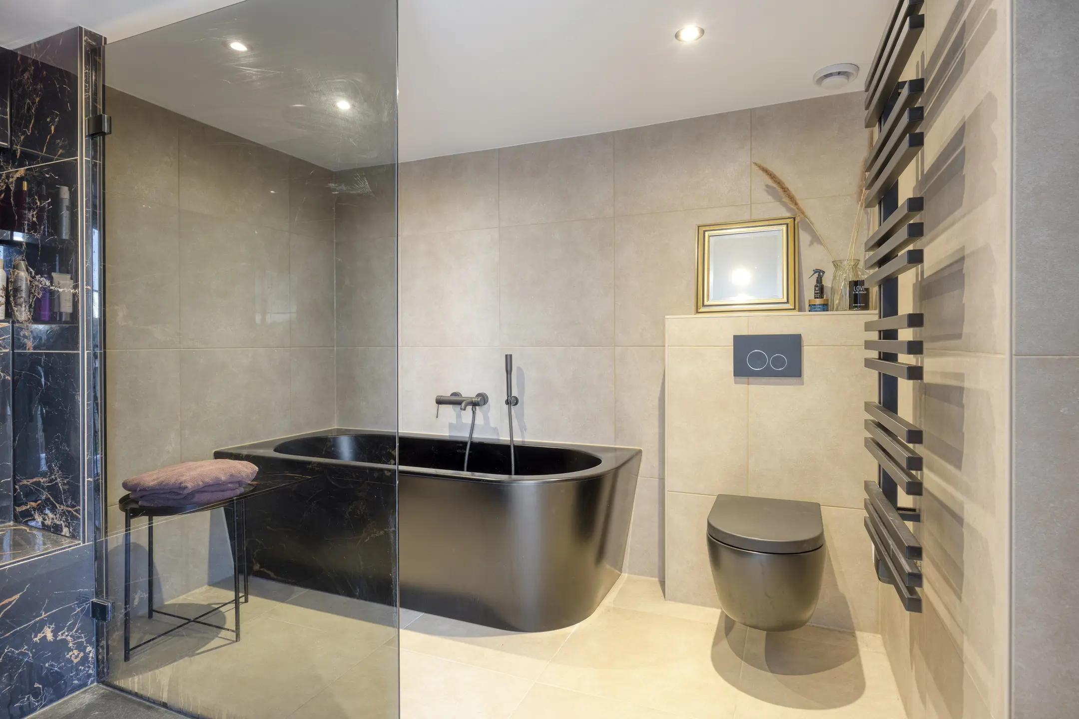 De ensuite badkamer is voorzien van een ligbad, inloopdouche met rookglazen douchewand, wandcloset, radiator en wastafelmeubel met dubbele waskommen.