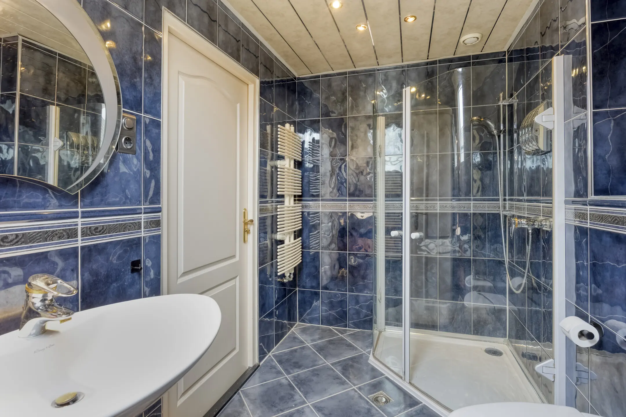 De tweede badkamer beschikt over een douchecabine, wastafel, wandcloset, radiator en bidet.