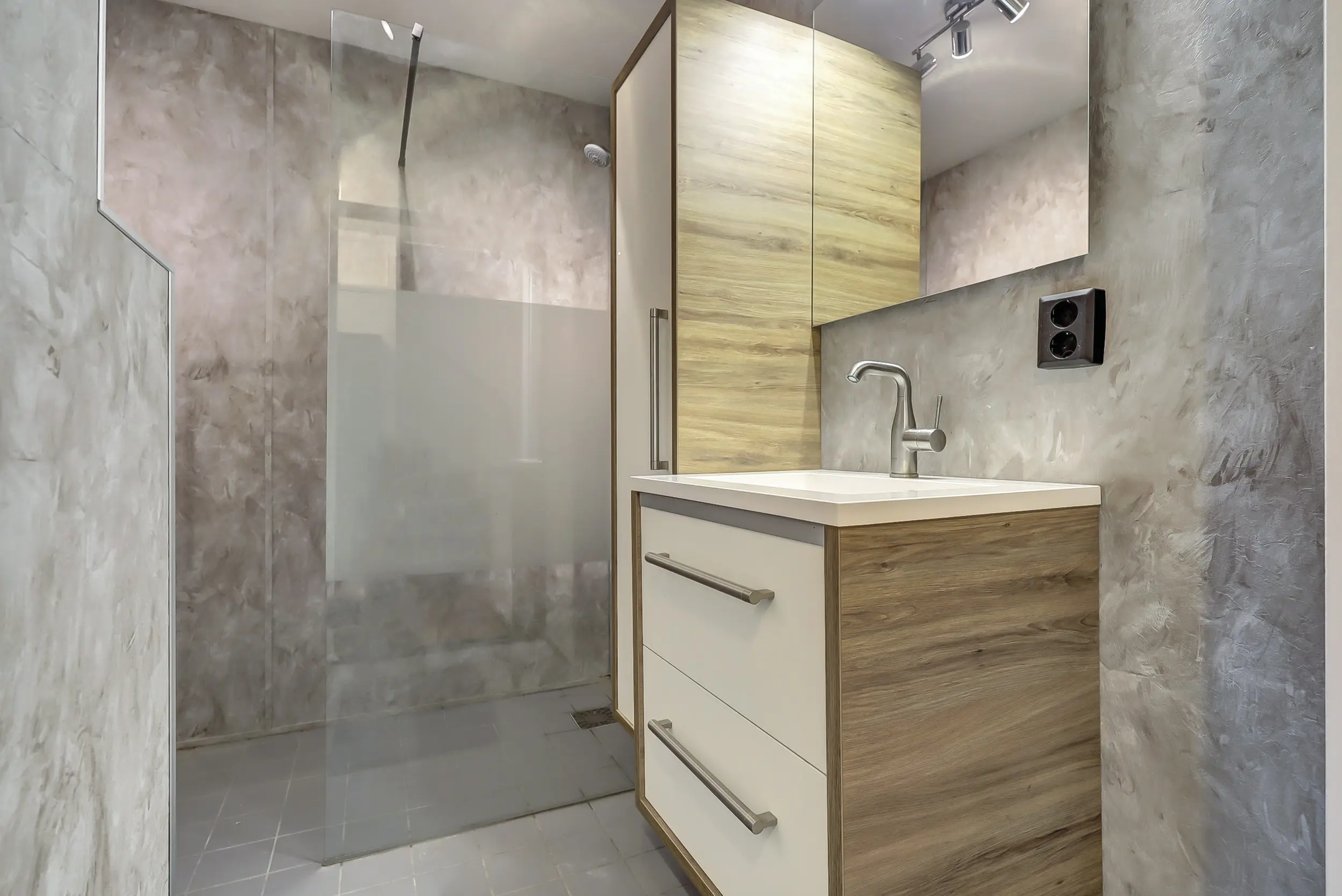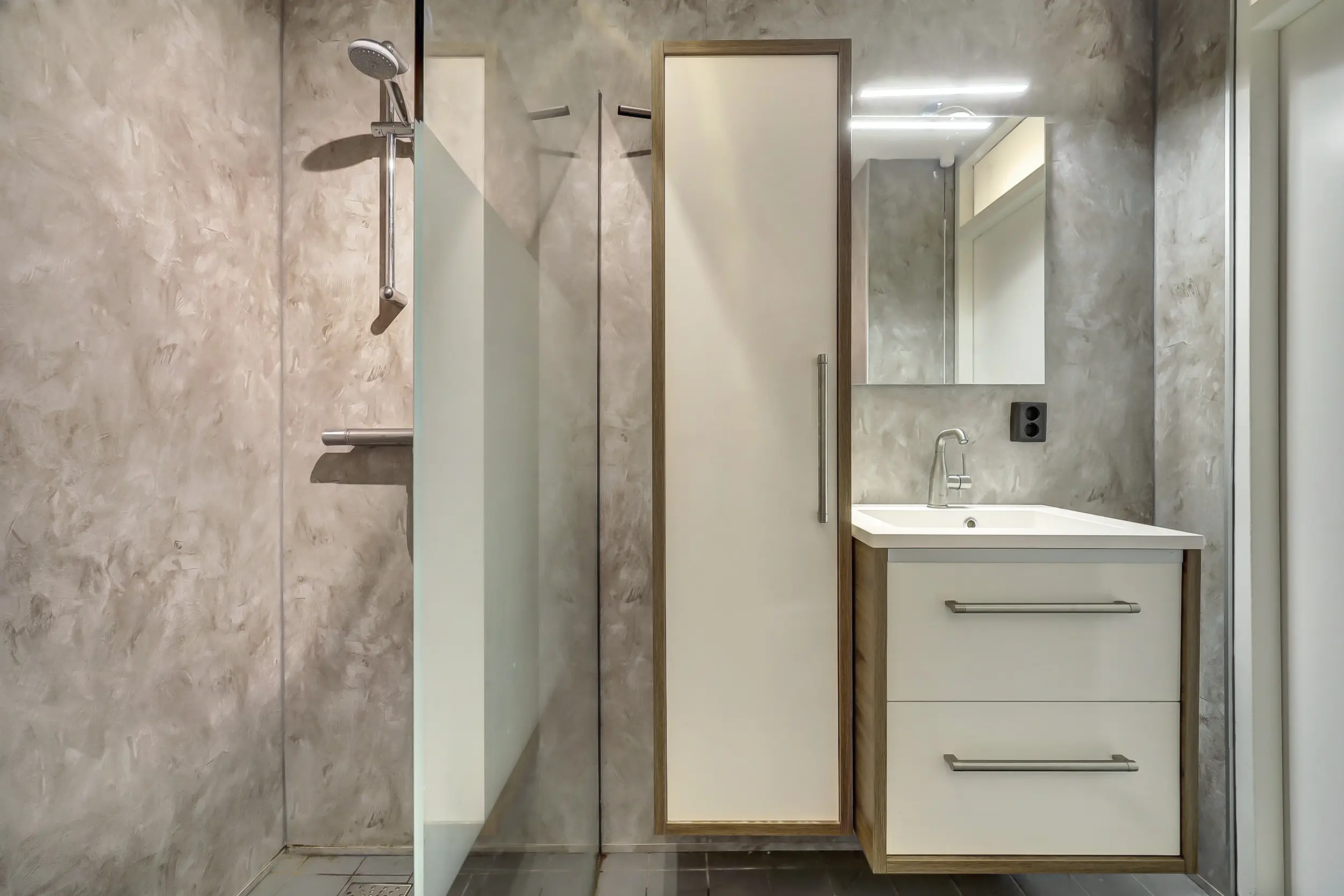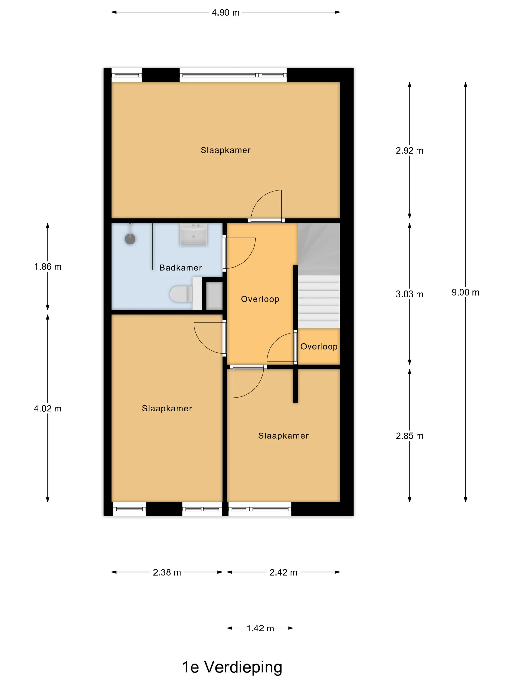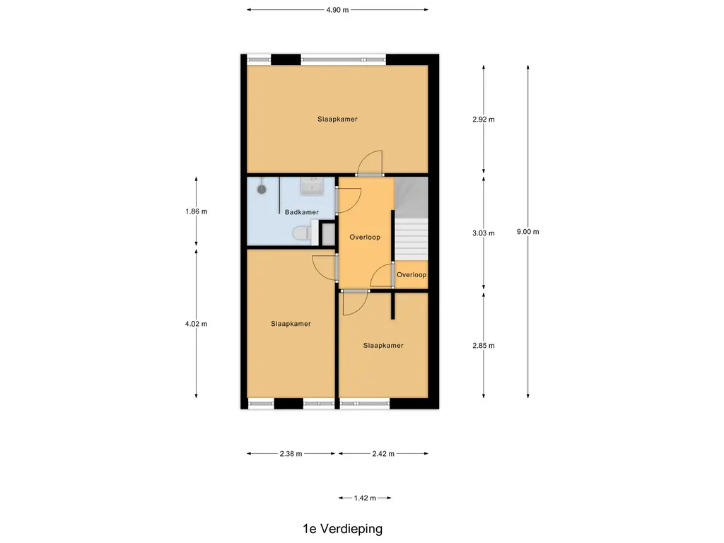 Via de trap in de woonkeuken kom je op de overloop met toegang tot drie slaapkamers en badkamer. Momenteel is de kleinste slaapkamer in gebruik als hobbykamer. De master bedroom is aan de achterzijde gelegen. De badkamer heeft een betegelde vloer met wandpanelen en is uitgerust met een douchehoek, wastafelmeubel en een toilet. De beide slaapkamers hebben laminaat vloeren en een airco voor verwarmen en koelen.