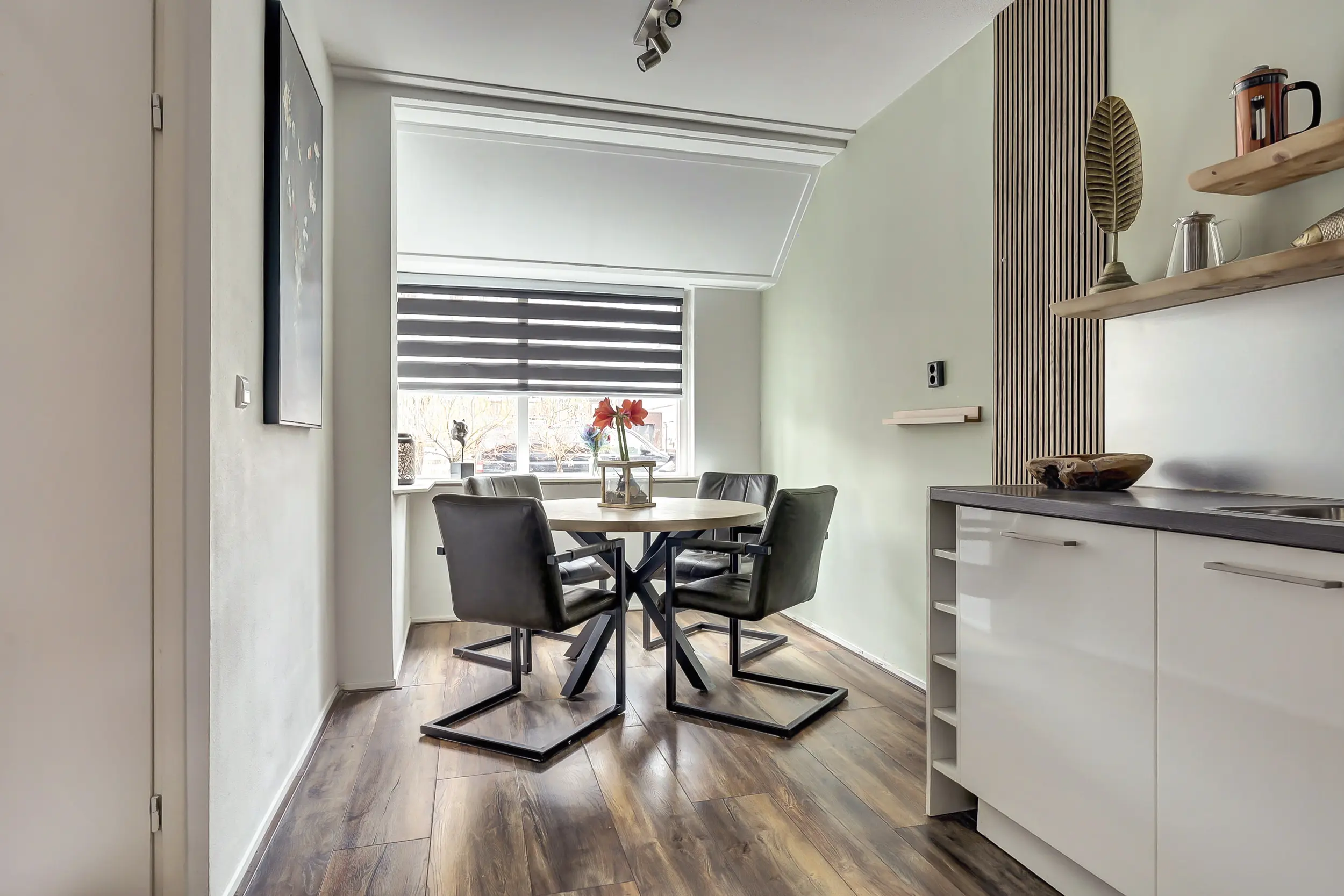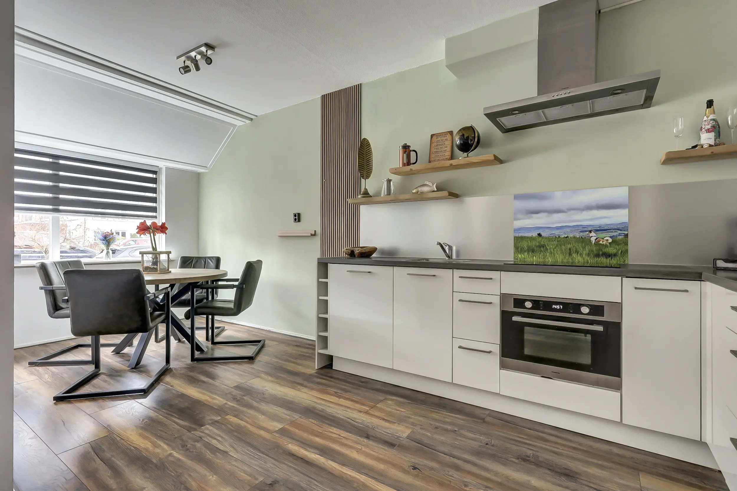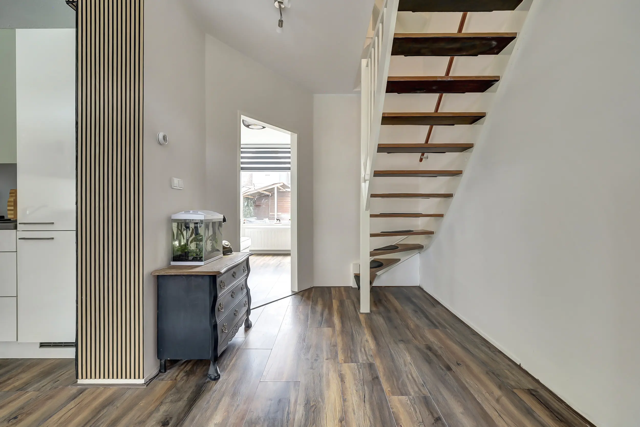 Entree met betegelde toiletruimte met fonteintje. Ruime lichte woonkeuken in hoekopstelling met inbouwapparatuur gelegen aan de voorzijde van de woning en voorzien van een laminaat vloer. Alle apparatuur die je nodig hebt is aanwezig: een inductiekookplaat, afzuigkap, vaatwasser en combi-oven. De woonkamer is sfeervol en aan de tuinzijde gelegen. De woonkamer heeft een tuindeur en laminaat vloer. Voor verwarming zijn radiatoren aanwezig alsmede een airco.