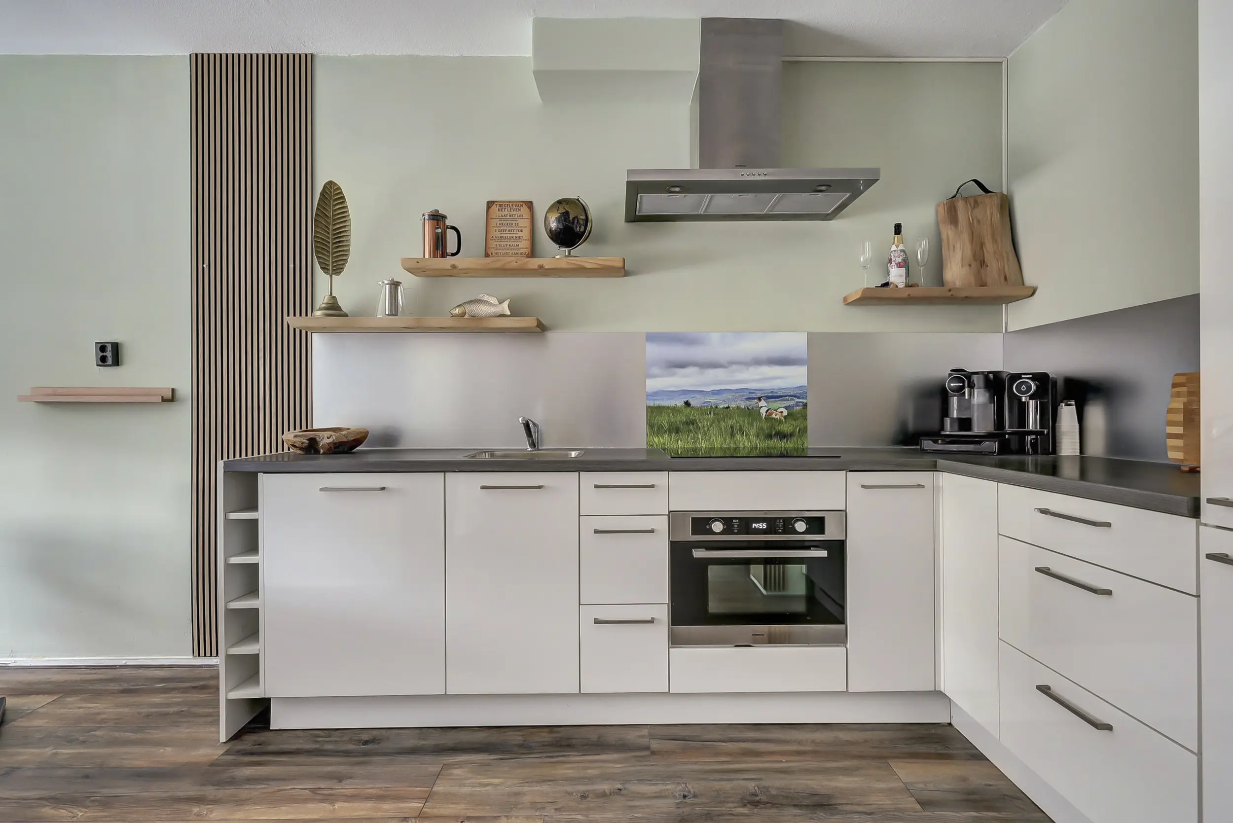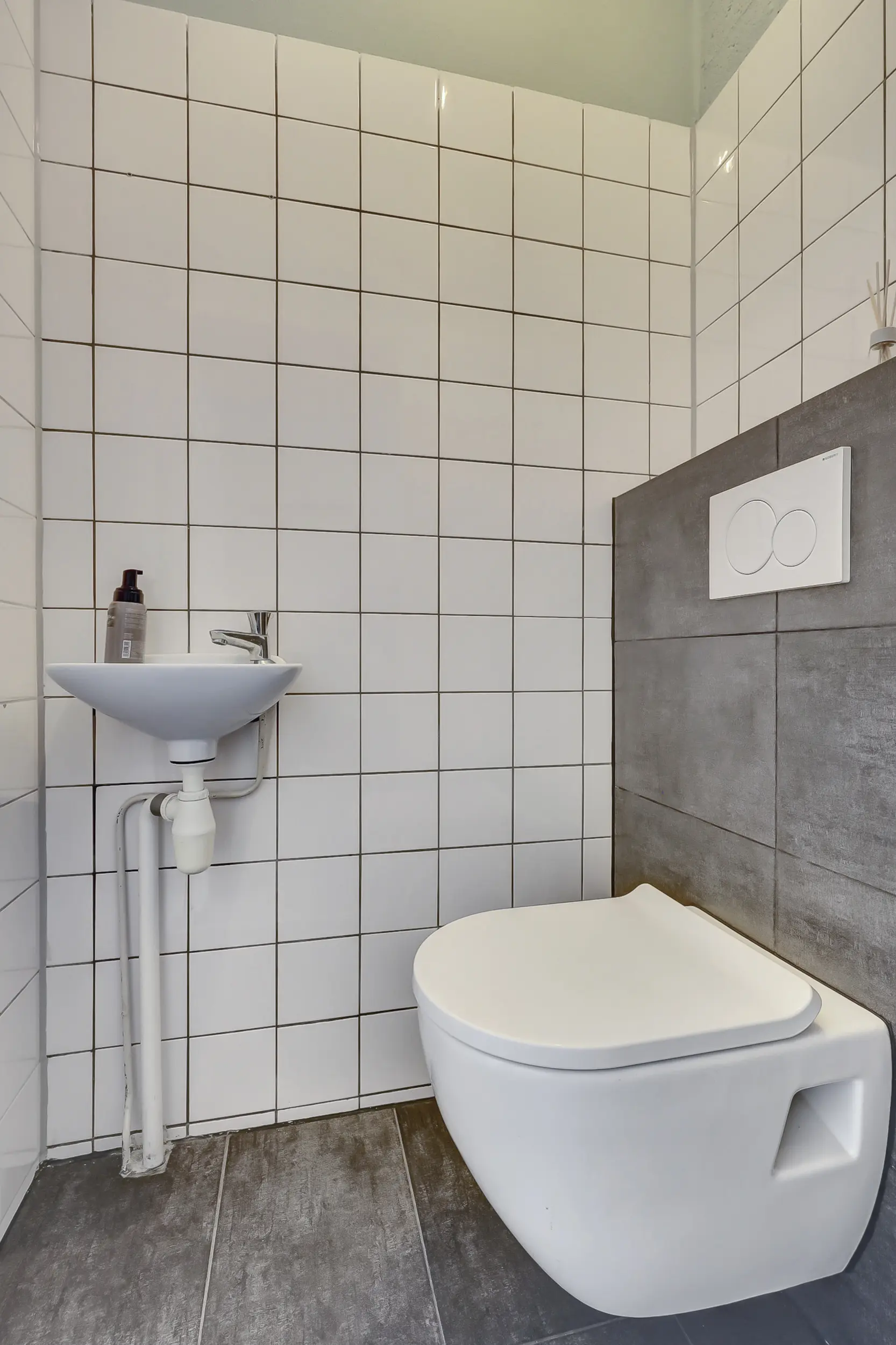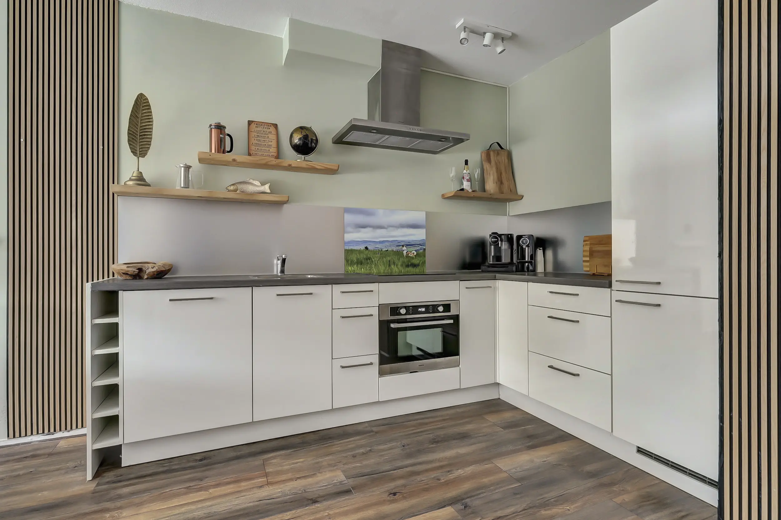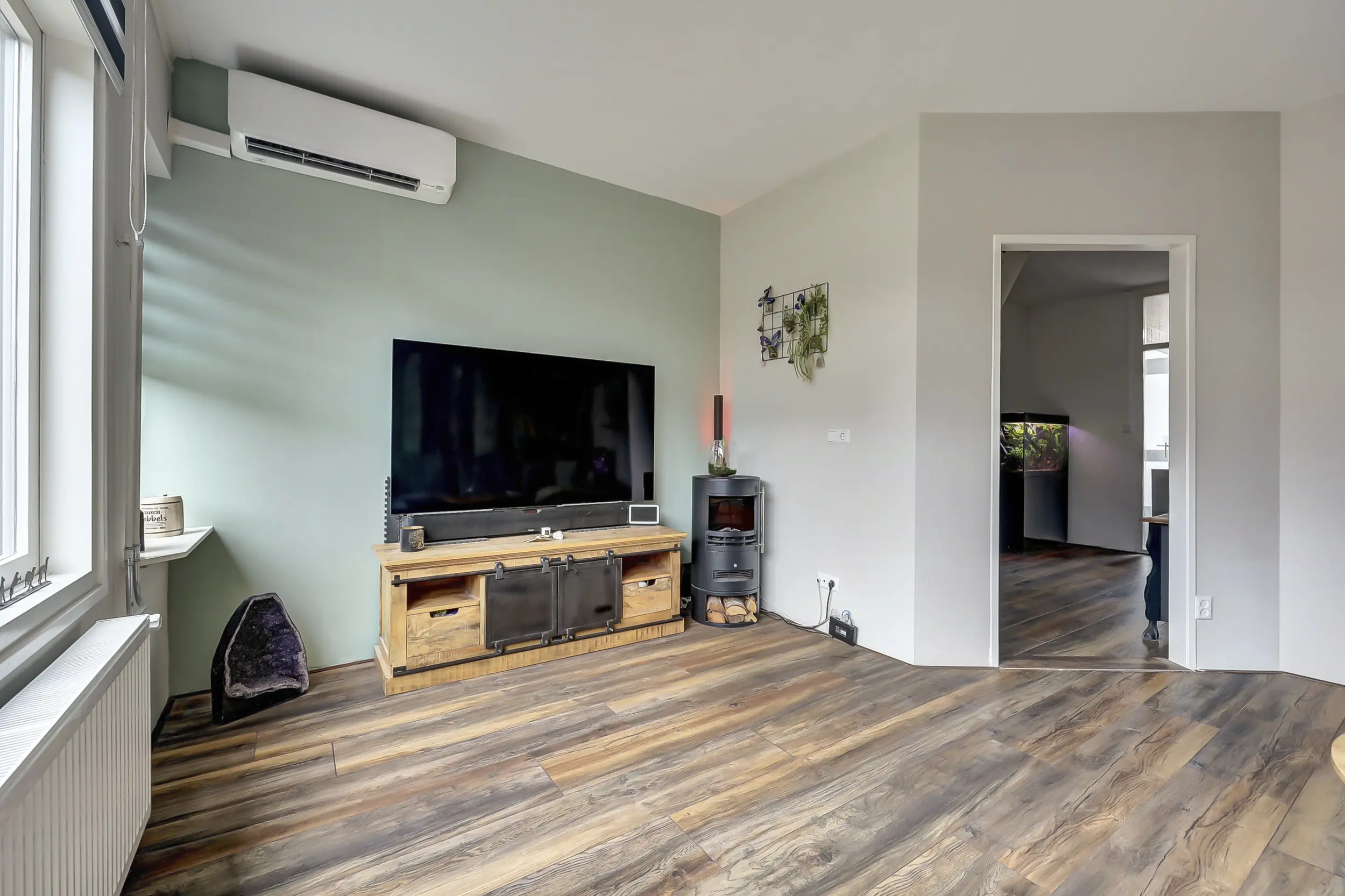 Entree met betegelde toiletruimte met fonteintje. Ruime lichte woonkeuken in hoekopstelling met inbouwapparatuur gelegen aan de voorzijde van de woning en voorzien van een laminaat vloer. Alle apparatuur die je nodig hebt is aanwezig: een inductiekookplaat, afzuigkap, vaatwasser en combi-oven. De woonkamer is sfeervol en aan de tuinzijde gelegen. De woonkamer heeft een tuindeur en laminaat vloer. Voor verwarming zijn radiatoren aanwezig alsmede een airco.