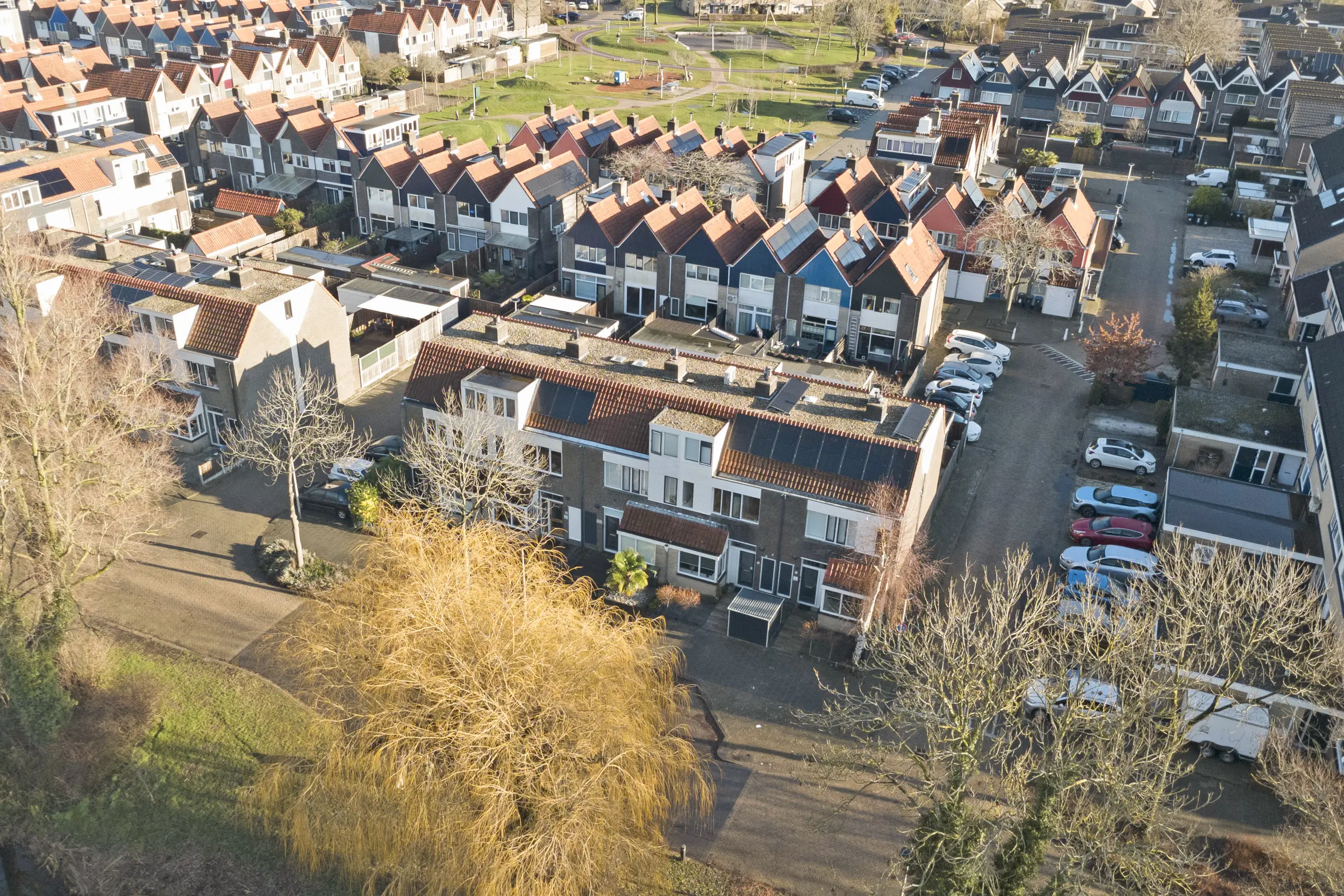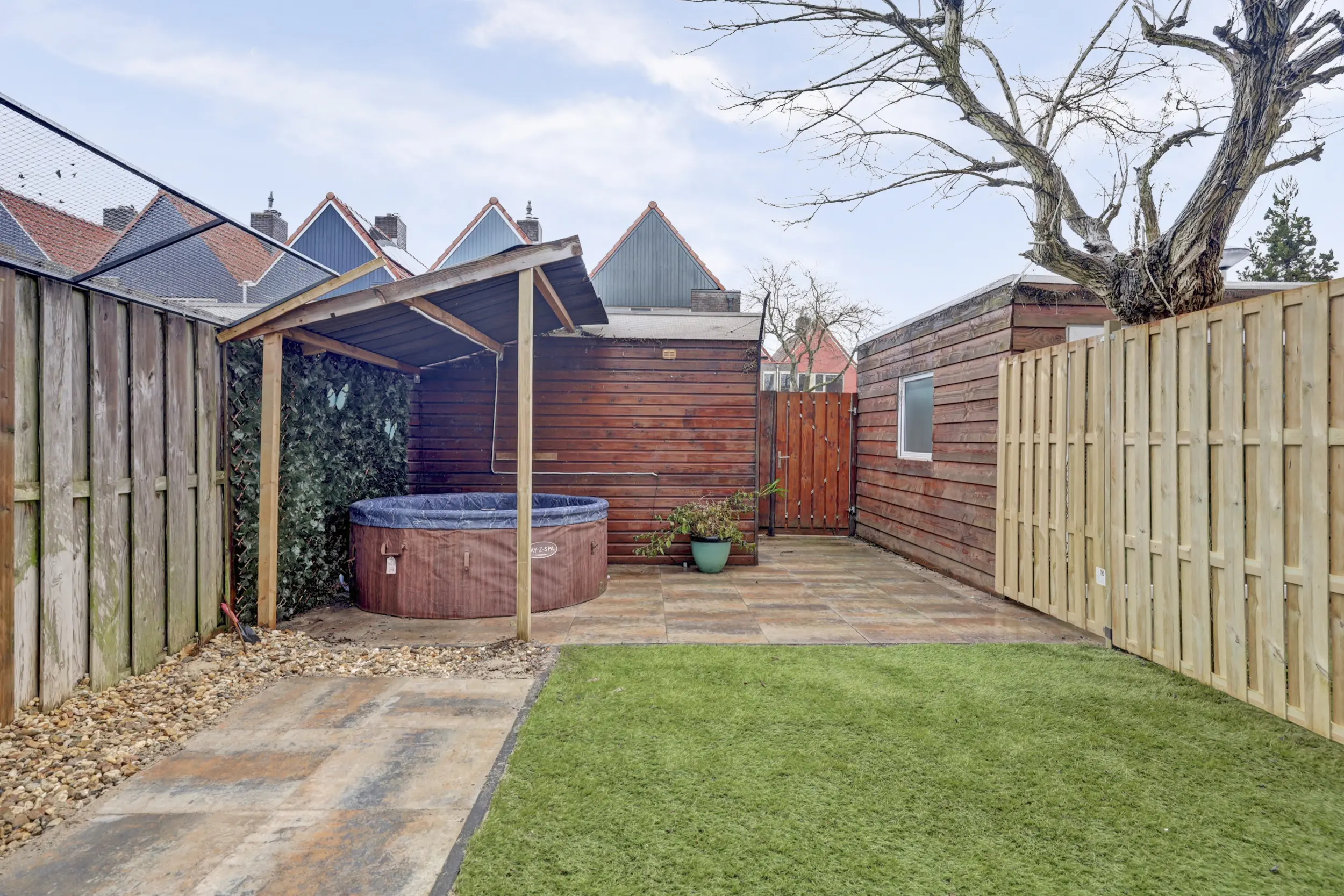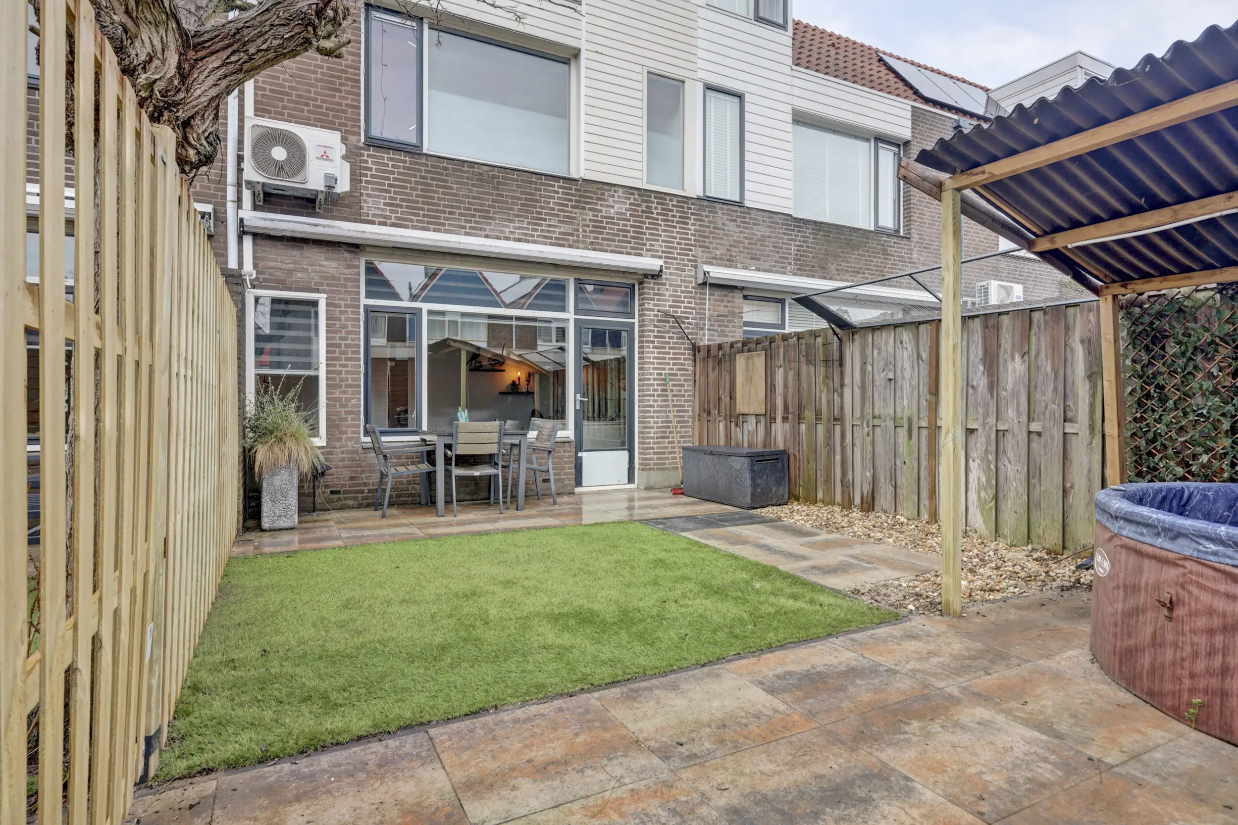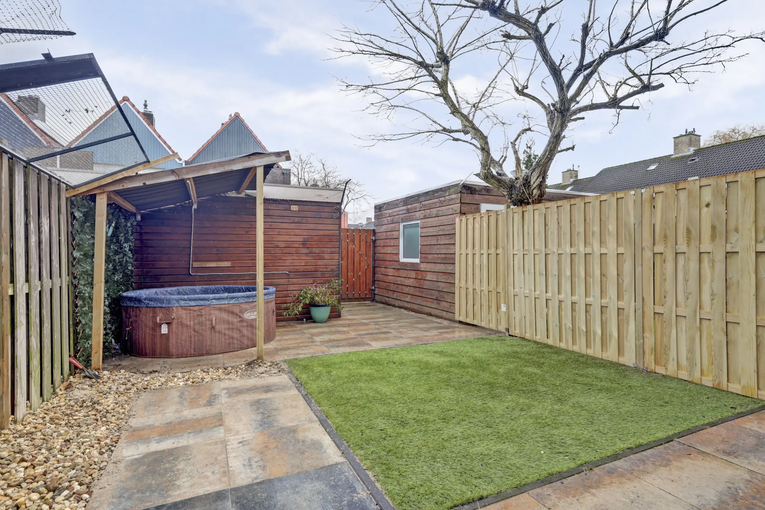 Achter de woning vind je een fijne tuin met borders, een terras en een houten berging. Aan de achtergevel is een zonwering aanwezig. Tevens kun je via de poort aan de achterzijde via het pad naar de openbare weg. In de directe omgeving is voldoende plaats om te parkeren. Aan de voorzijde is de tuin voorzien van bestrating.