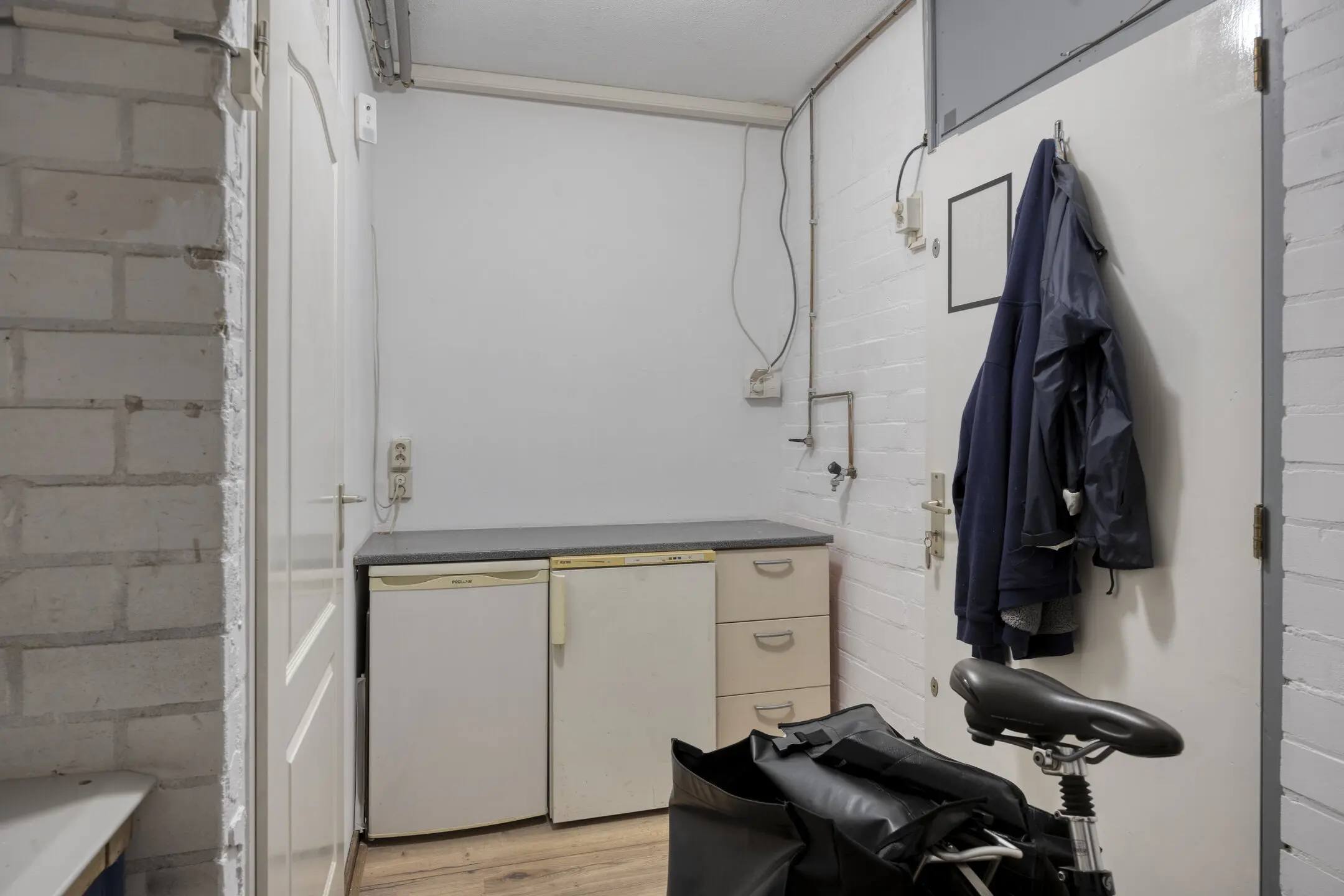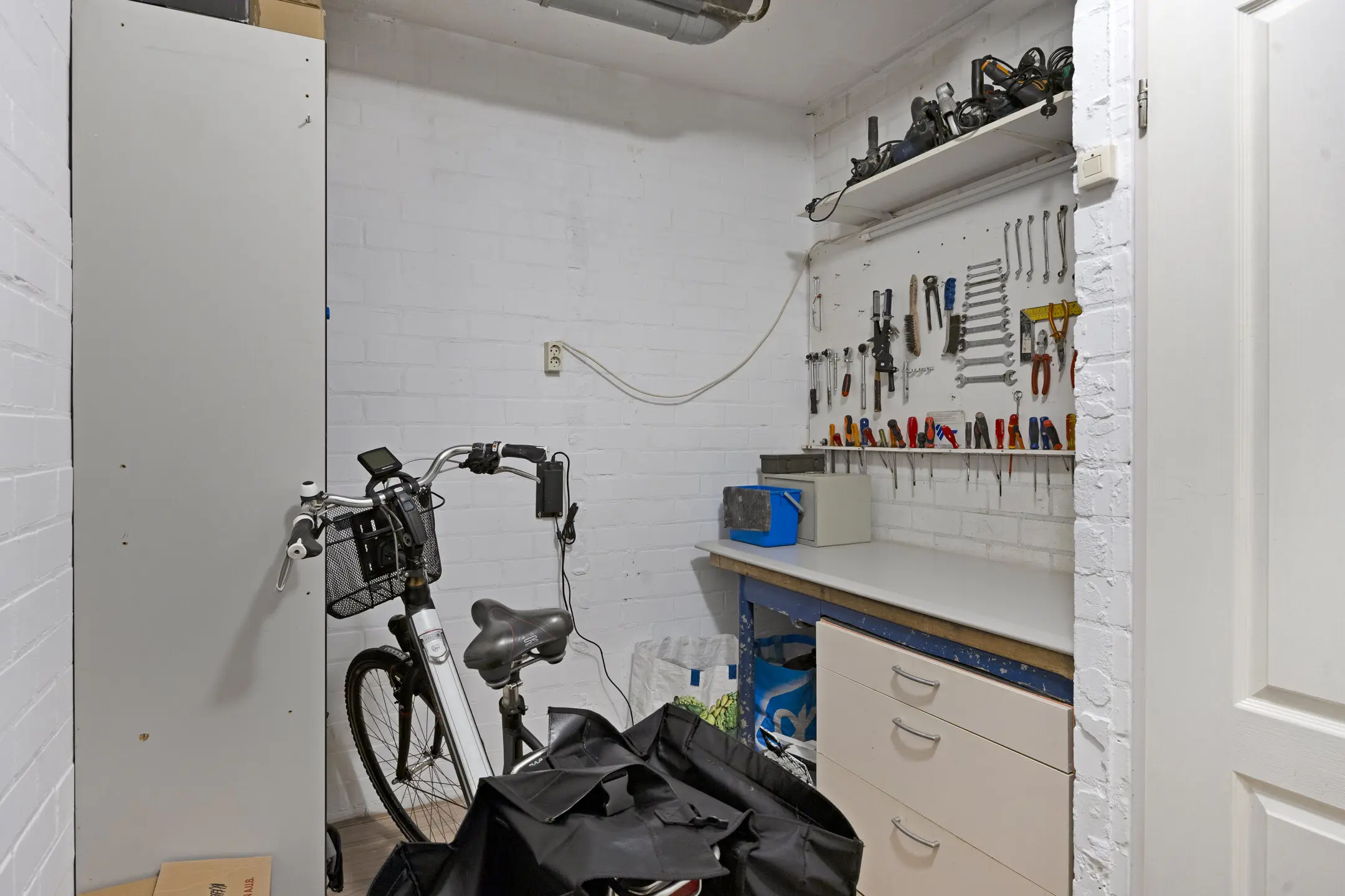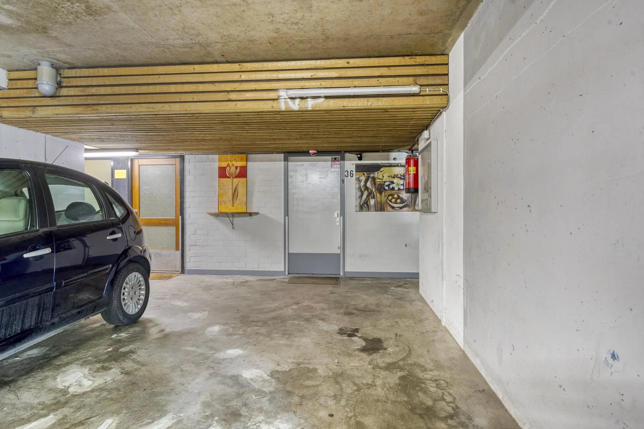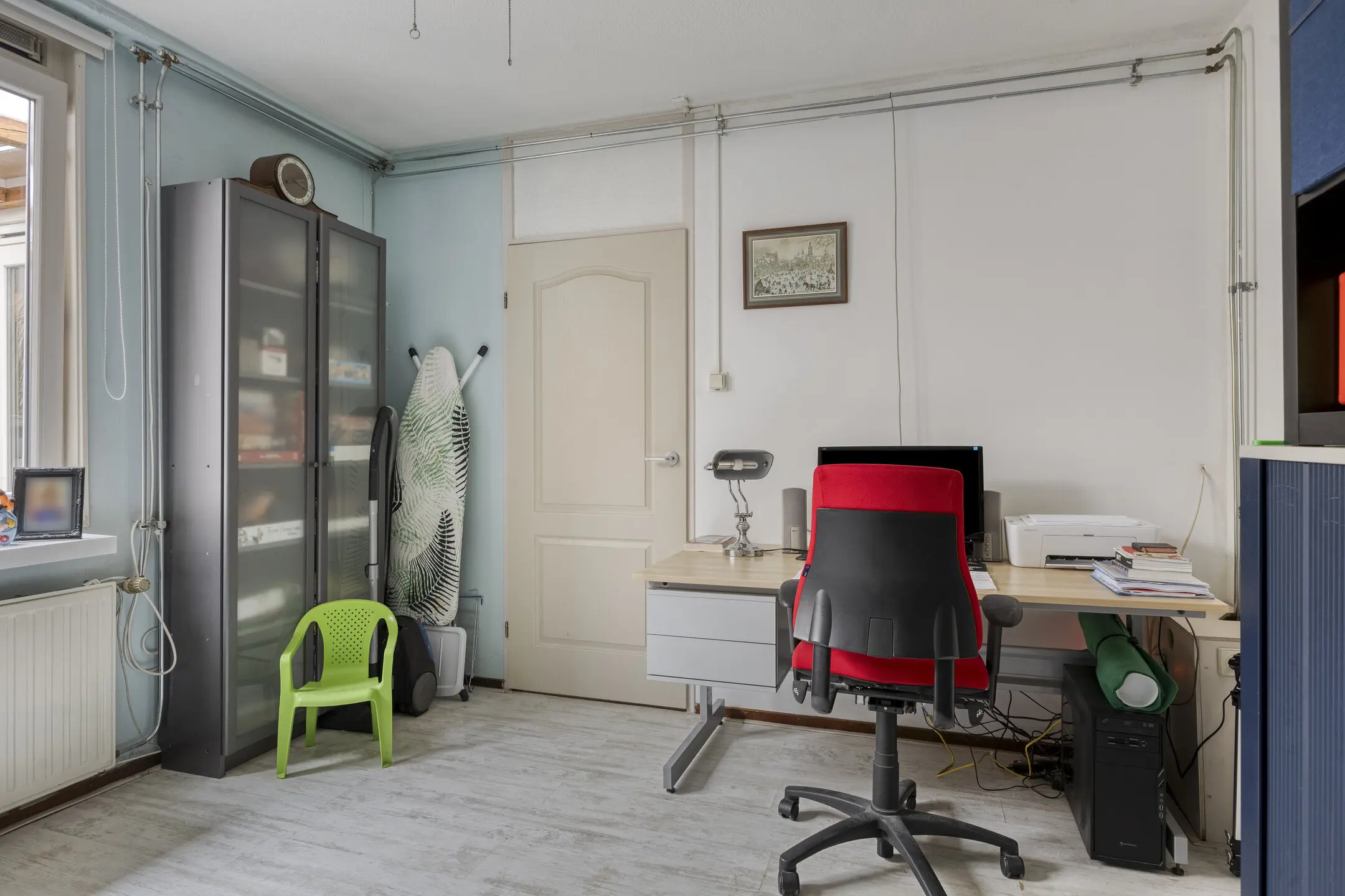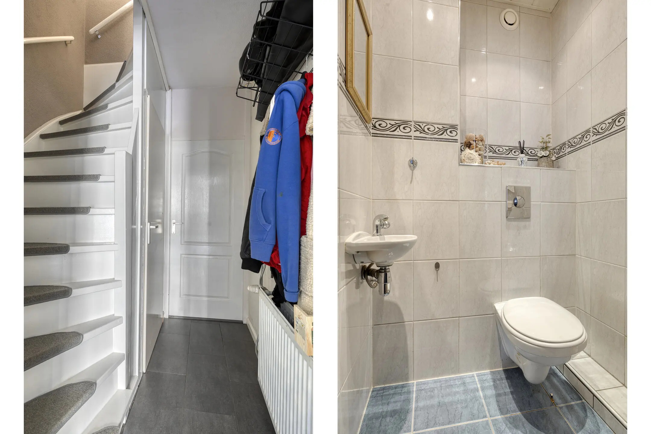 De parkeergarage is afgesloten met een elektrische deur met afstandsbediening. Vanaf de eigen parkeerplaats is er toegang via de berging naar de hal. In de hal is een praktische trapkast, de trapopgang en een deur naar de ruime werk-/slaapkamer aan de voorzijde van het huis met eigen entreedeur en klein terrasje.