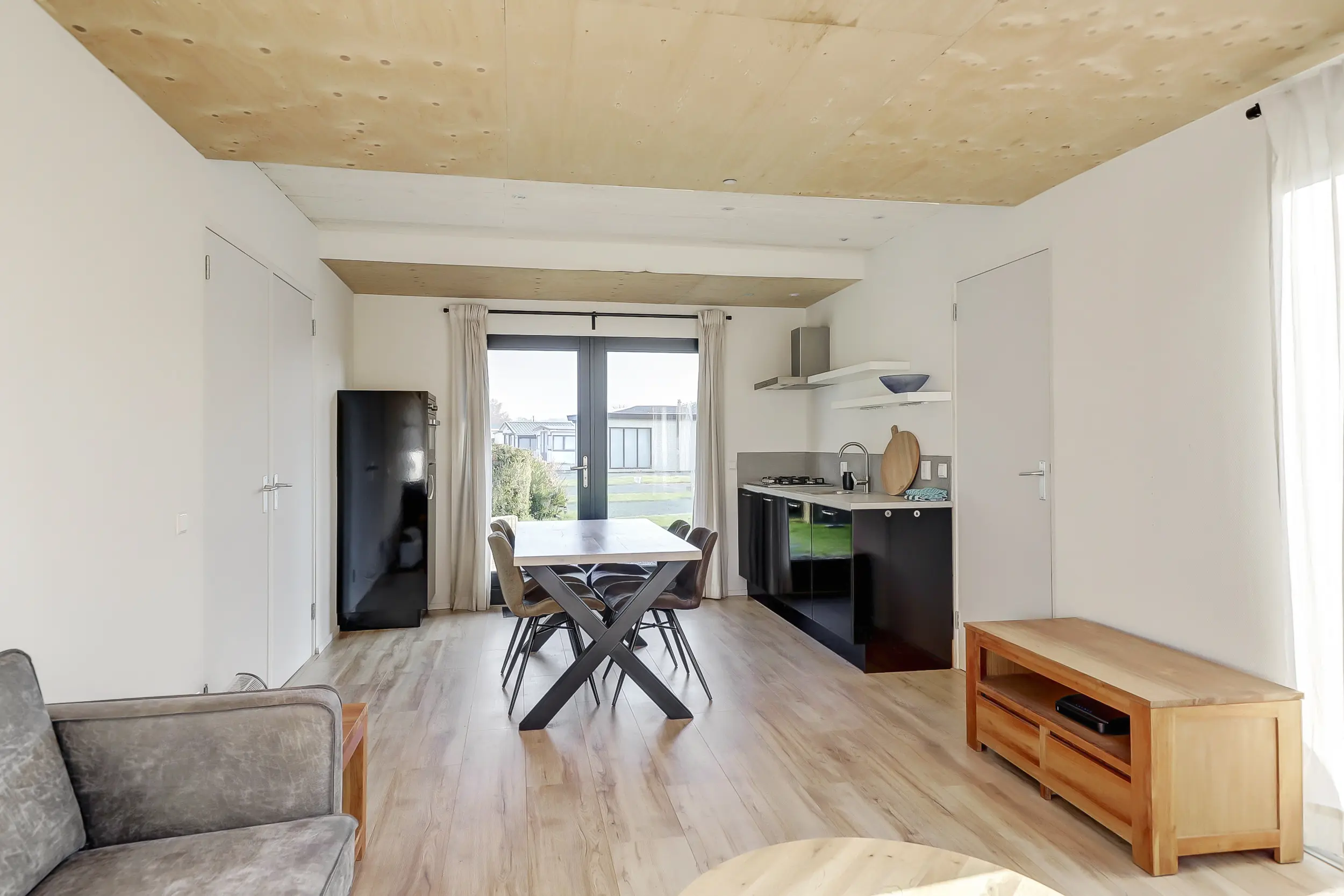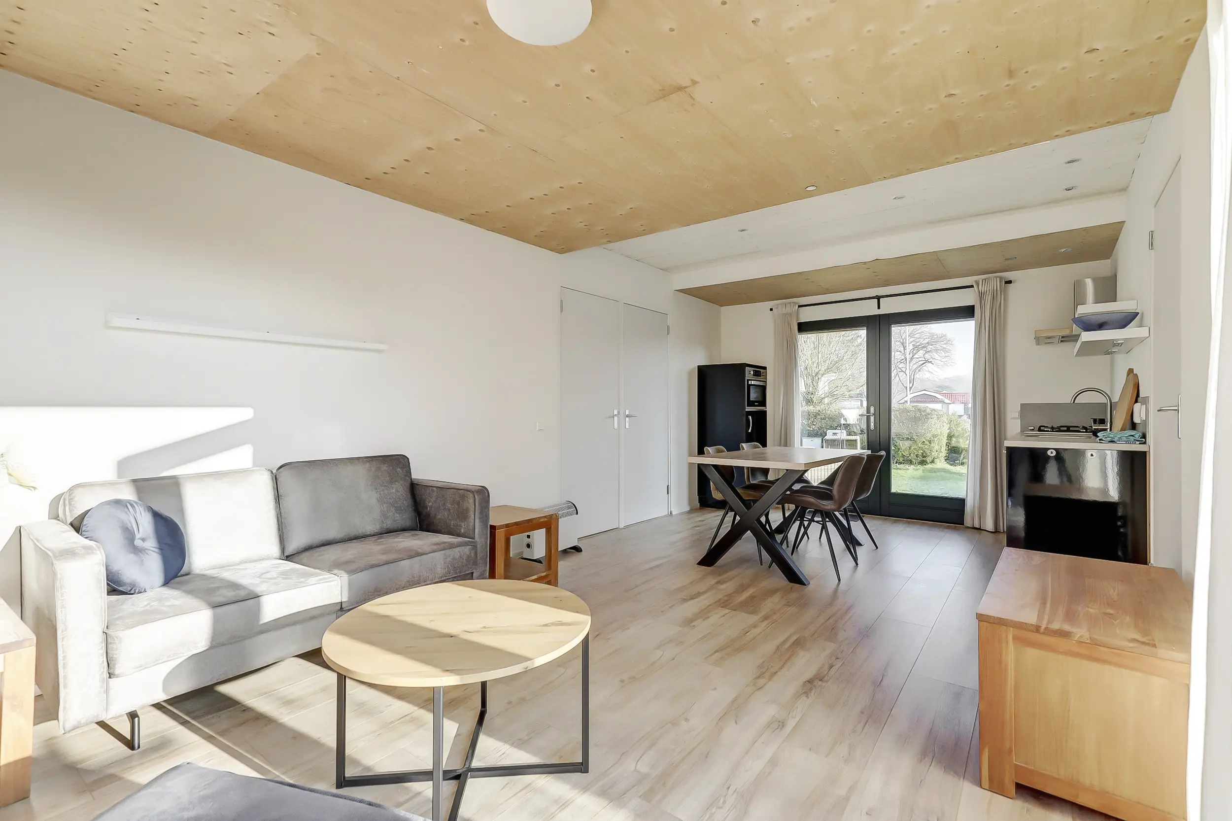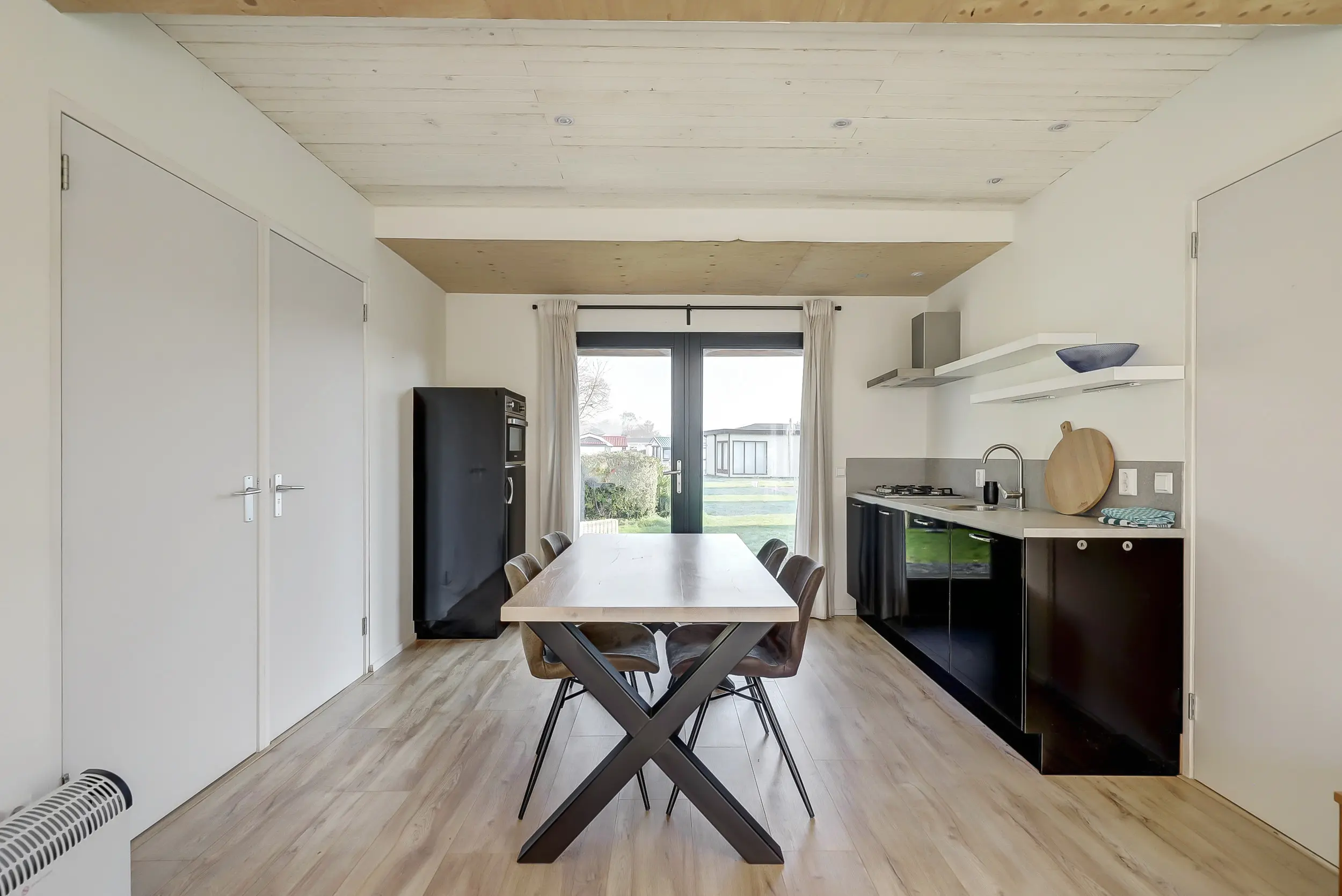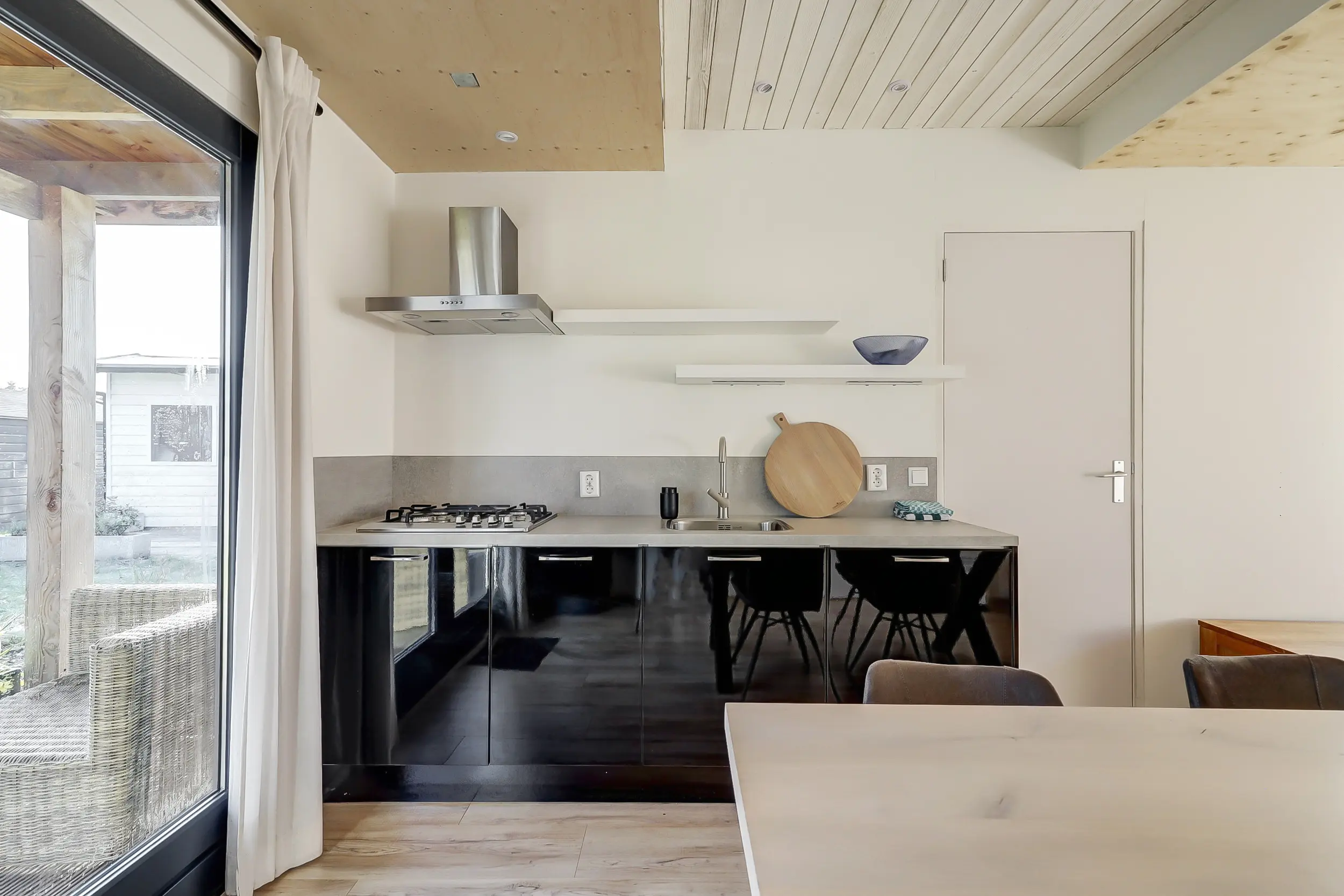 Je komt binnen in de open keuken door de dubbele deuren vanaf een houten terras met overkapping. De open keuken is ingericht met een mooie keuken welke is voorzien van inbouwapparatuur zoals een 4-pits gasvoorziening met afzuigkap, combi-oven en een grote koelkast. Een fijne eethoek biedt plaats aan 4 personen. De lichte woonkamer met een moderne zithoek grenst aan een tweede terras met ook hier weer dubbele tuindeuren. Dit maakt dat aan beide zijden van het huis een fijne buitenruimte is waar je kunt genieten op deze fijne plek. In het huis zijn 2 slaapkamers, waarvan 1 kamer is ingericht met een tweepersoonsbed en een zitje en de andere slaapkamer is ingericht met een éénpersoonsbed. De badkamer is modern en praktisch. Deze is voorzien van een douchecabine, hangend toilet en een wastafelmeubel. Vanaf hier kun je de bergzolder bereiken.