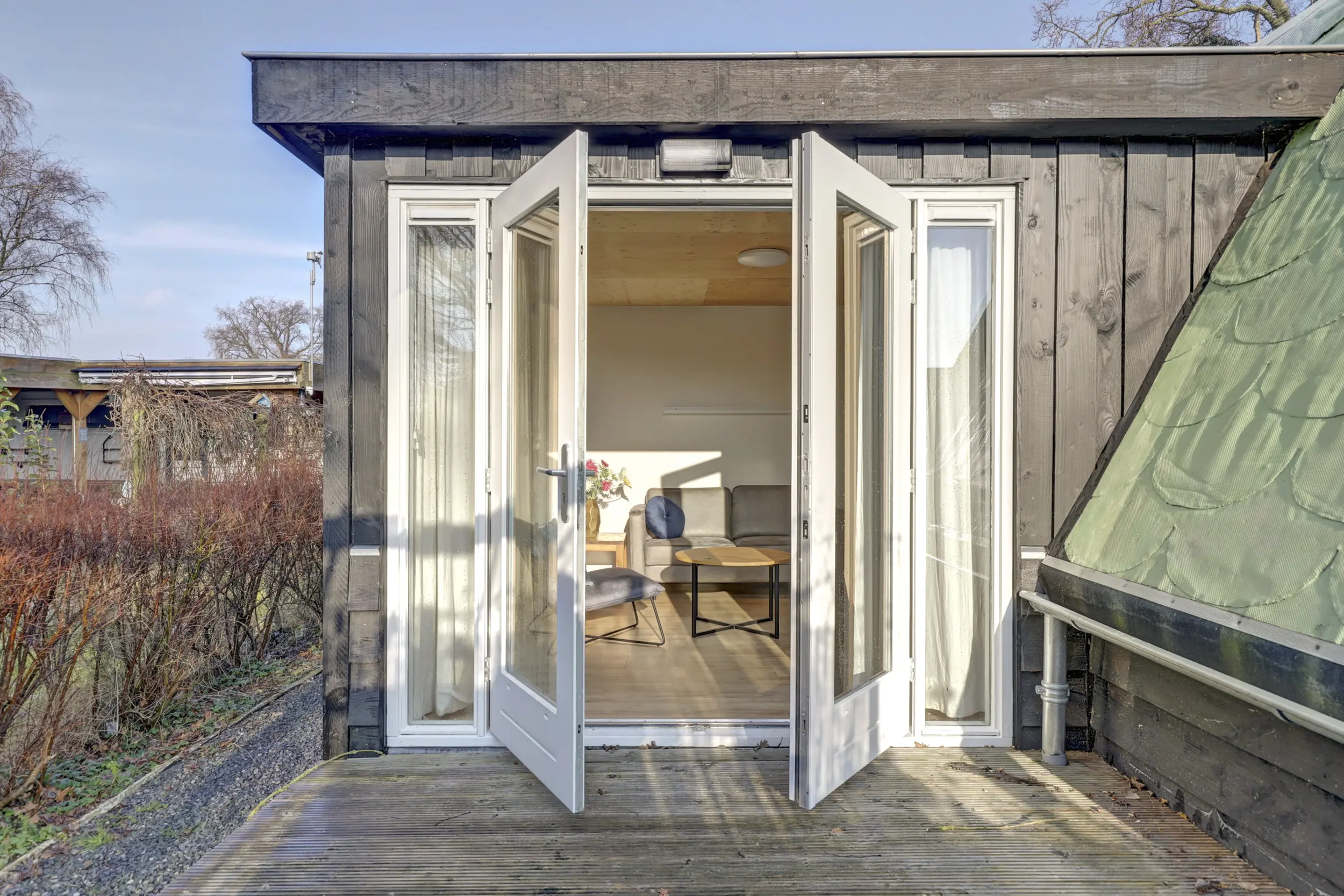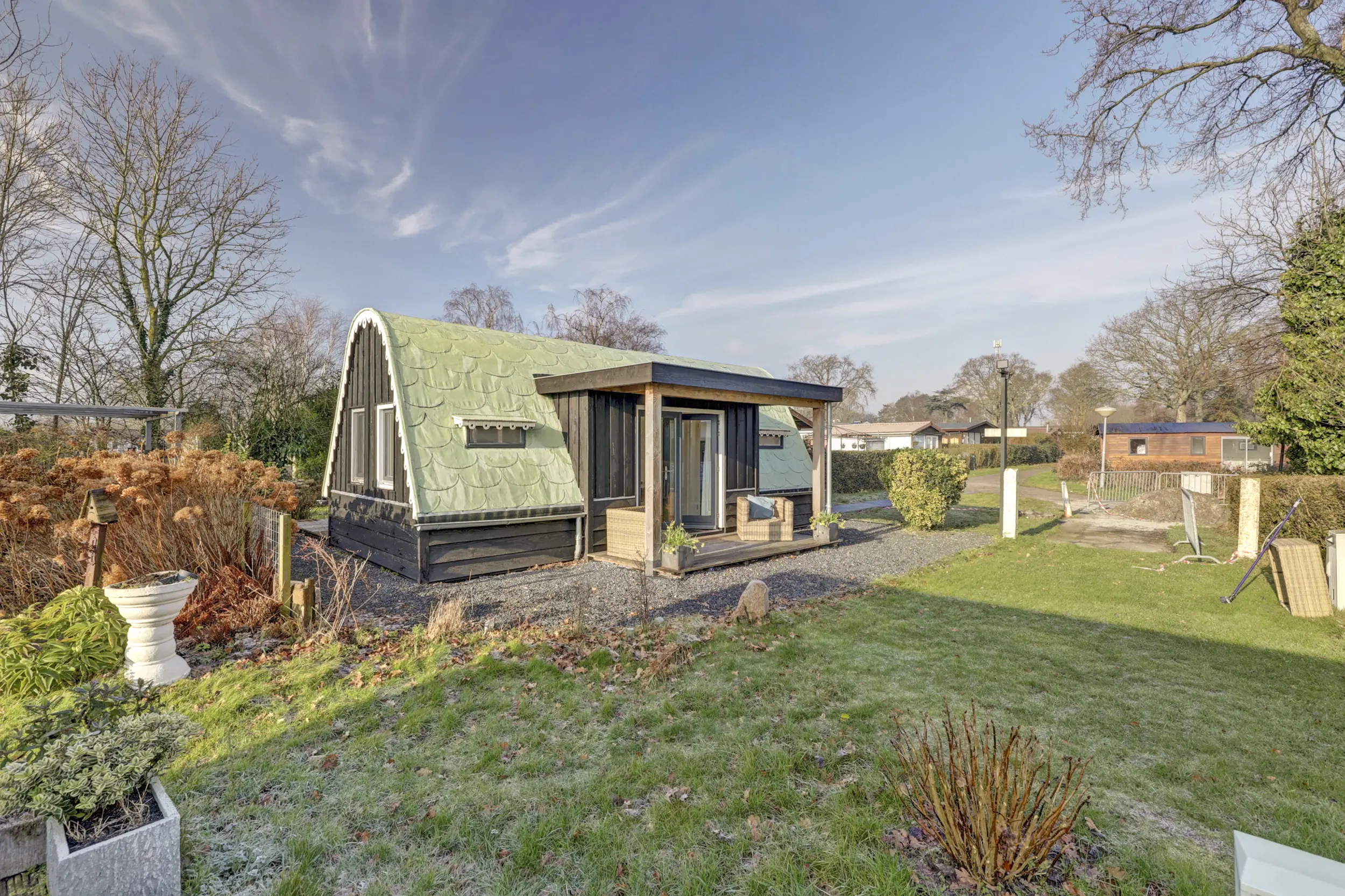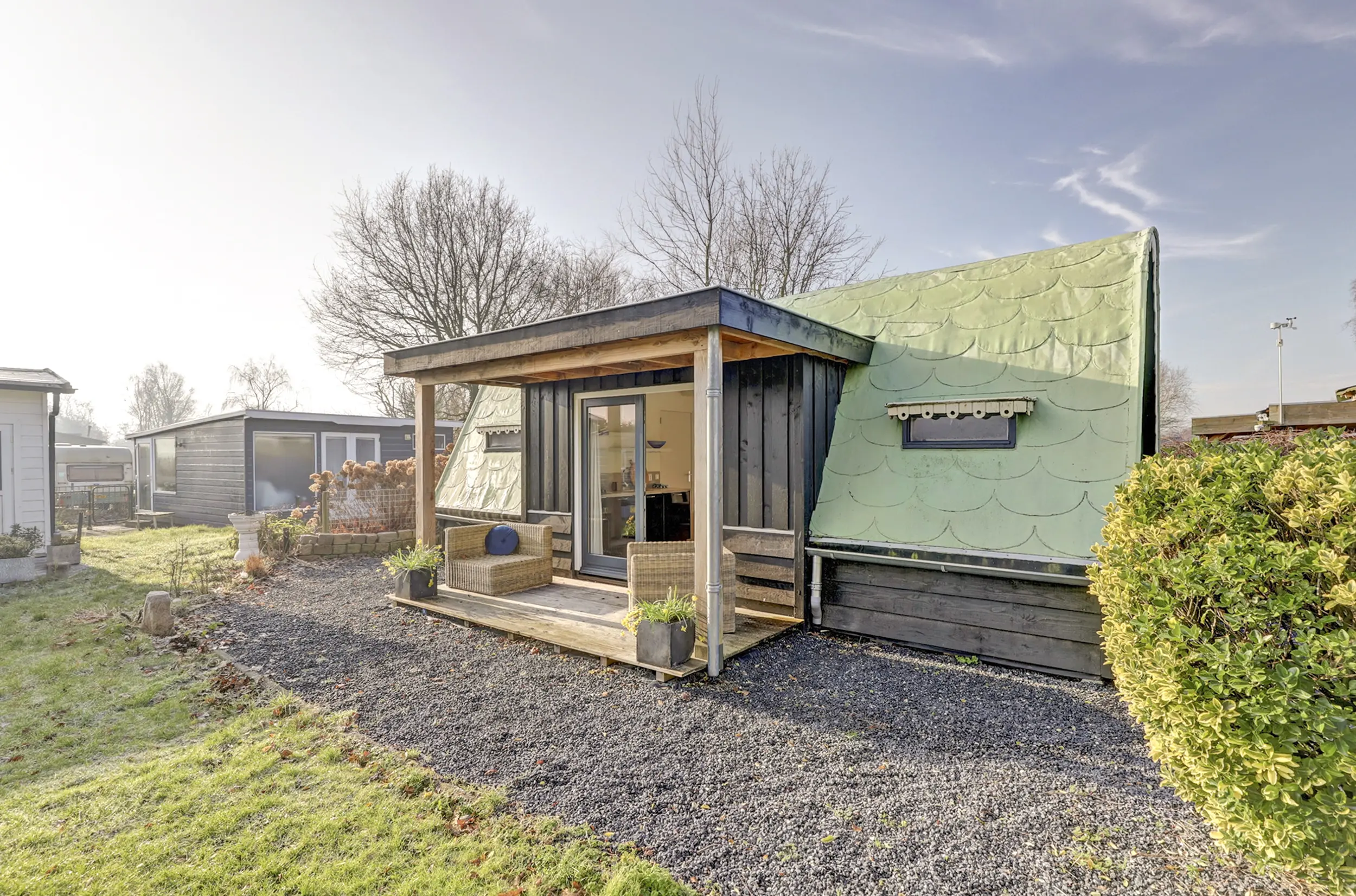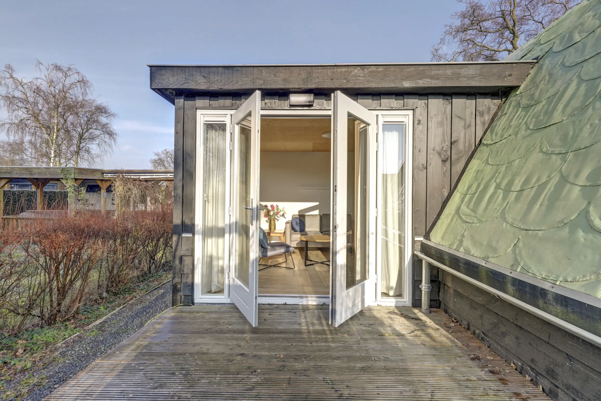 Je komt binnen in de open keuken door de dubbele deuren vanaf een houten terras met overkapping. De open keuken is ingericht met een mooie keuken welke is voorzien van inbouwapparatuur zoals een 4-pits gasvoorziening met afzuigkap, combi-oven en een grote koelkast. Een fijne eethoek biedt plaats aan 4 personen. De lichte woonkamer met een moderne zithoek grenst aan een tweede terras met ook hier weer dubbele tuindeuren. Dit maakt dat aan beide zijden van het huis een fijne buitenruimte is waar je kunt genieten op deze fijne plek. In het huis zijn 2 slaapkamers, waarvan 1 kamer is ingericht met een tweepersoonsbed en een zitje en de andere slaapkamer is ingericht met een éénpersoonsbed. De badkamer is modern en praktisch. Deze is voorzien van een douchecabine, hangend toilet en een wastafelmeubel. Vanaf hier kun je de bergzolder bereiken.