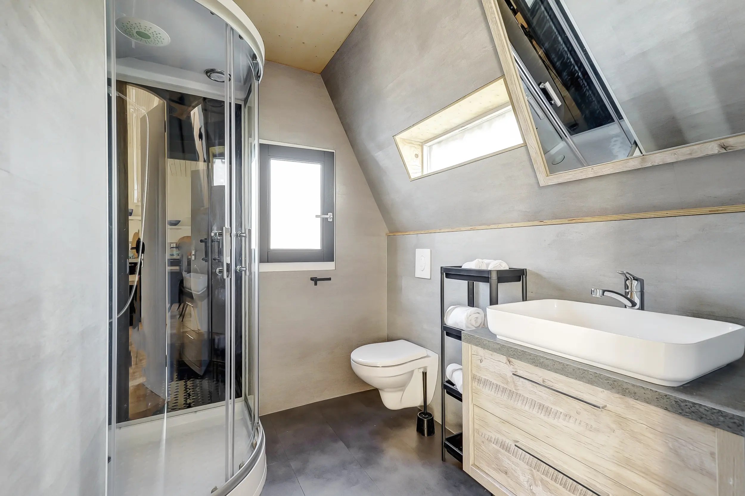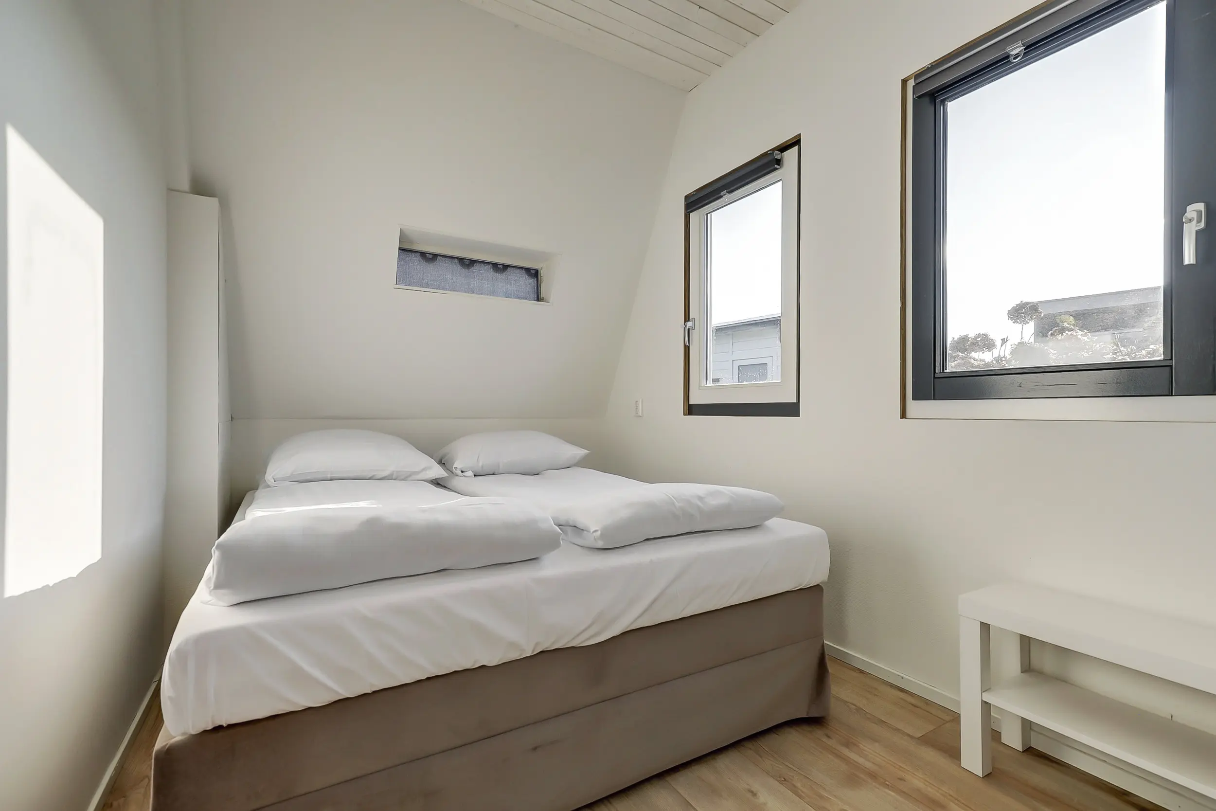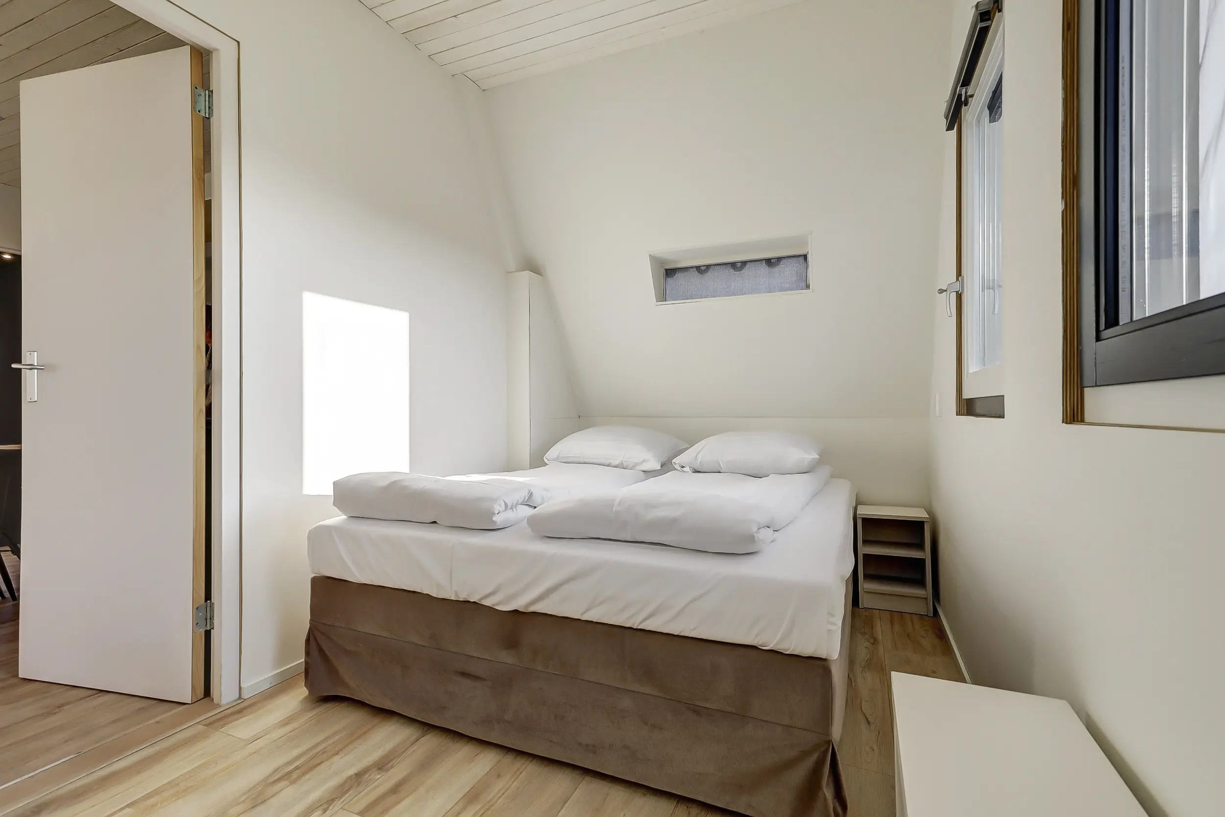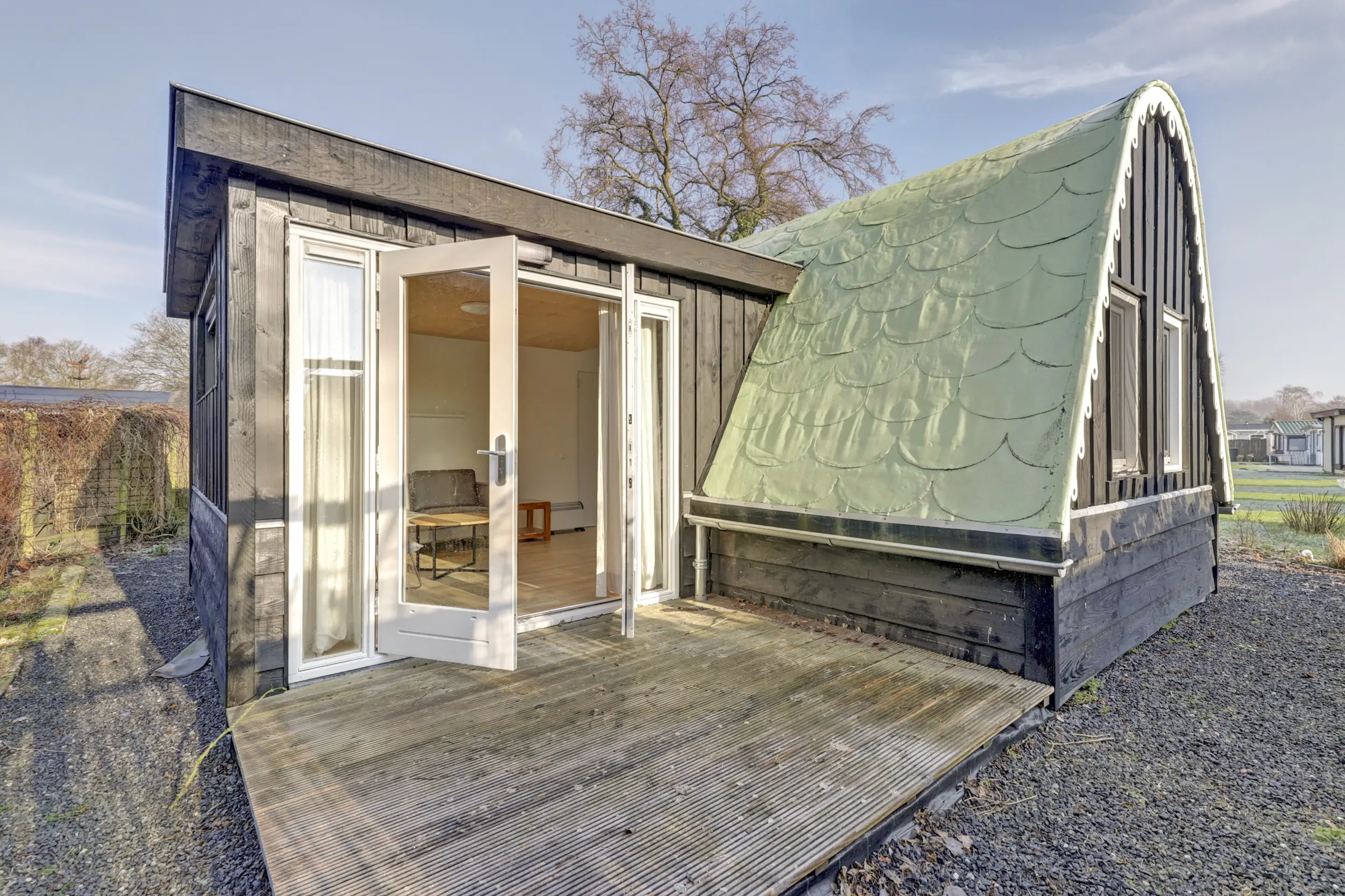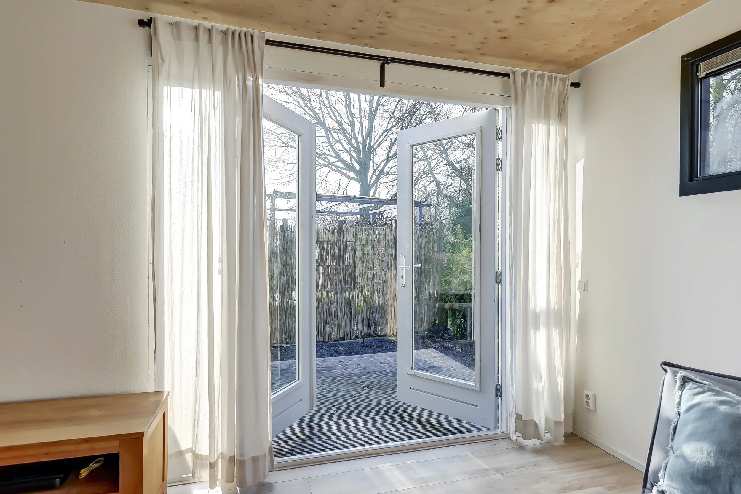 Je komt binnen in de open keuken door de dubbele deuren vanaf een houten terras met overkapping. De open keuken is ingericht met een mooie keuken welke is voorzien van inbouwapparatuur zoals een 4-pits gasvoorziening met afzuigkap, combi-oven en een grote koelkast. Een fijne eethoek biedt plaats aan 4 personen. De lichte woonkamer met een moderne zithoek grenst aan een tweede terras met ook hier weer dubbele tuindeuren. Dit maakt dat aan beide zijden van het huis een fijne buitenruimte is waar je kunt genieten op deze fijne plek. In het huis zijn 2 slaapkamers, waarvan 1 kamer is ingericht met een tweepersoonsbed en een zitje en de andere slaapkamer is ingericht met een éénpersoonsbed. De badkamer is modern en praktisch. Deze is voorzien van een douchecabine, hangend toilet en een wastafelmeubel. Vanaf hier kun je de bergzolder bereiken.
