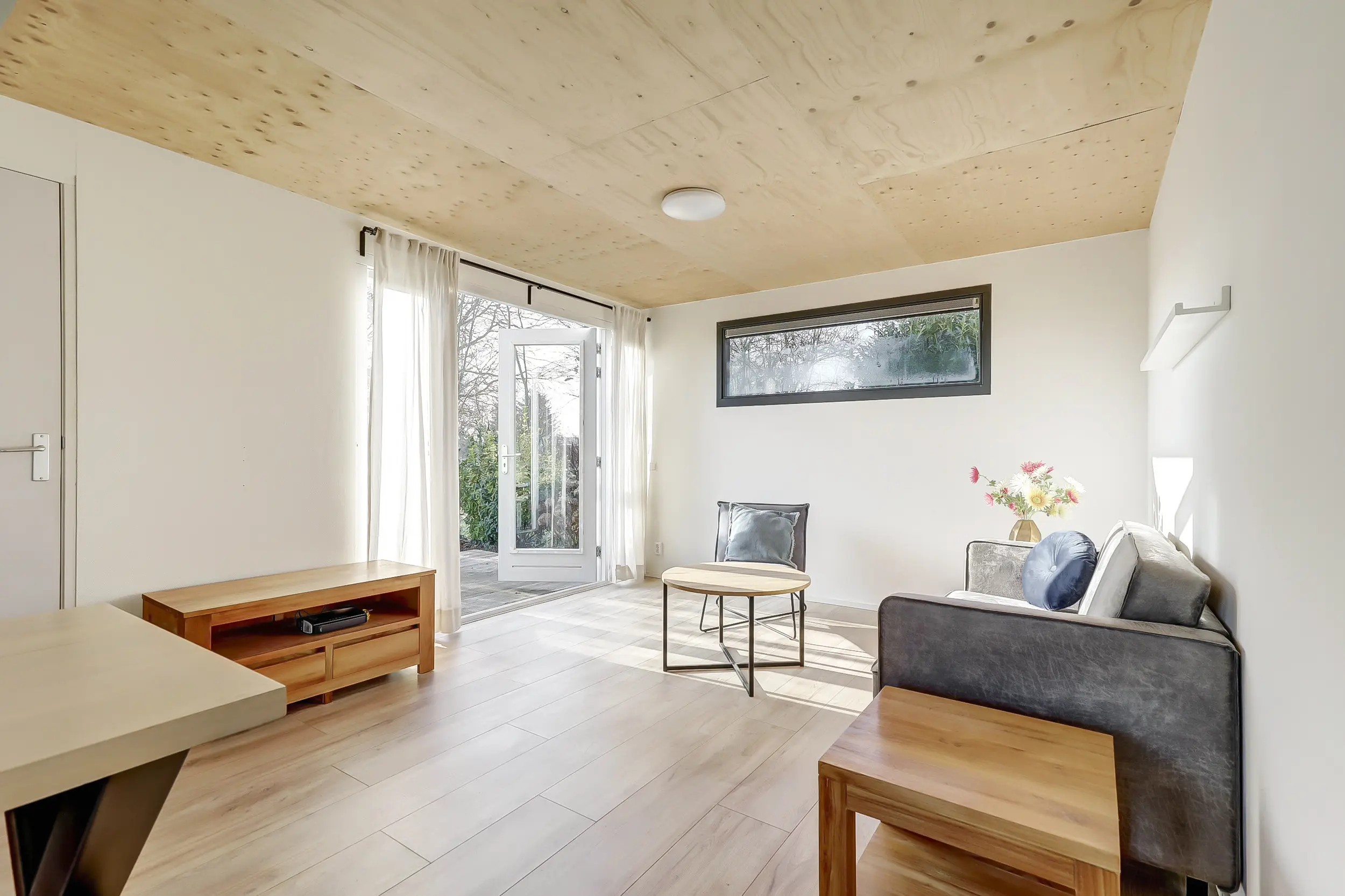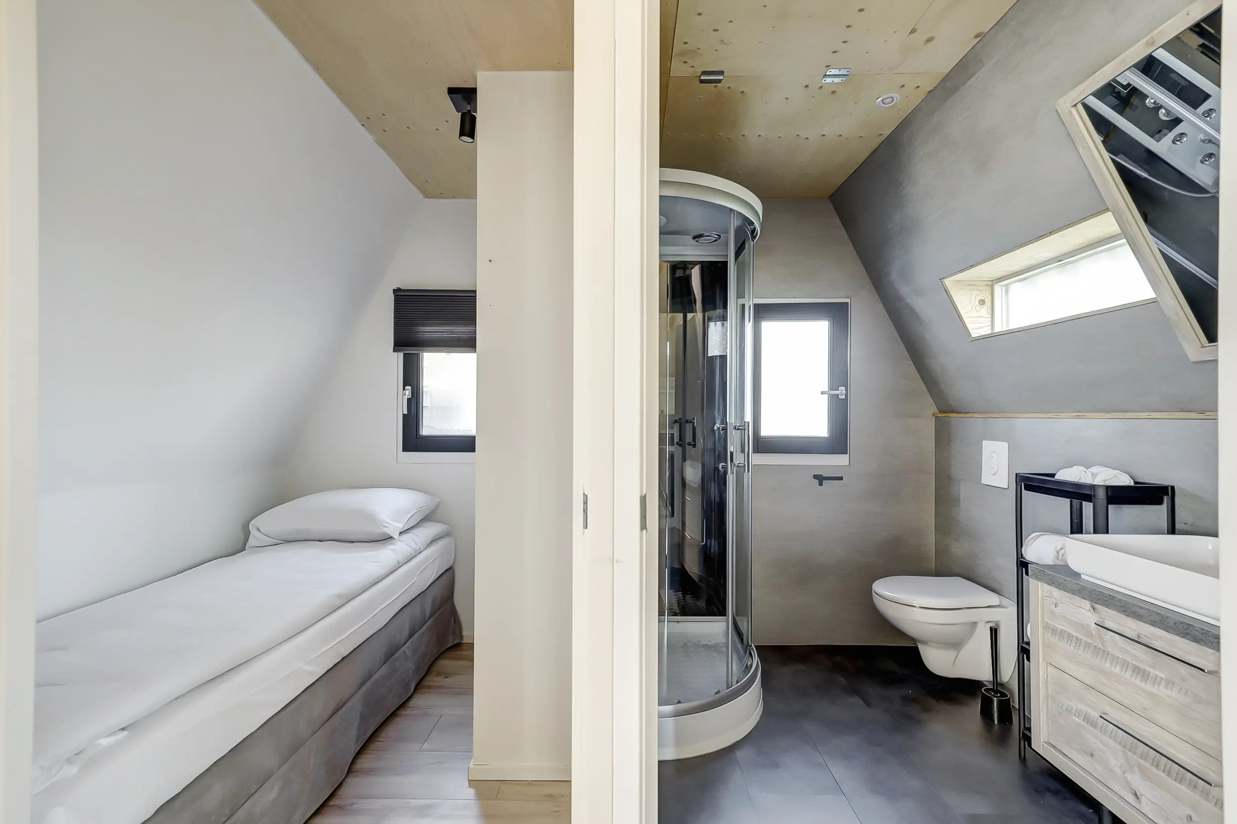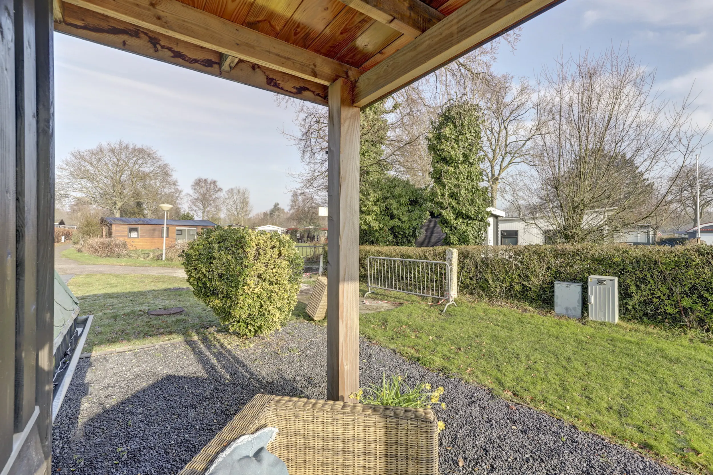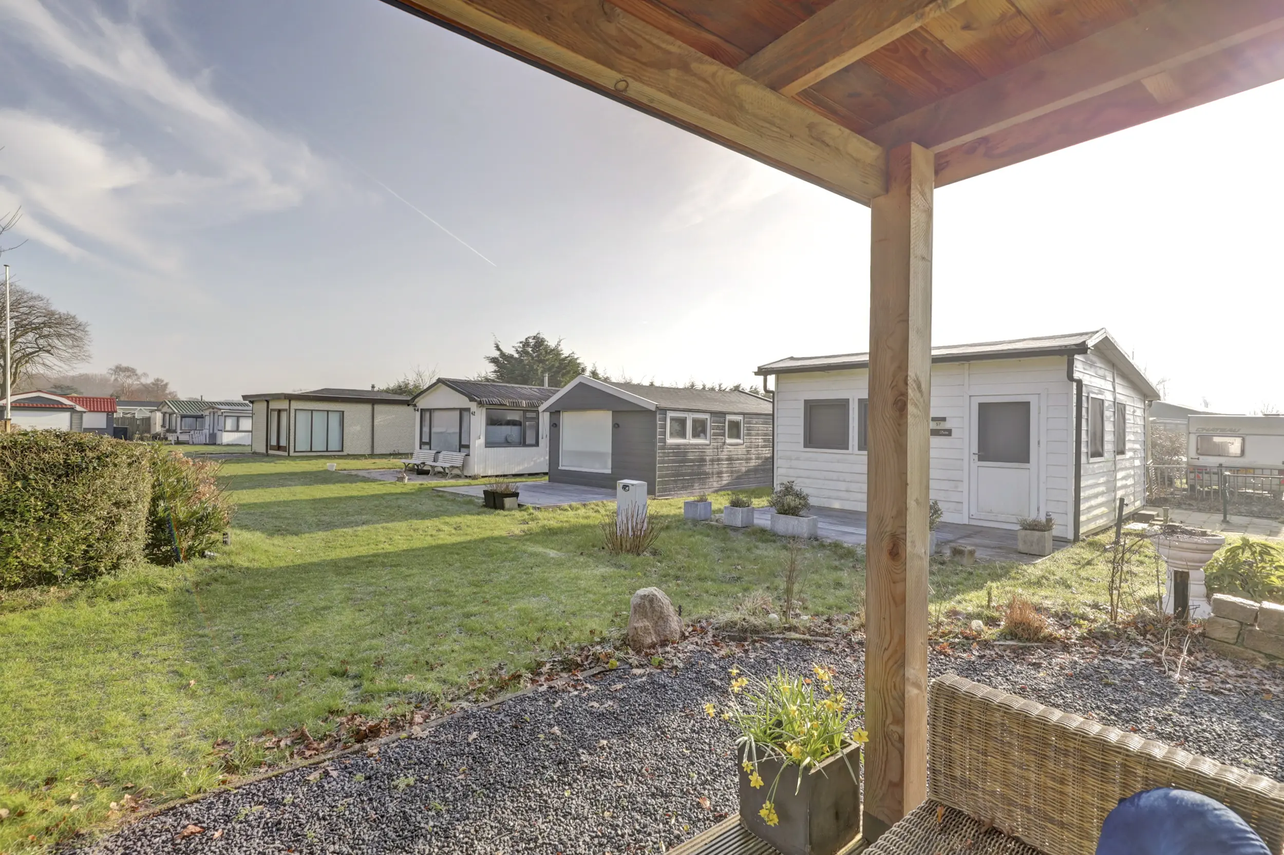 Je komt binnen in de open keuken door de dubbele deuren vanaf een houten terras met overkapping. De open keuken is ingericht met een mooie keuken welke is voorzien van inbouwapparatuur zoals een 4-pits gasvoorziening met afzuigkap, combi-oven en een grote koelkast. Een fijne eethoek biedt plaats aan 4 personen. De lichte woonkamer met een moderne zithoek grenst aan een tweede terras met ook hier weer dubbele tuindeuren. Dit maakt dat aan beide zijden van het huis een fijne buitenruimte is waar je kunt genieten op deze fijne plek. In het huis zijn 2 slaapkamers, waarvan 1 kamer is ingericht met een tweepersoonsbed en een zitje en de andere slaapkamer is ingericht met een éénpersoonsbed. De badkamer is modern en praktisch. Deze is voorzien van een douchecabine, hangend toilet en een wastafelmeubel. Vanaf hier kun je de bergzolder bereiken.