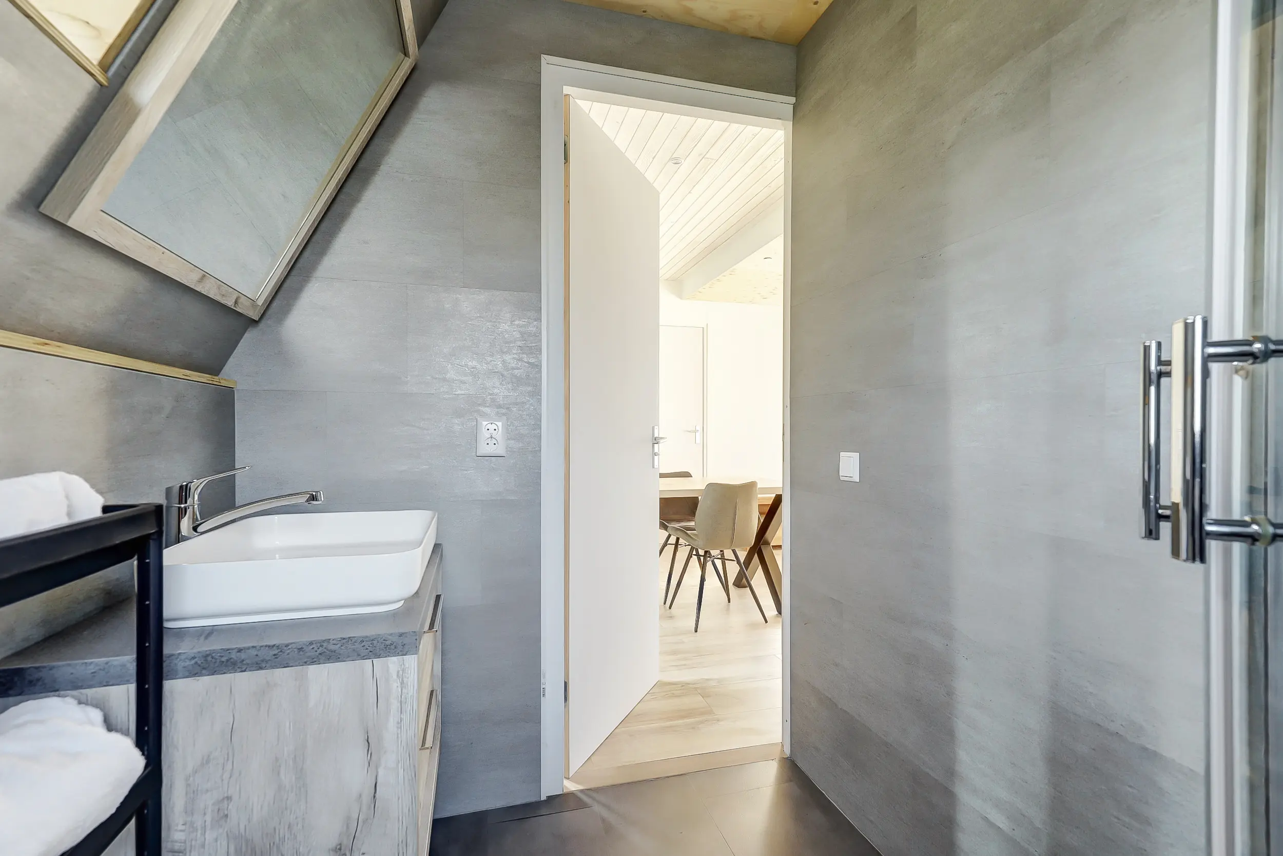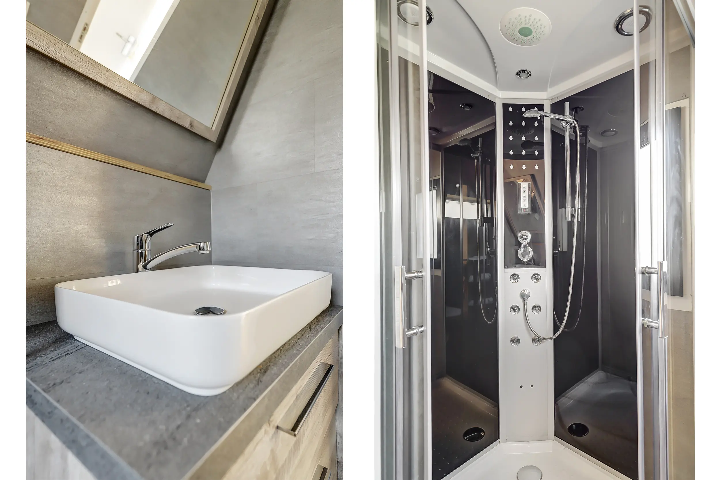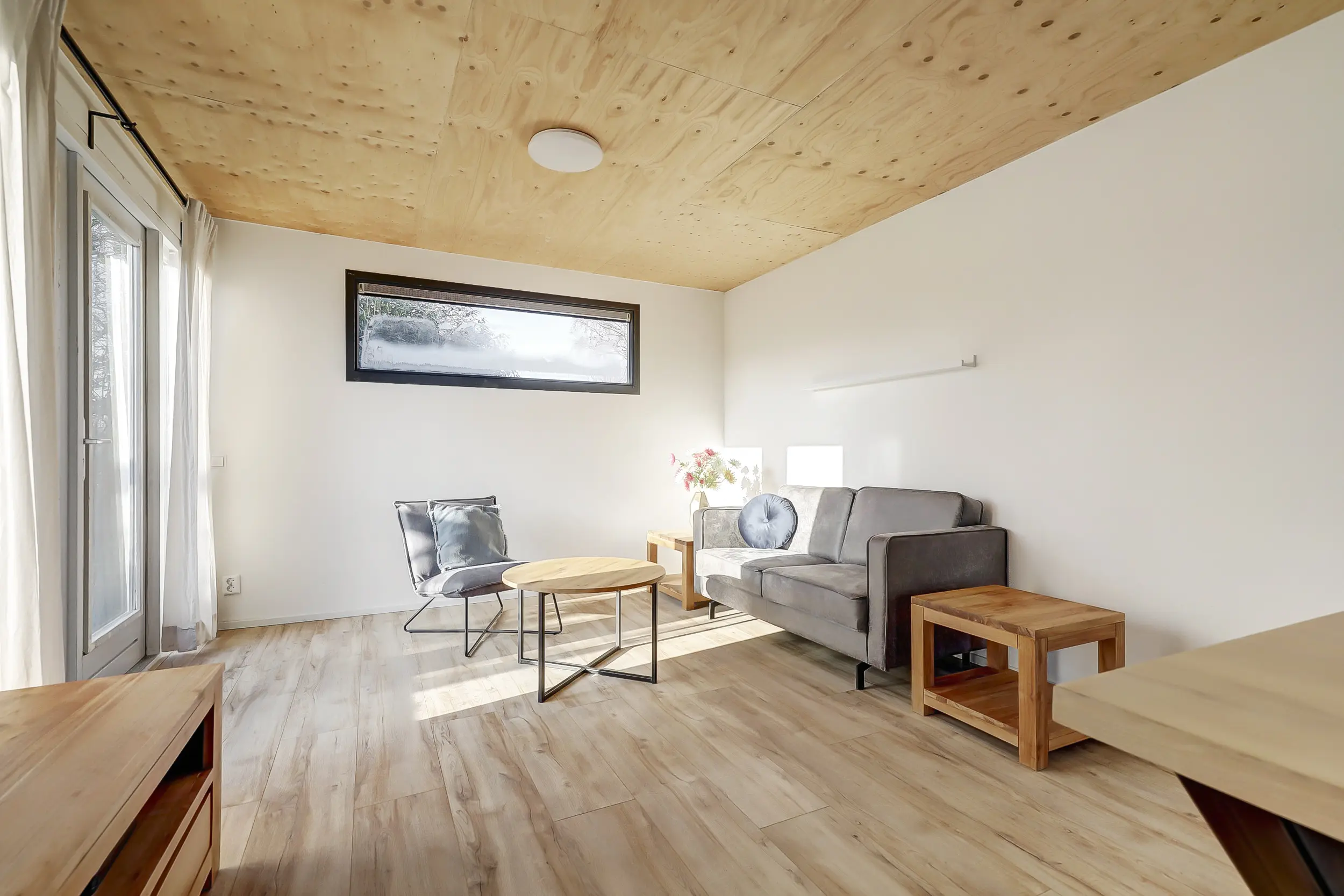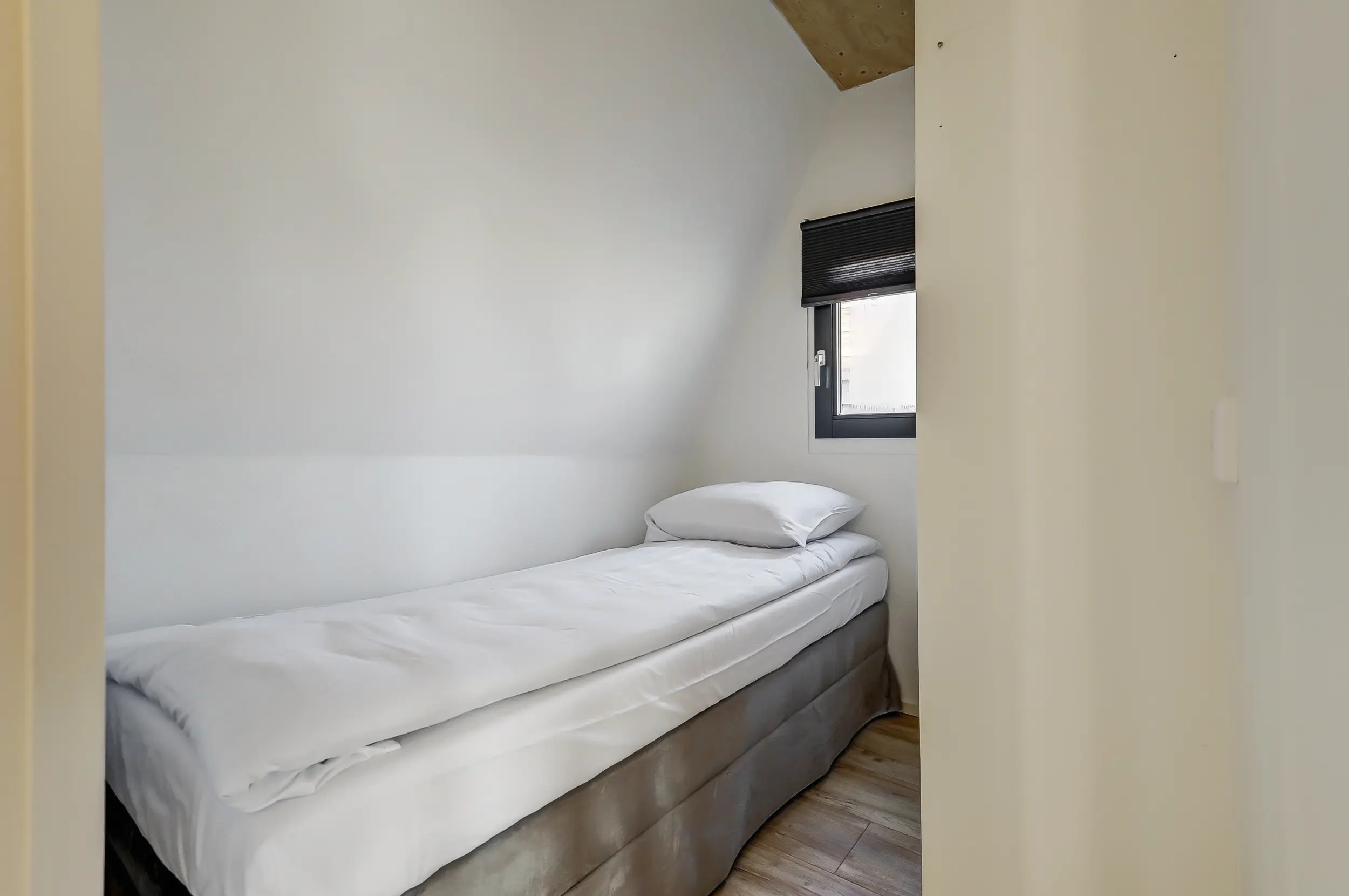 Je komt binnen in de open keuken door de dubbele deuren vanaf een houten terras met overkapping. De open keuken is ingericht met een mooie keuken welke is voorzien van inbouwapparatuur zoals een 4-pits gasvoorziening met afzuigkap, combi-oven en een grote koelkast. Een fijne eethoek biedt plaats aan 4 personen. De lichte woonkamer met een moderne zithoek grenst aan een tweede terras met ook hier weer dubbele tuindeuren. Dit maakt dat aan beide zijden van het huis een fijne buitenruimte is waar je kunt genieten op deze fijne plek. In het huis zijn 2 slaapkamers, waarvan 1 kamer is ingericht met een tweepersoonsbed en een zitje en de andere slaapkamer is ingericht met een éénpersoonsbed. De badkamer is modern en praktisch. Deze is voorzien van een douchecabine, hangend toilet en een wastafelmeubel. Vanaf hier kun je de bergzolder bereiken.