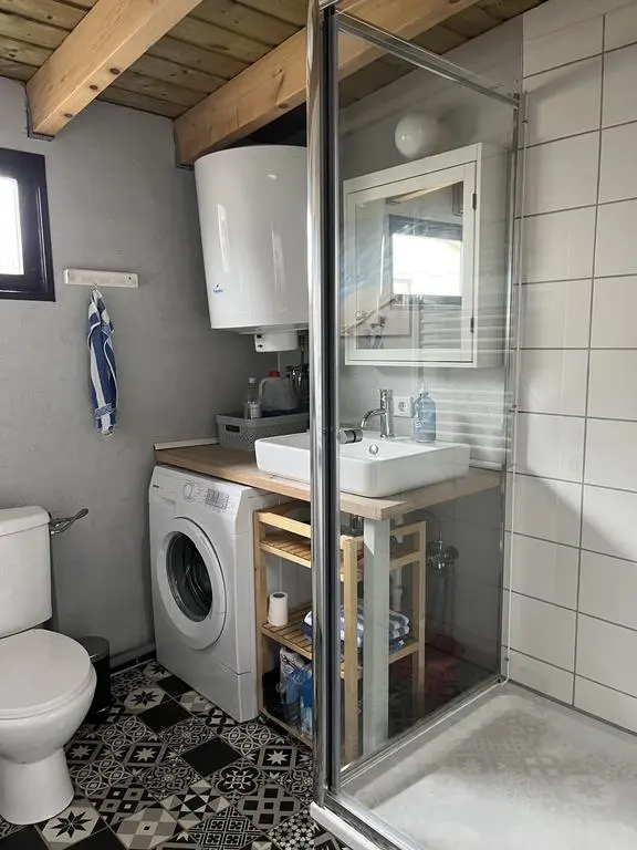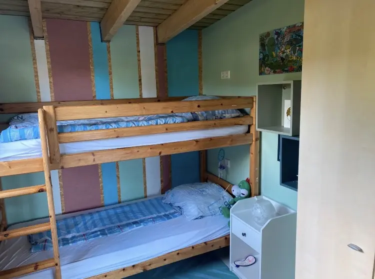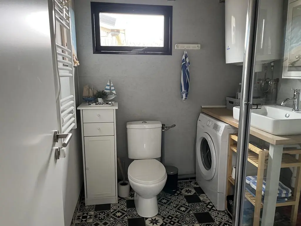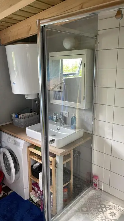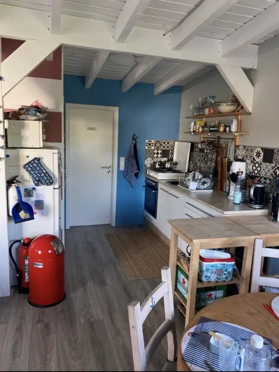Via de openslaande deuren komt u in de woonkamer met laminaatvloer en gashaard. Door de vele ramen in de woonkamer is deze ruimte fijn licht. De keuken is open en voorzien van (inbouw-)apparatuur als 4 – pits gaskookplaat, koelkast, magnetron en oven. De keuken is in rechte opstelling. Vanuit de keuken toegang tot de badkamer en ruime slaapkamer met 2-persoonsbed met kastruimte. De badkamer is uitgerust met een douchecabine, wastafelmeubel, toilet en designradiator. De wasmachine evenals de boiler is in de badkamer opgesteld. Vanuit de woonkamer is de 2e slaapkamer met een stapelbed en kastruimte bereikbaar.
