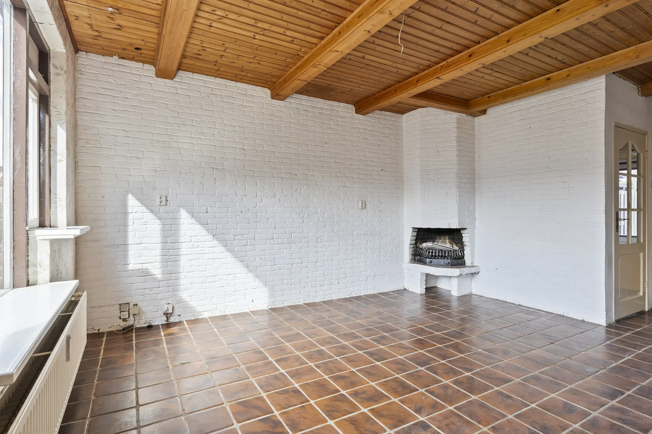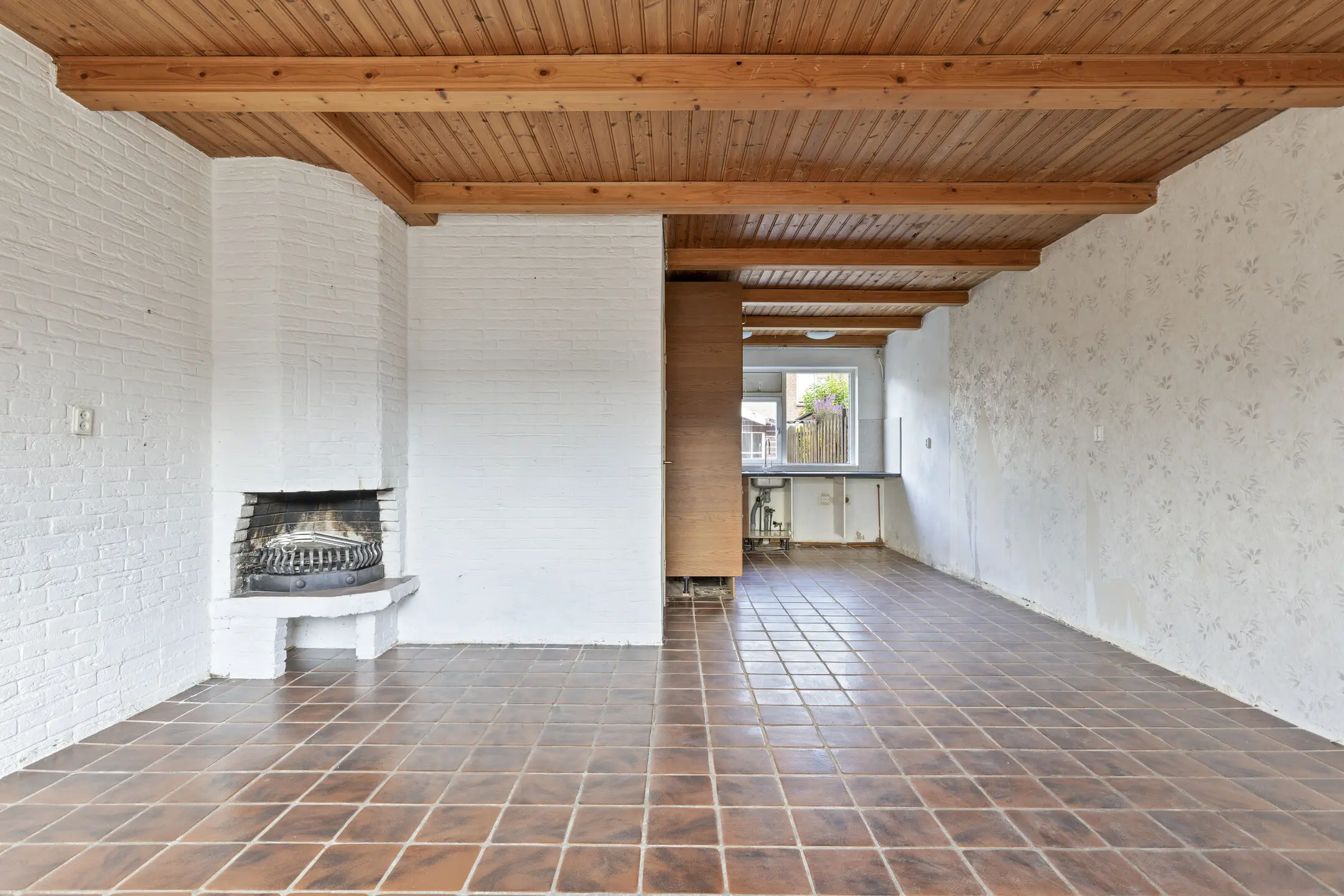 Entree via achterzijde met trapkast, trapopgang en geheel betegelde toiletruimte met fonteintje. Via een deur is de living bereikbaar. Deze bestaat uit een woonkamer aan de voorzijde met deur naar de voortuin en een sfeer volle open haard. In de woonkamer is ook de meterkast aanwezig. De keuken is in L-opstelling geplaatst aan de achterzijde van de woning. Deze is uitgerust met een keramische kookplaat, afzuigkap (met afvoer naar buiten), oven, spoelbak onder het raam en de aansluiting voor de wasmachine.
